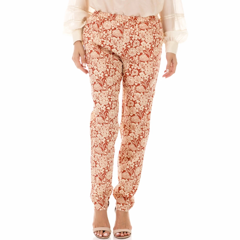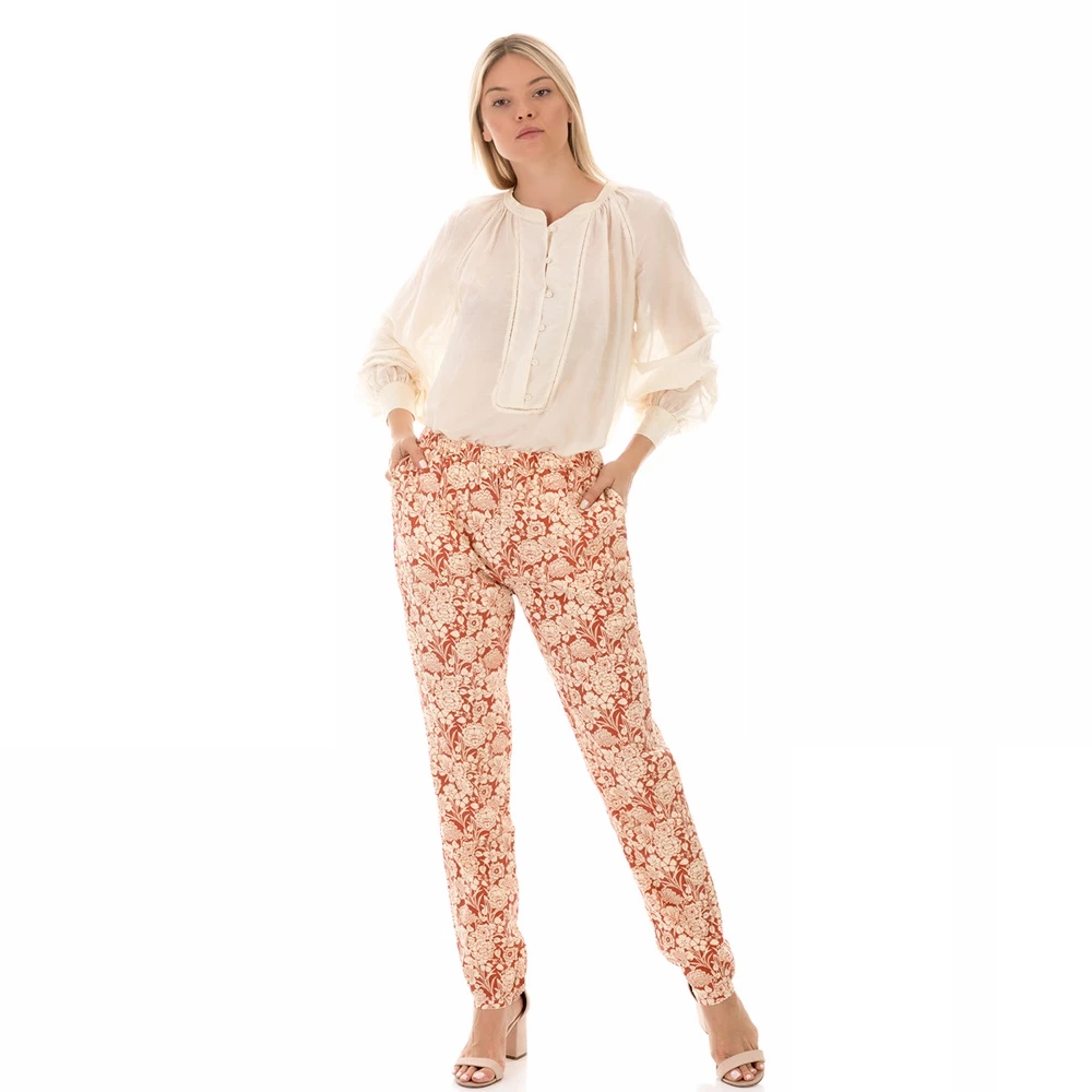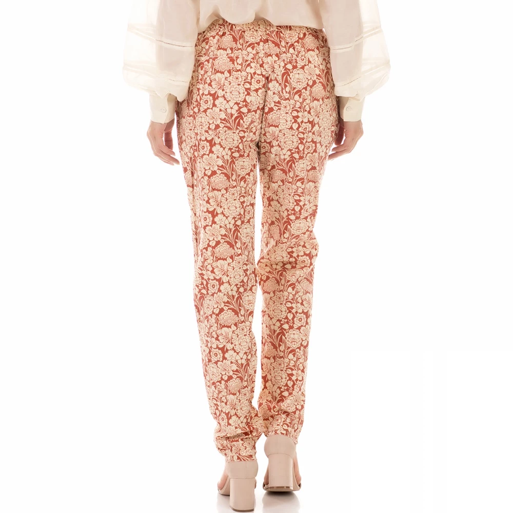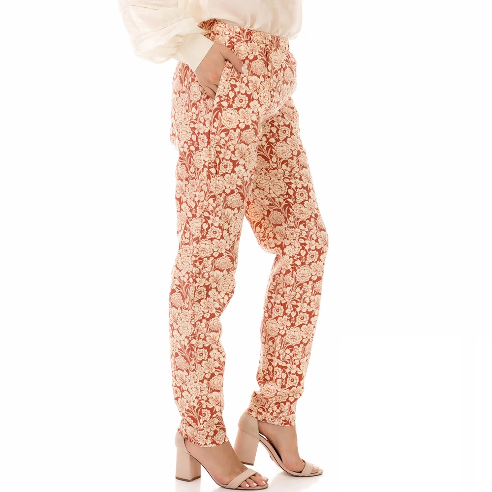 Γυναικείο παντελόνι AMERICAN VINTAGE με μπεζ εμπριμέ floral μοτίβο σε κόκκινο φόντο. Είναι σε ίσια γραμμή, με χαλαρή εφαρμογή. Βαμβακερή ύφανση με ανάλαφρη αίσθηση. Διαθέτει 2 τσέπες στα πλάγια και 2 τσέπες πίσω. Λάστιχο στην μέση για σταθερή εφαρμογή. Συνδυάστε το με flat σανδάλια γυρίζοντας ελαφρώς τα μπατζάκια.