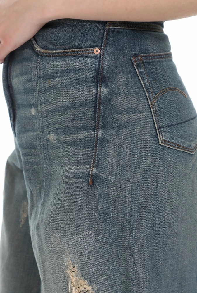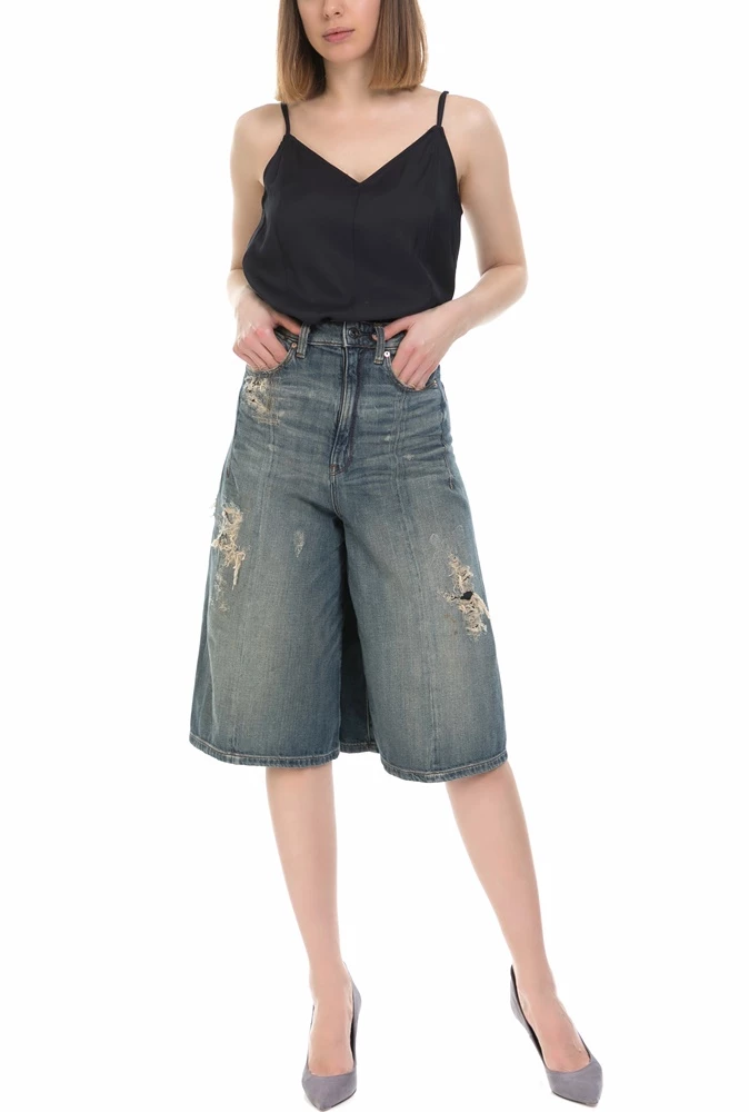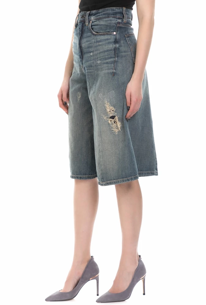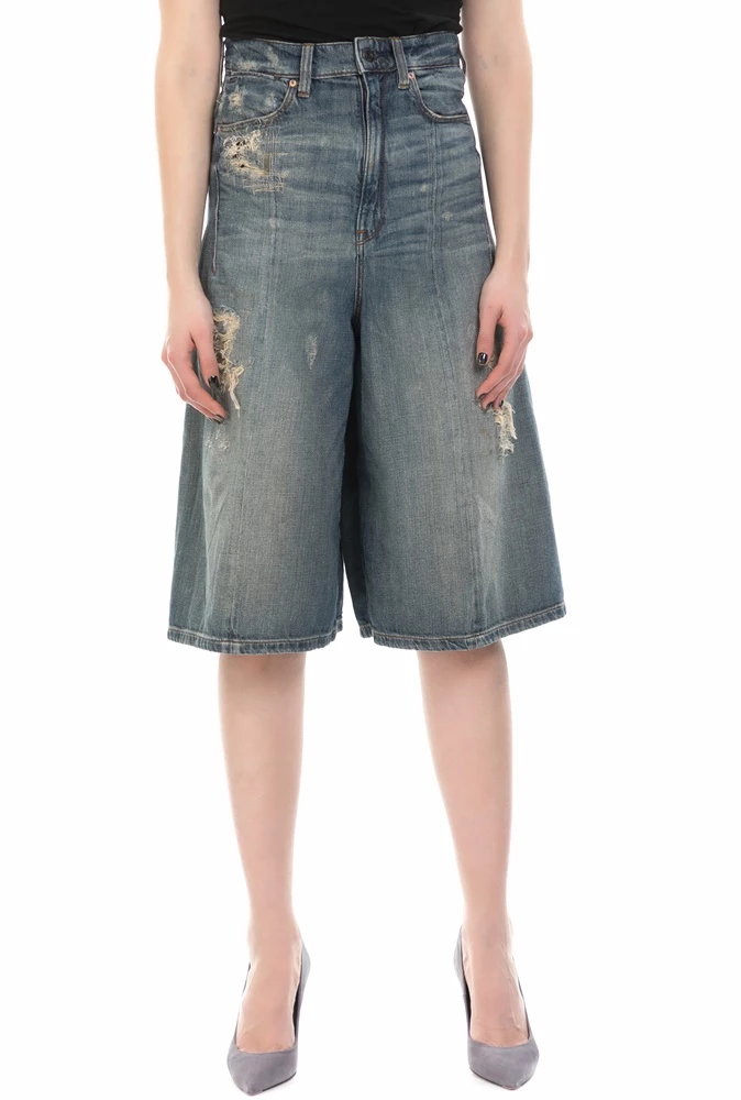 Γυναικεία τζιν ψηλόμεση βερμούδα G-Star σε μπλε χρώμα με σκισίματα και ξεβάμματα. Σε φαρδιά γραμμή και μέχρι το γόνατο.