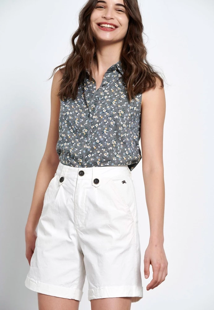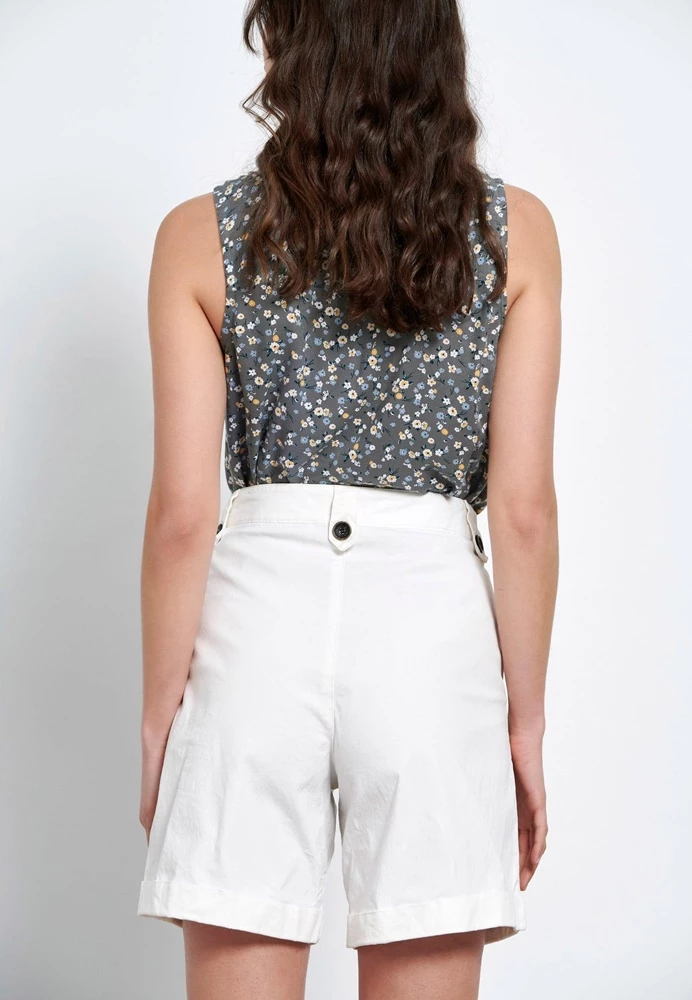 Γυναικεία chino βερμούδα FUNKY BUDDHA σε λευκό χρώμα. Είναι ψηλόμεση, με χαλαρή εφαμρογή. Διαθέτει δύο τσέπες στα πλάγια και κλείνει με φερμουάρ και κουμπί μπροστά.