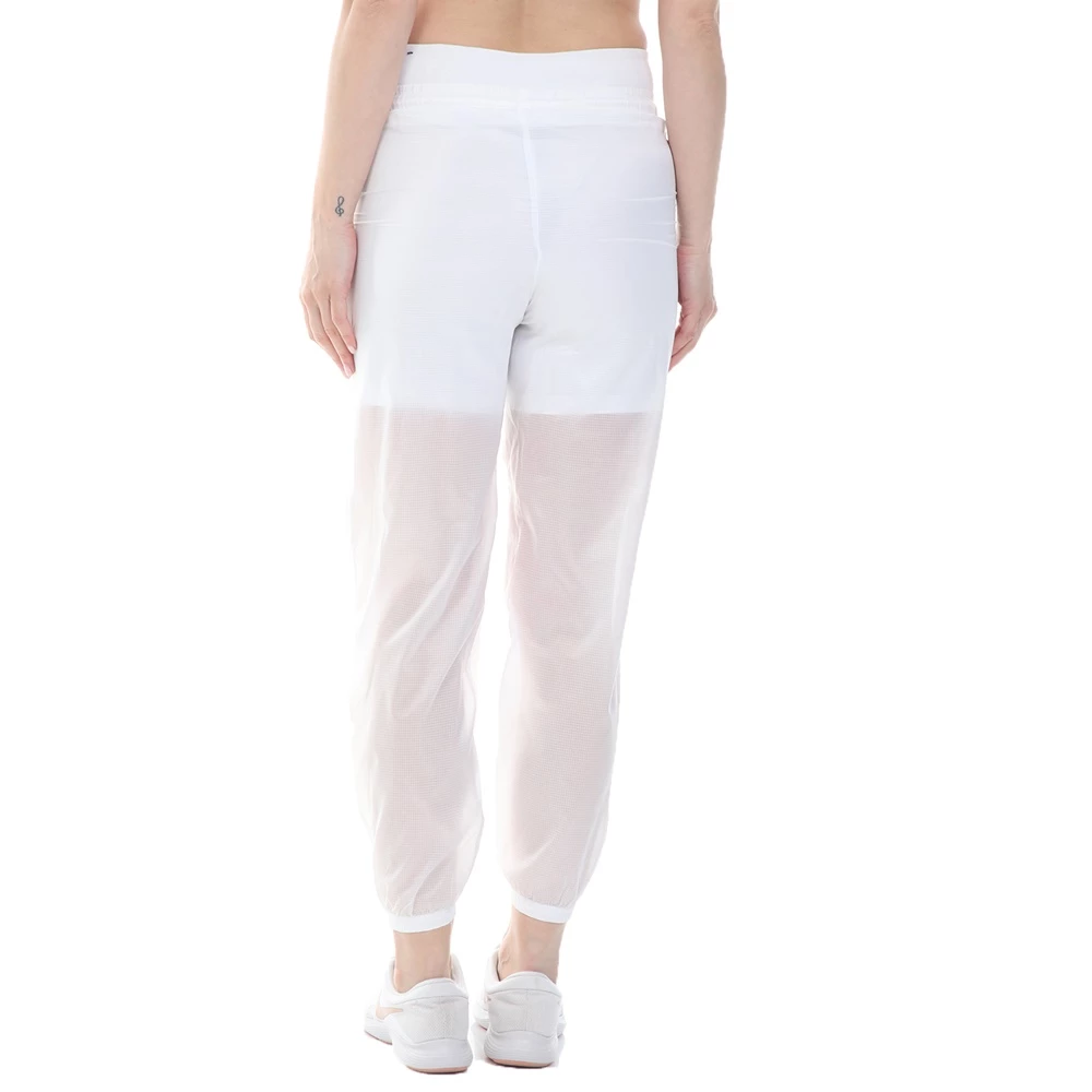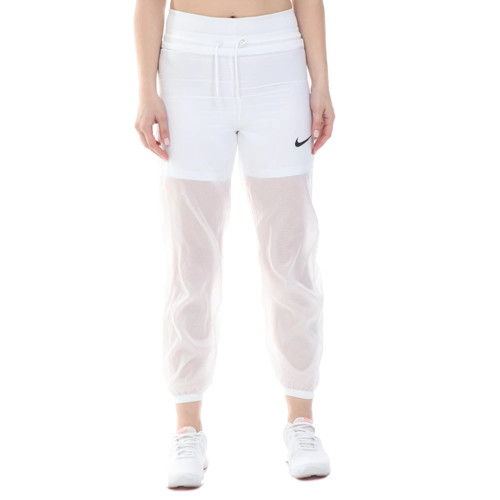 Γυναικεία φόρμα NIKE σε λευκό χρώμα. Σε ίσια γραμμή, με εντυπωσιακό ημιδιάφανο πλέγμα. Διαθέτει φαρδύ λάστιχο με κορδόνι στη μέση και λάστιχο στους αστραγάλους.