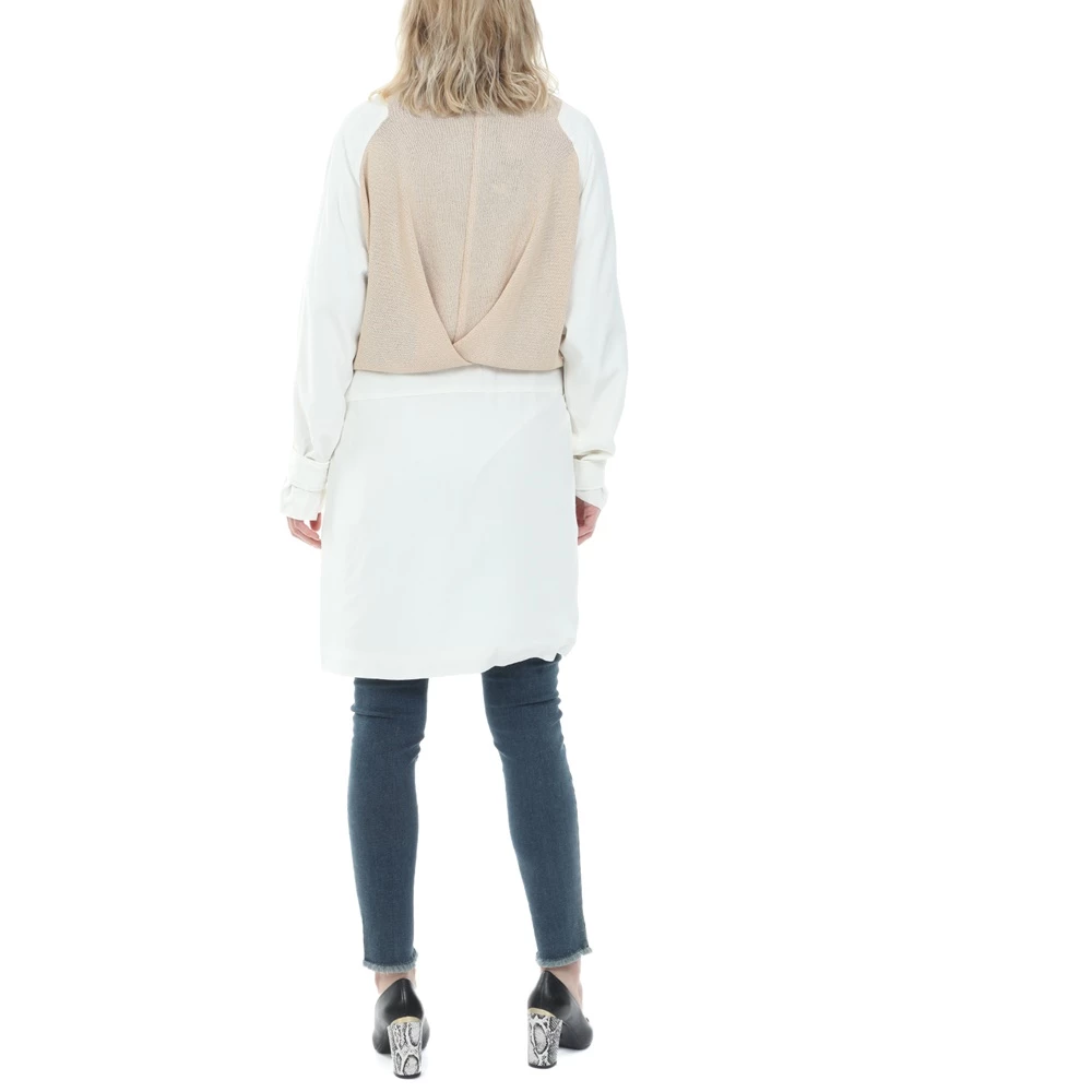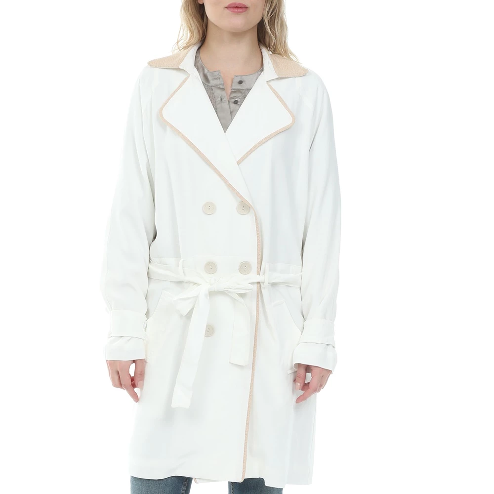 Γυναικεία καπαρτίνα NU σε εκρού απόχρωση. Σε ίσια γραμμή, από βαμβακερή σύνθεση, με λεπτή πλεξη στην πλάτη. Έχει μακριά μανίκια και γιακά με πέτο. Διαθέτει δύο τσέπες μπροστά και αφαιρούμενη ζώνη στη μέση. Κλείνει με διπλά κουμπιά μπροστά.