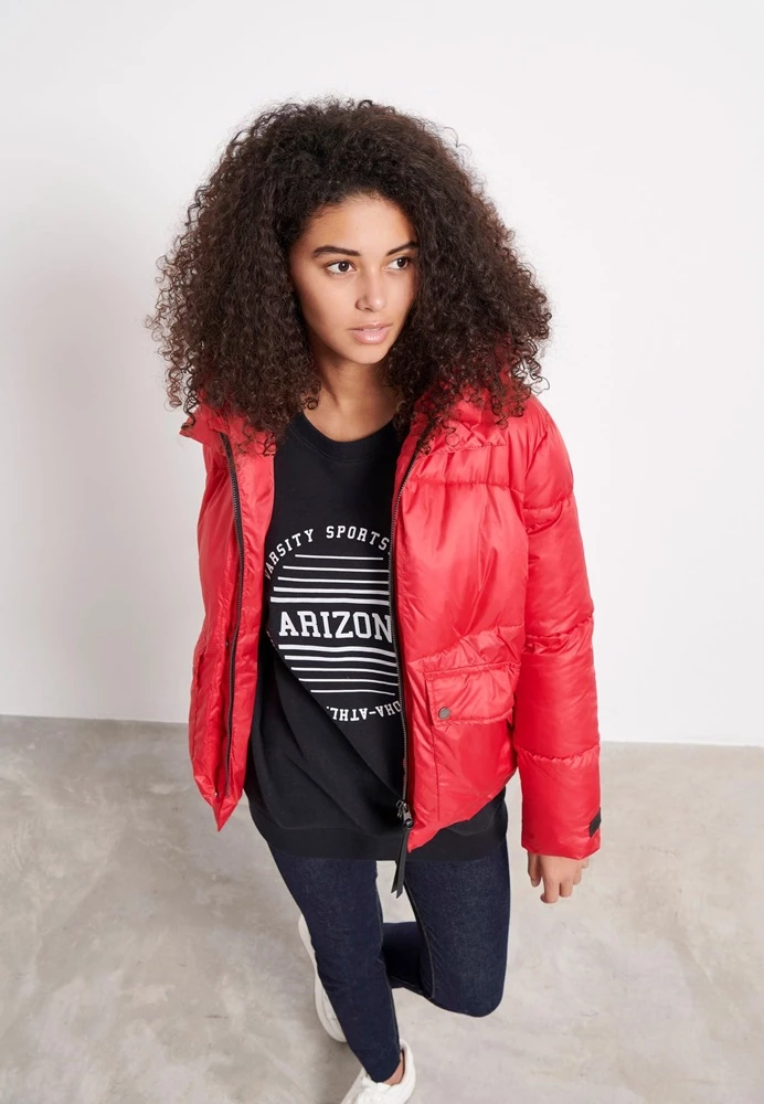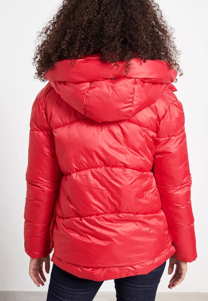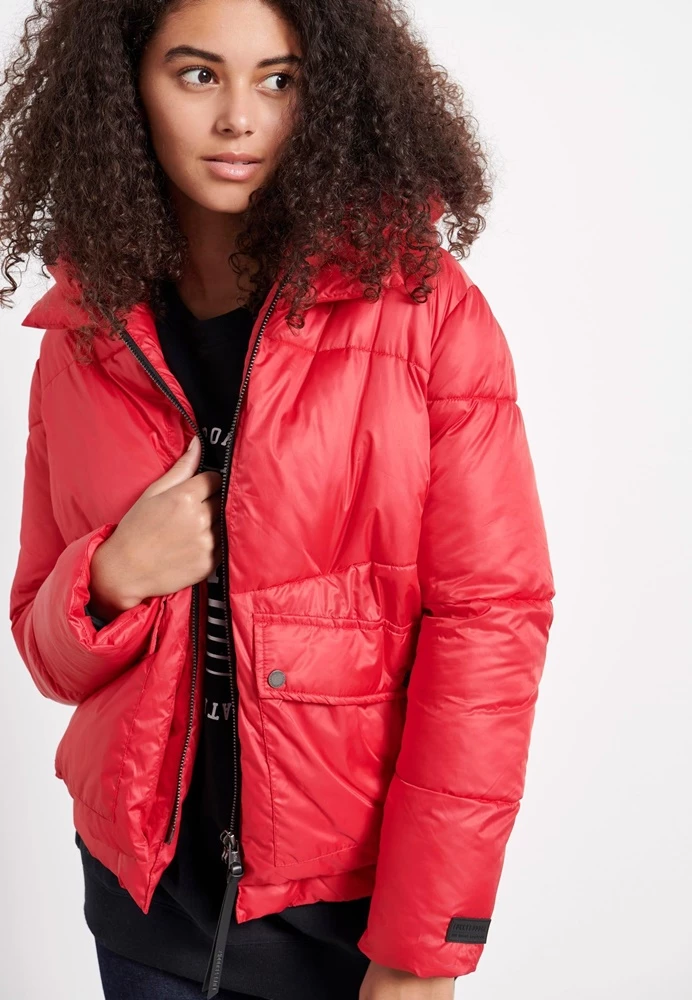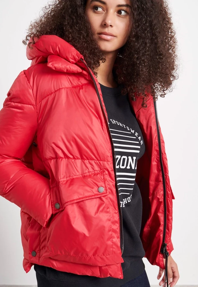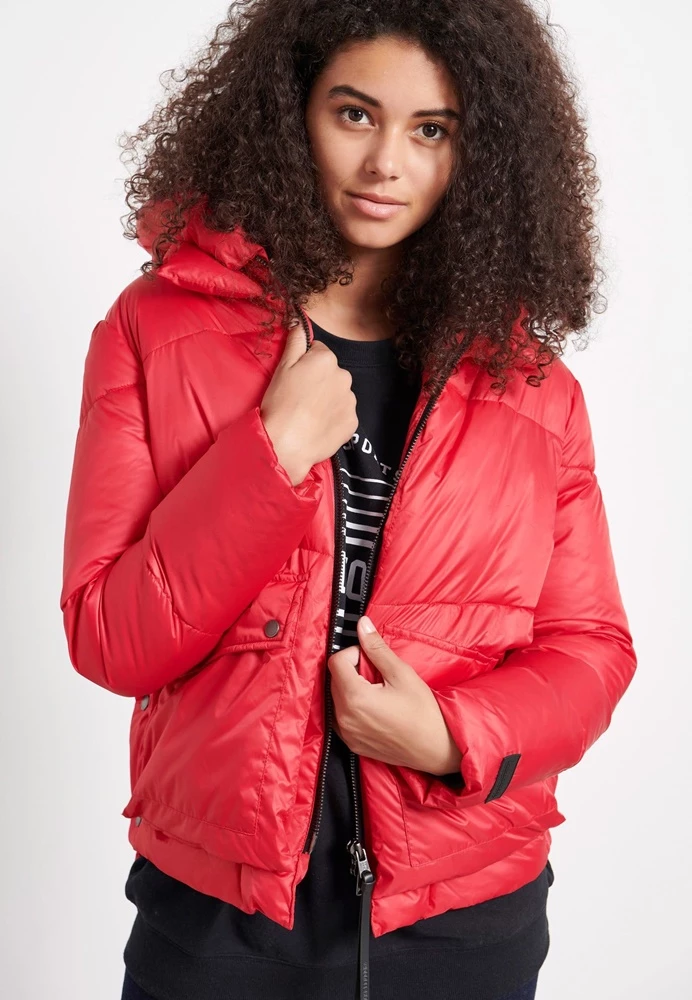Γυναικεία μπουφάν FUNKY BUDDHA σε κόκκινο χρώμα. Σε ίσια γραμμή, με μακριά μανίκια και όρθια λαιμόκοψη. Διαθέτει κουκούλα, δύο τσέπες στα πλάγια και κλείνει με φερμουάρ μπροστά.