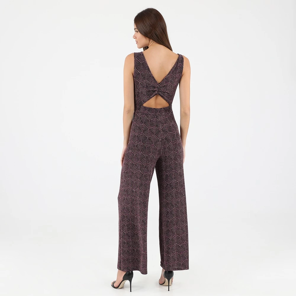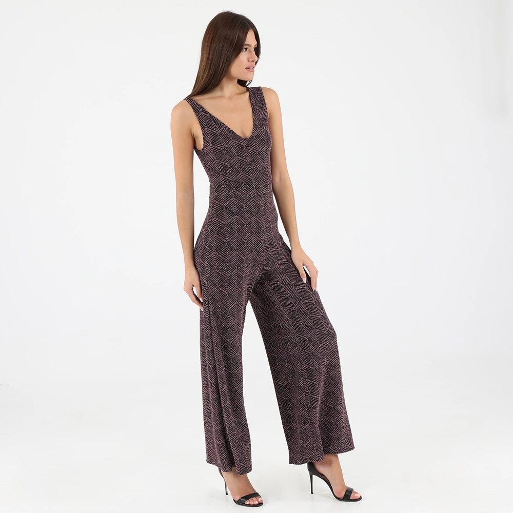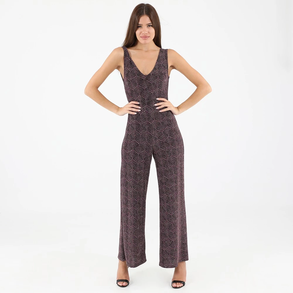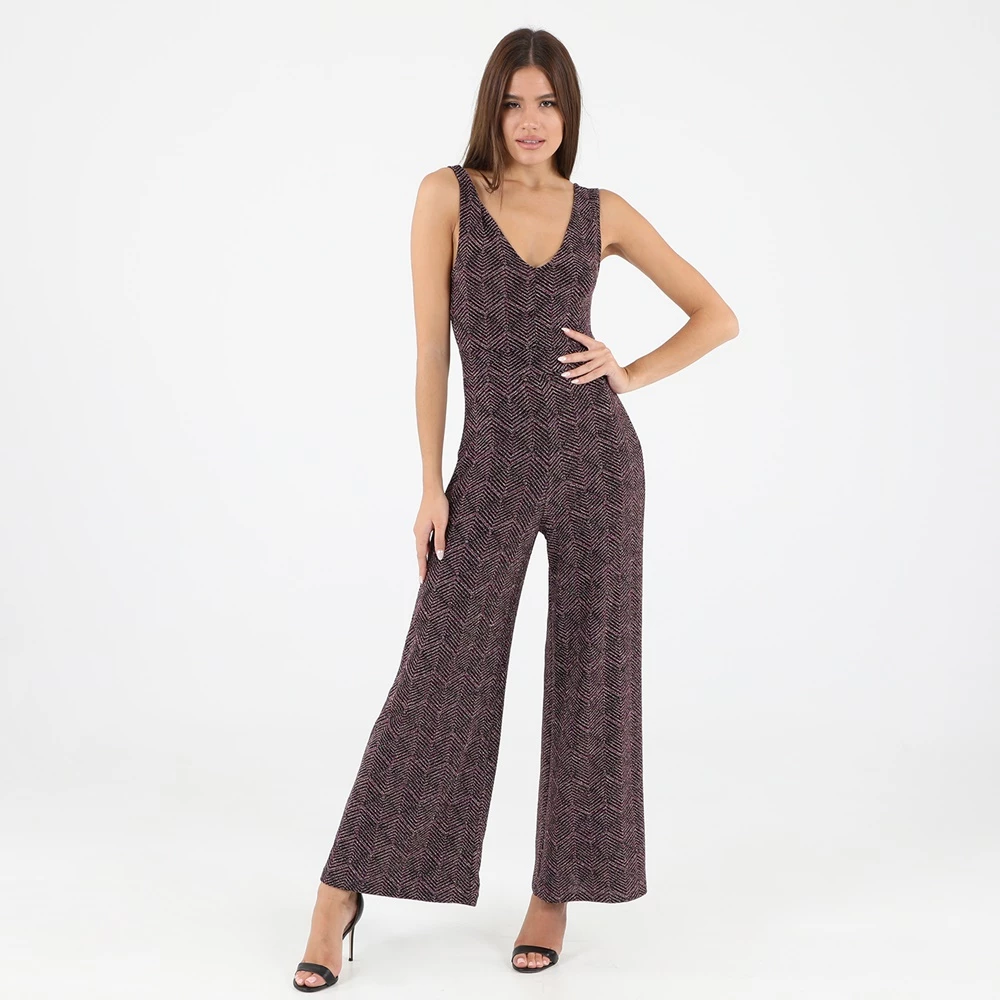 Γυναικεία ολόσωμη φόρμα ATTRATTIVO σε ασημή και μαύρη απόχρωση. Αμάνικο και φαρδιά ψηλόμεση παντελόνα. Έχει V λαιμόκοψη και άνοιγμα στην πλάτη.