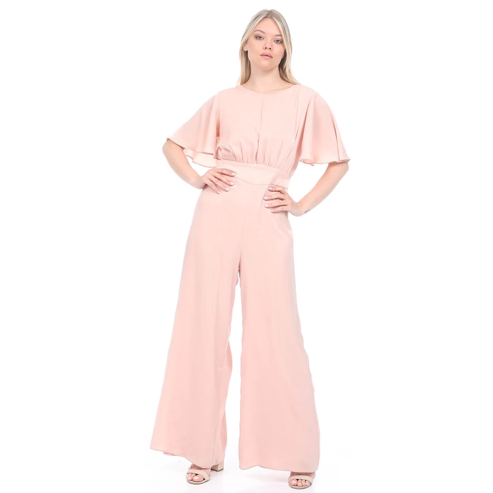 Γυναικεία ολόσωμη φόρμα ATTRATTIVO σε ροζ απόχρωση. Ψηλόμεση παντελόνα, σε φαρδιά γραμμή. Έχει κοντά μανίκια με βολάν και μεγάλο άνοιγμα στην πλάτη. Κλείνει με ένα κουμπάκι και φερμουάρ πίσω.