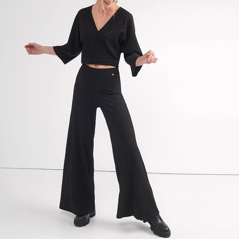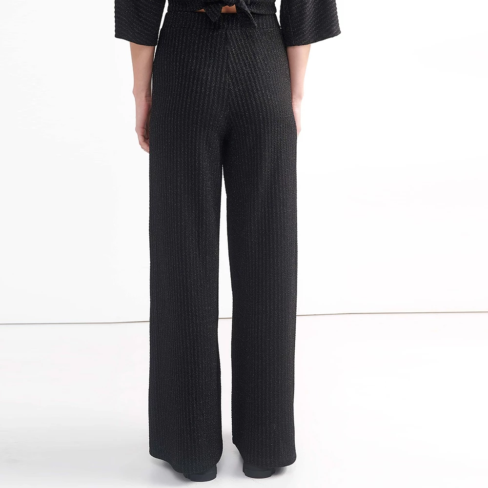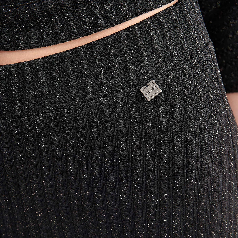 Γυναικεία παντελόνα ATTRATTIVO σε μαύρο χρώμα, με ασημί μεταλλικό νήμα. Είναι ψηλόμεσο, με ανάγλυφο ριγωτό μοτίβο.