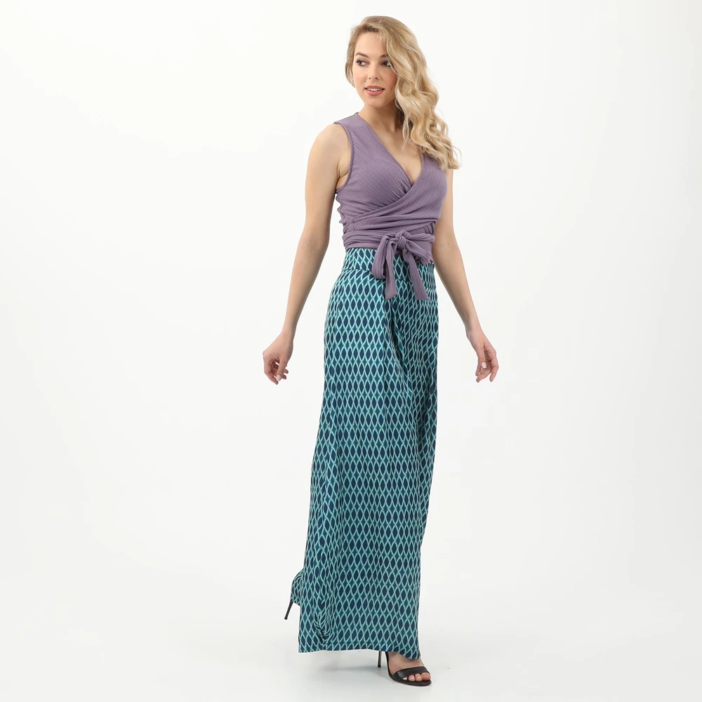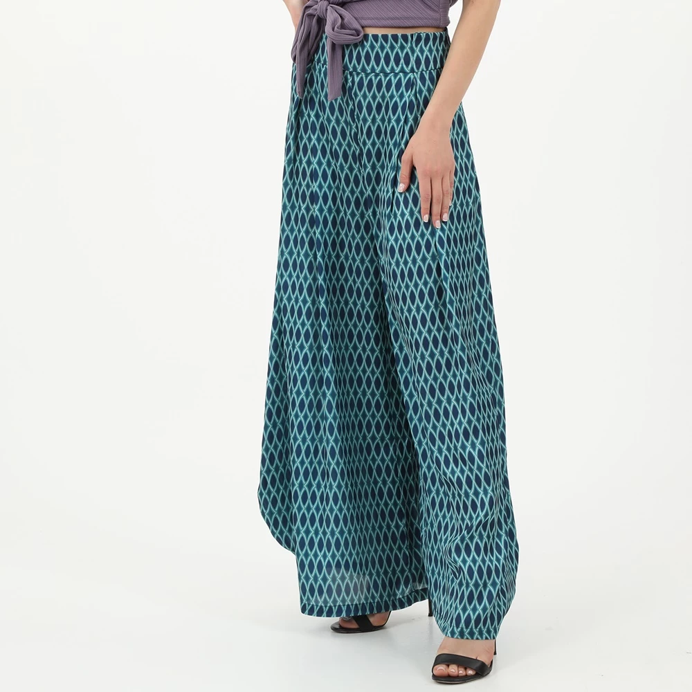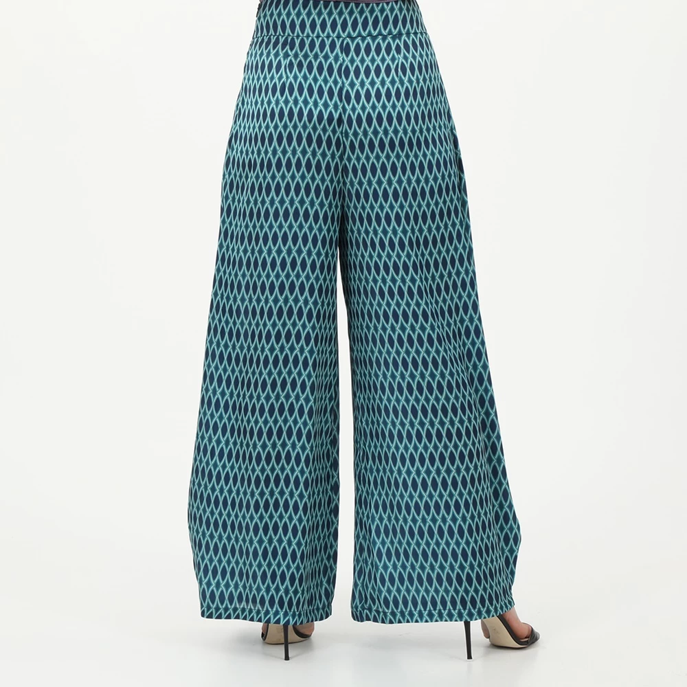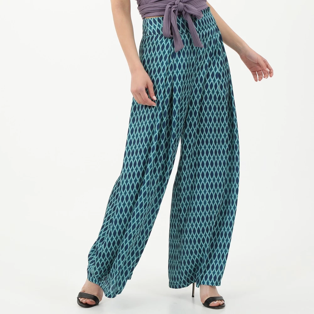 Γυναικεία παντελόνα ATTRATTIVO σε μπλε απόχρωση, με γεωμετικό μοτίβο. Είναι ψηλόμεση, με φαρδιά μπατζάκια. Συνδυάστε την με τα κατάλληλα αξεσουάρ, για εντυπωσιακές all day εμφανίσεις.