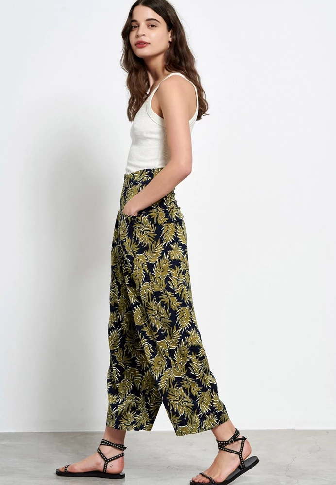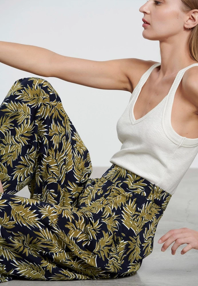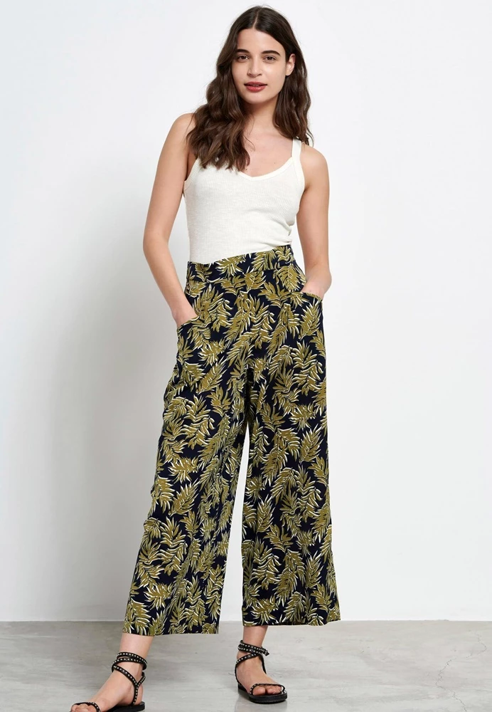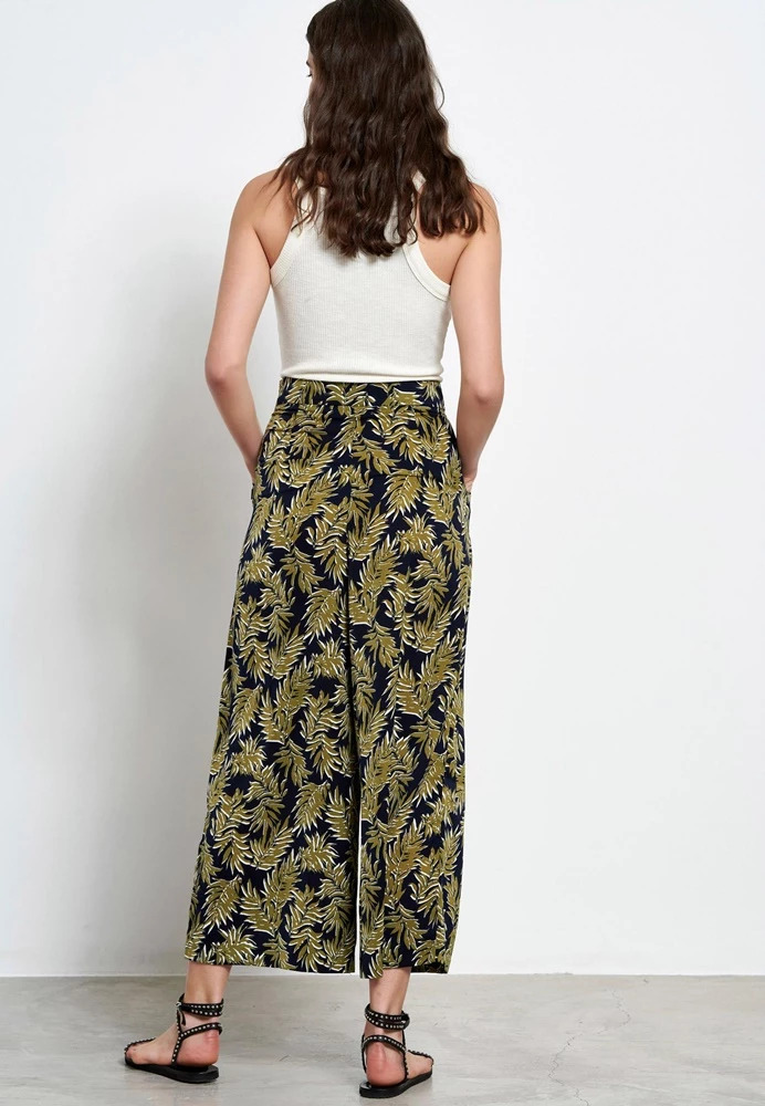 Γυναικεία παντελόνα FUNKY BUDDHA σε μπλε και πράσινη απόχρωση, με τυπωμένο μοτίβο σε όλη την επιφάνεια. Είναι ψηλόμεση, με φαρδιά μπατζάκια και κανονική εφραμογή. Διαθέτει τσέπες στα πλαϊνά και κλείνει με φερμουάρ στο πλάι.