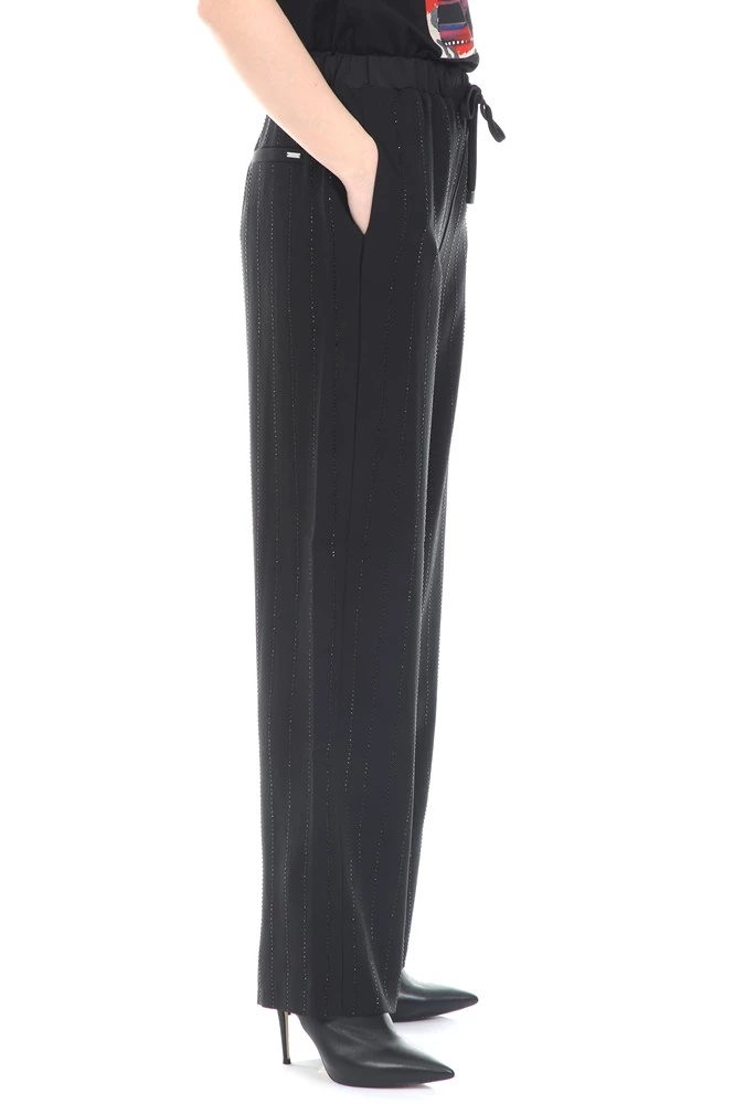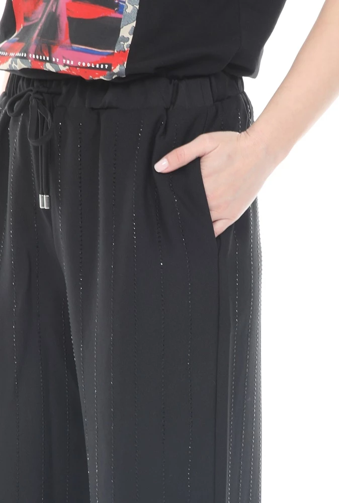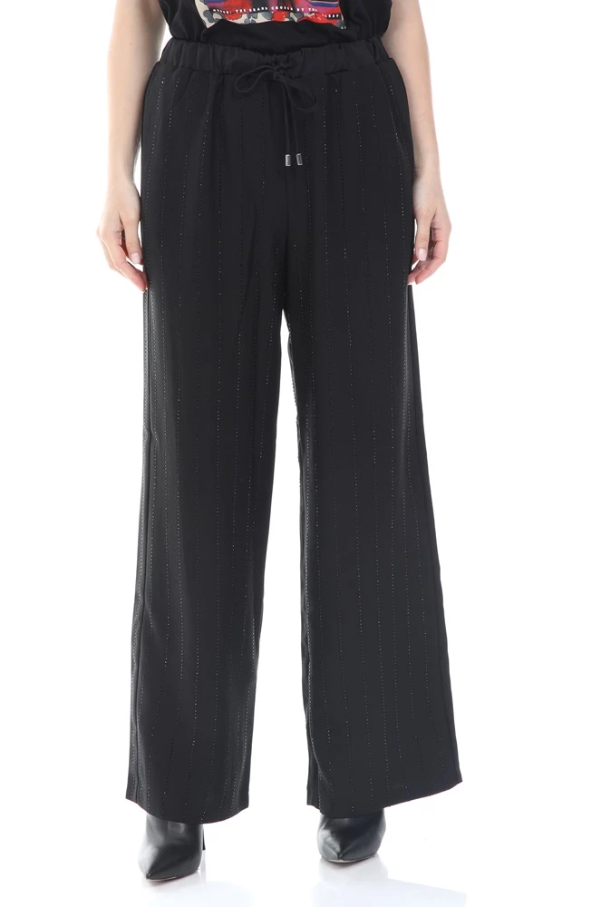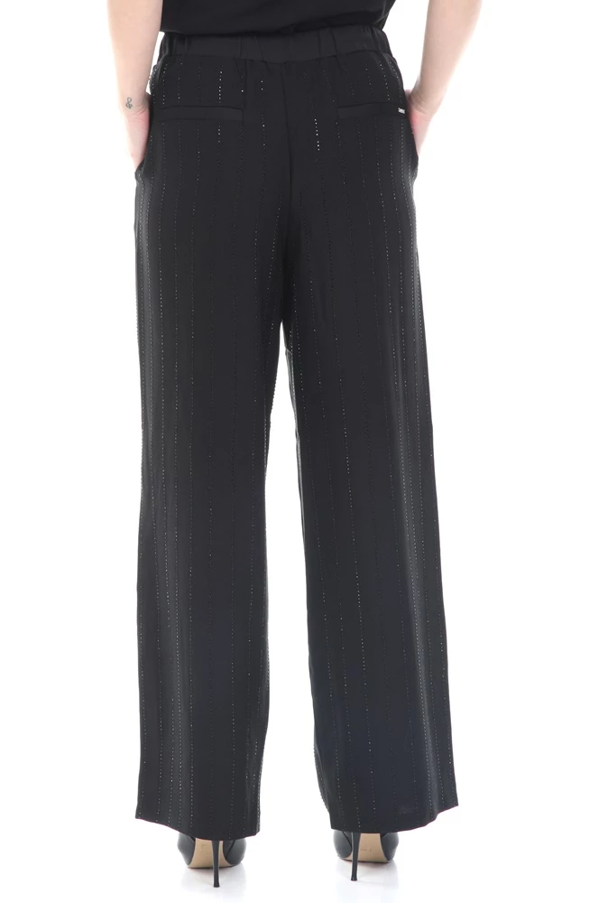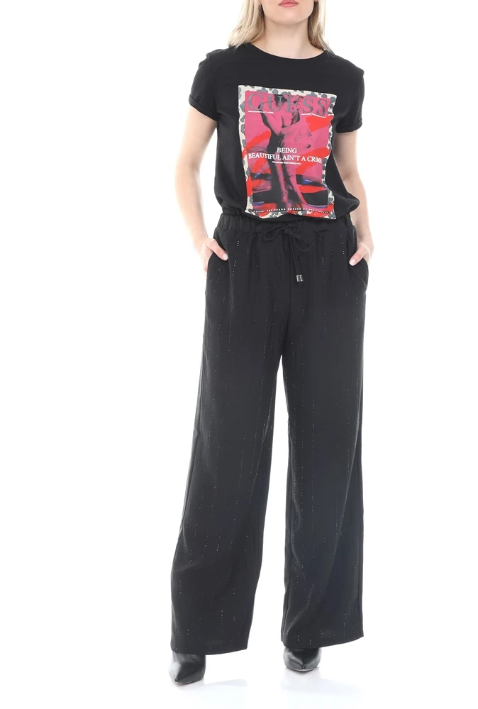Γυναικεία παντελόνα GUESS σε μαύρο χρώμα, με ρίγες από ασημί μεταλλικό νήμα. Σε φαρδιά γραμμή, με κορδόνι στη μέση. Διαθέτει δύο τσέπες στα πλάγια και δύο τσέπες πίσω.