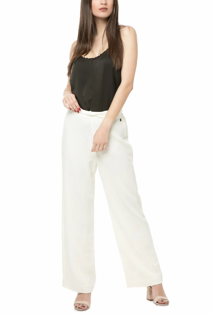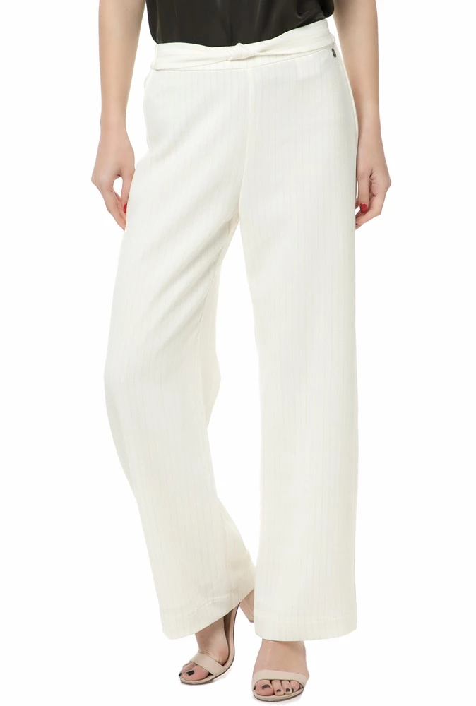 Γυναικεία παντελόνα ριγέ σε εκρού και μπεζ χρώμα, κανονική γραμμή και λεπτομέρεια στη ζώνη. Κομψή επιλογή για κάθε περίσταση.