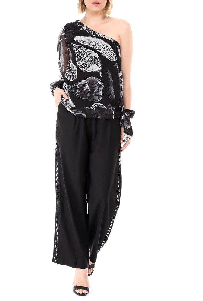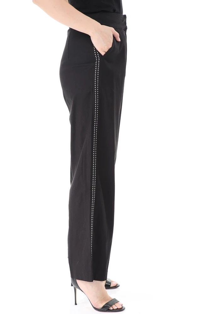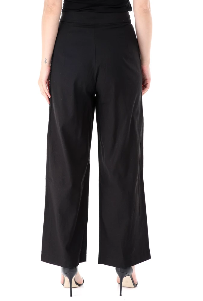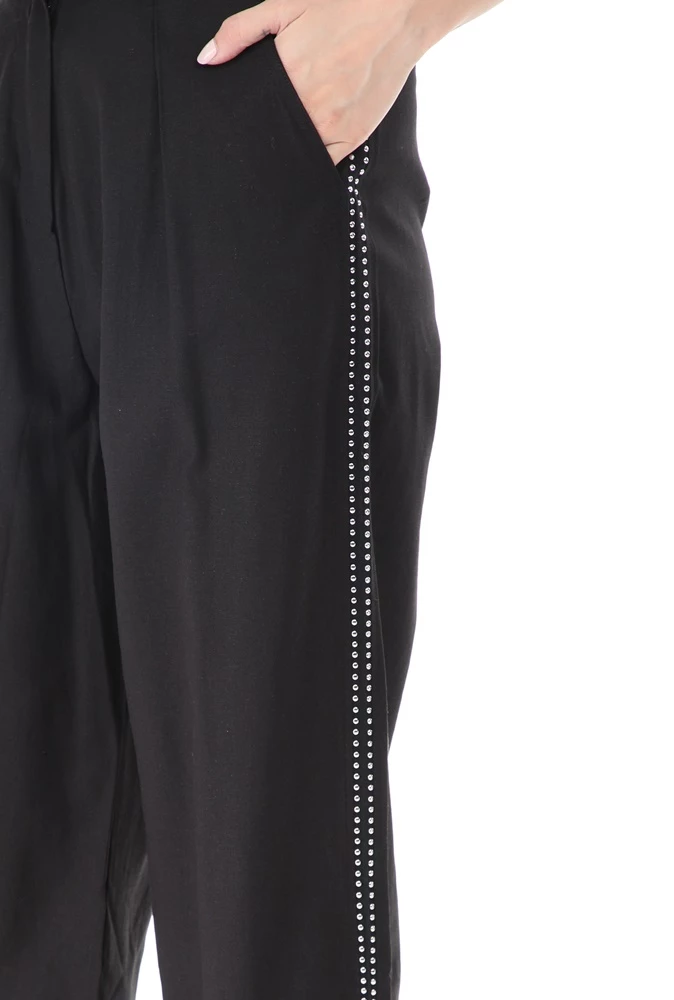 Γυναικεία παντελόνα RELIGION σε μαύρο χρώμα, με μεταλλικά τρουκς στα πλαϊνά. Από λινή σύνθεση, σε φαρδιά γραμμή. Είναι ψηλόμεσο και διαθέτει δύο τσέπες στα πλάγια. Κλείνει με κρυφές κόπιτσες και φερμουάρ μπροστά.