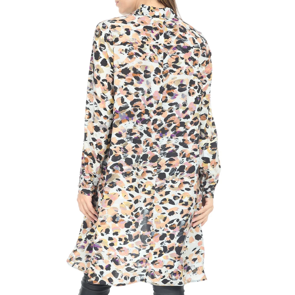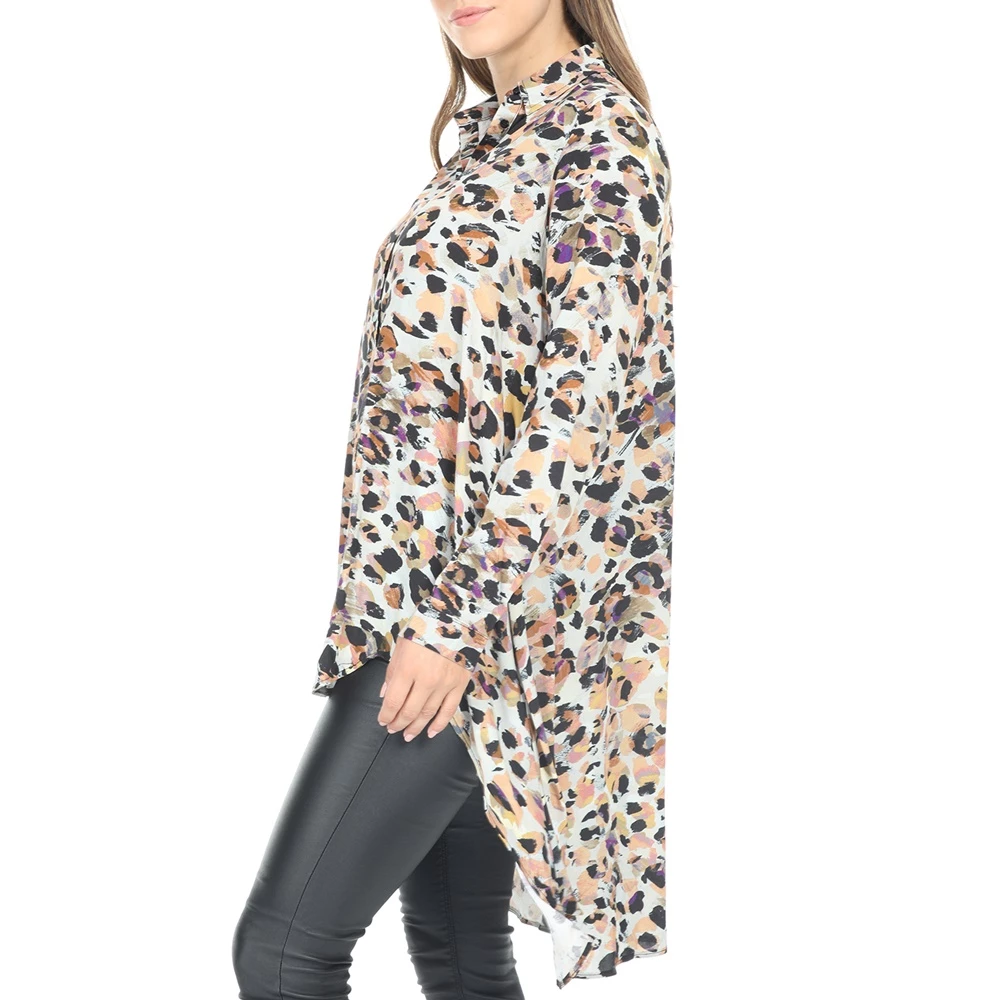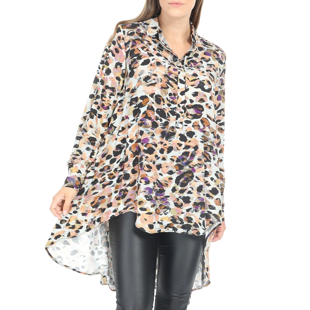 Γυναικεία ασύμμετρη πουκαμίσα IMPERIAL σε εκρού απόχρωση, με πολύχρωμο leopard μοτίβο. Σε ίσια γραμμή, από βαμβακερή σύνθεση. Με μακριά μανίκια και κλασικό γιακά με μυτερές άκρες. Έχει μακρύτερο μήκος πίσω και κλείνει με κουμπιά μπροστά.