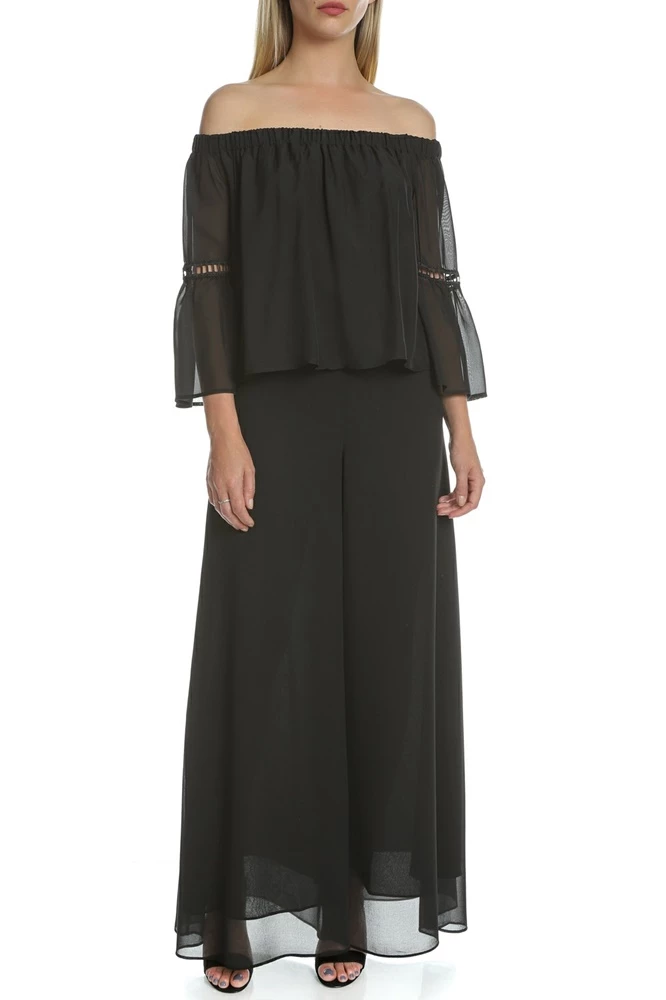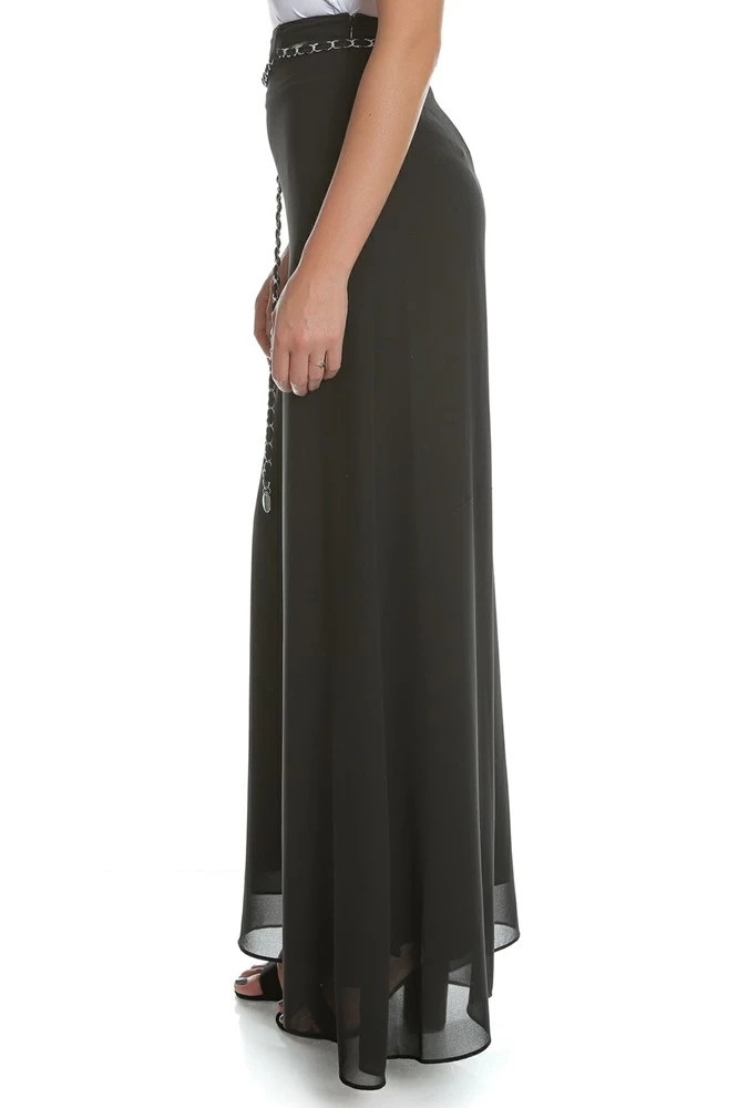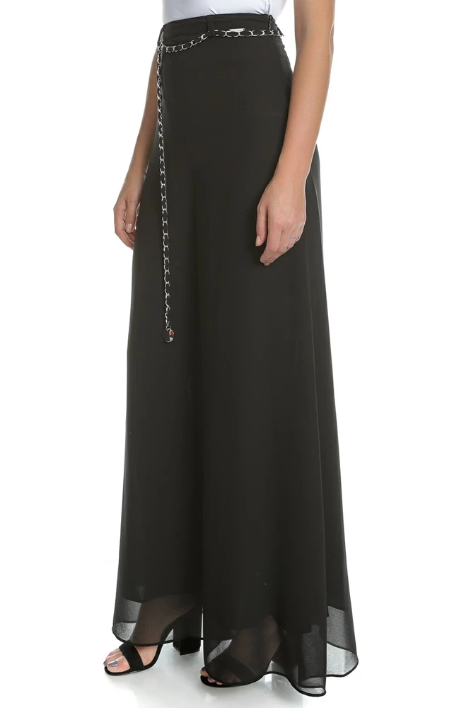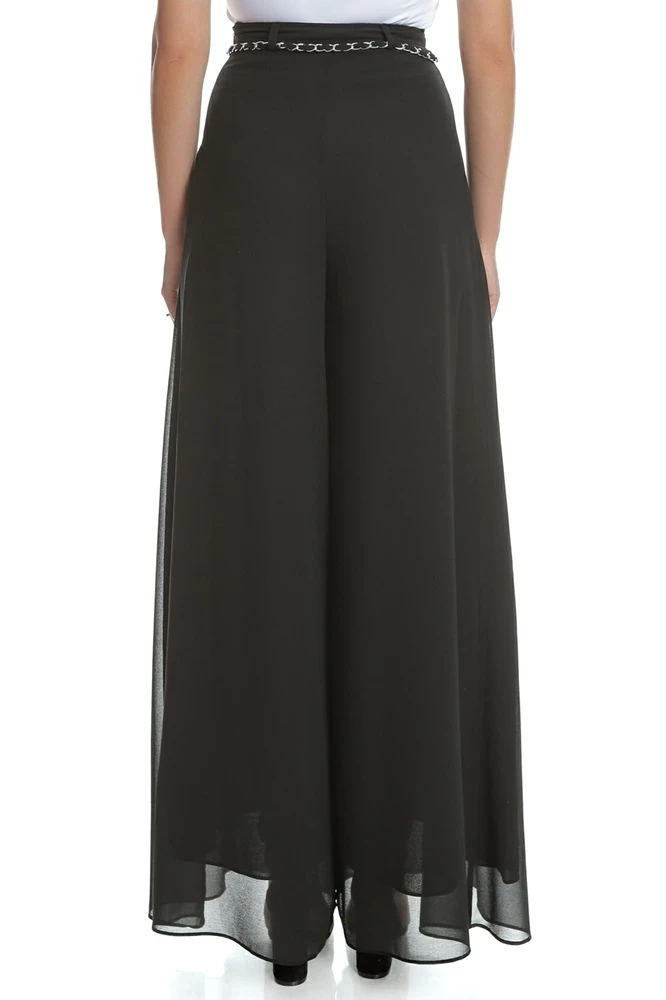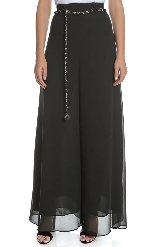 Γυναικεία ψηλόμεση παντελόνα σε μαύρη απόχρωση, με αέρινη γραμμή και μεταλλική ζώνη στη μέση για άψογο στιλ. Συνδύασέ το με τοπ από μέσα για κομψά looks.