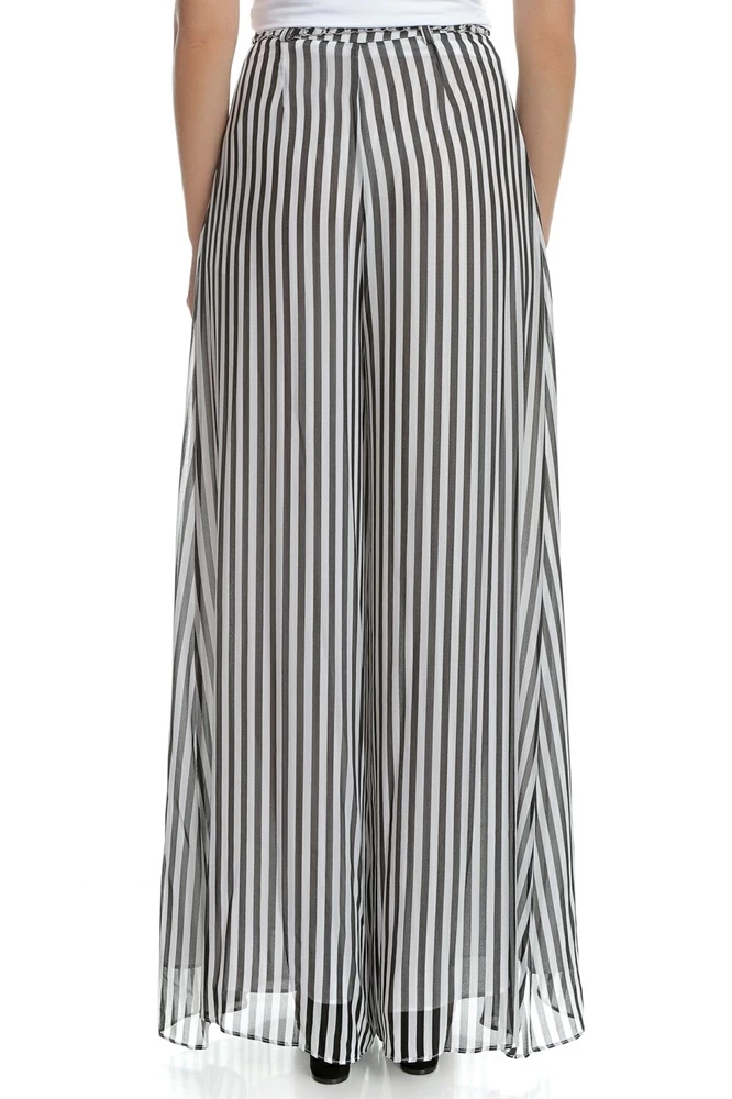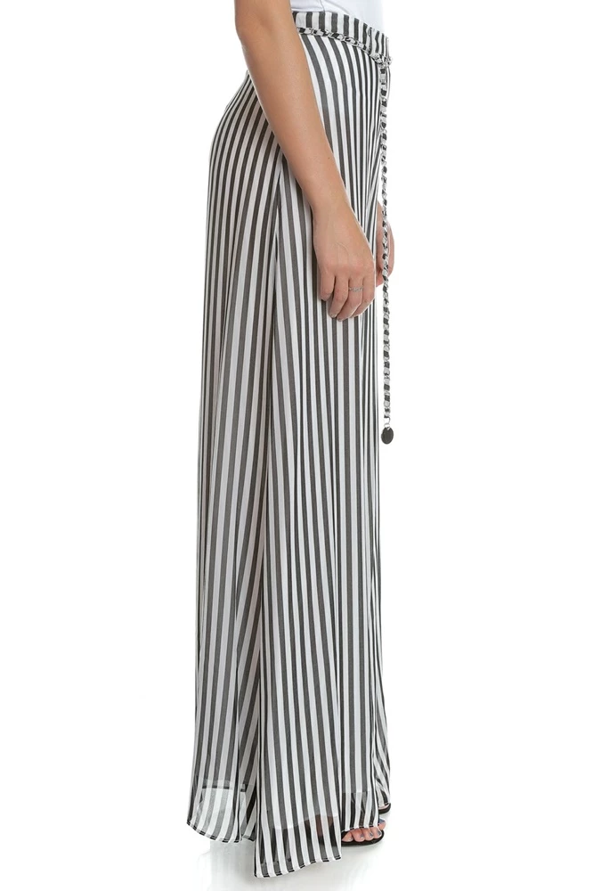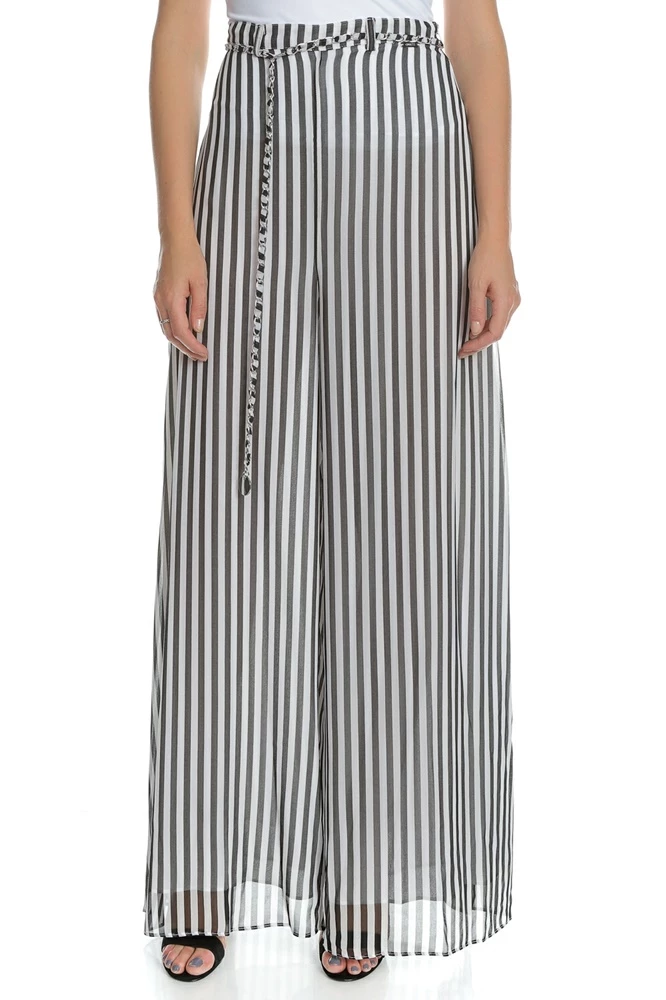 Γυναικεία ψηλόμεση παντελόνα, ριγέ σε ασπρόμαυρο χρώμα με μεταλλικές λεπτομέρειες στη ζώνη και αέρινη γραμμή που κολακεύει τις καμπύλες. Συνδύασέ το άψογα με τοπ από μέσα.