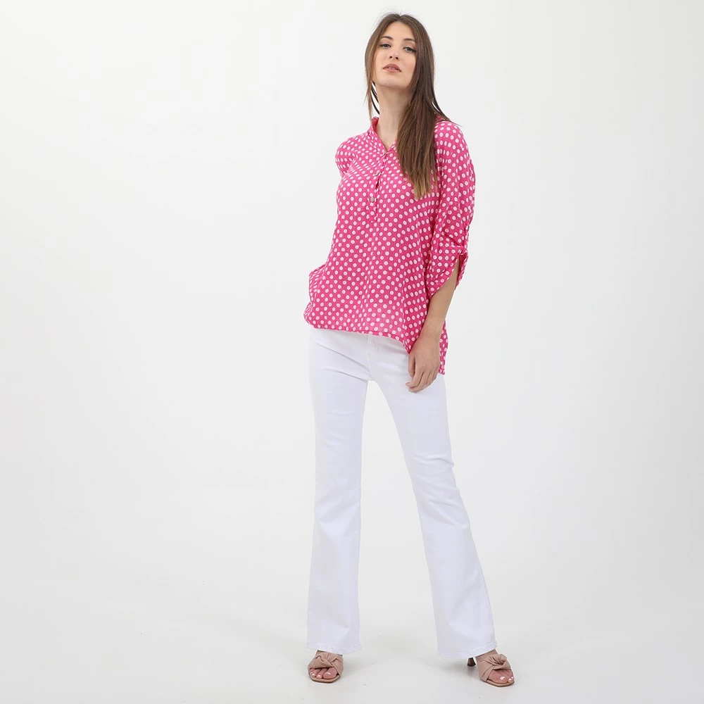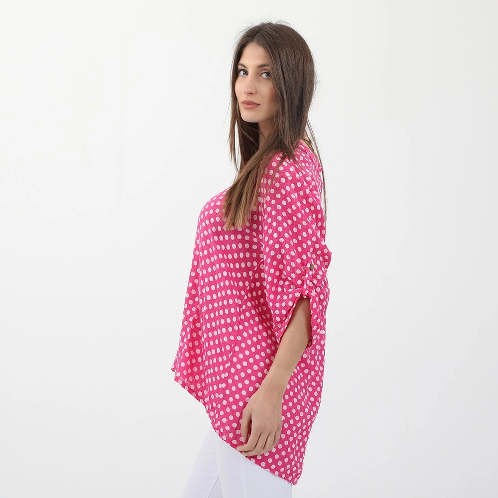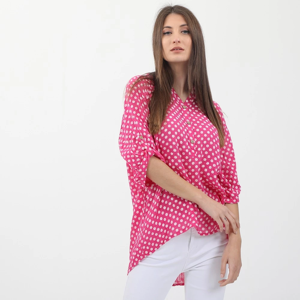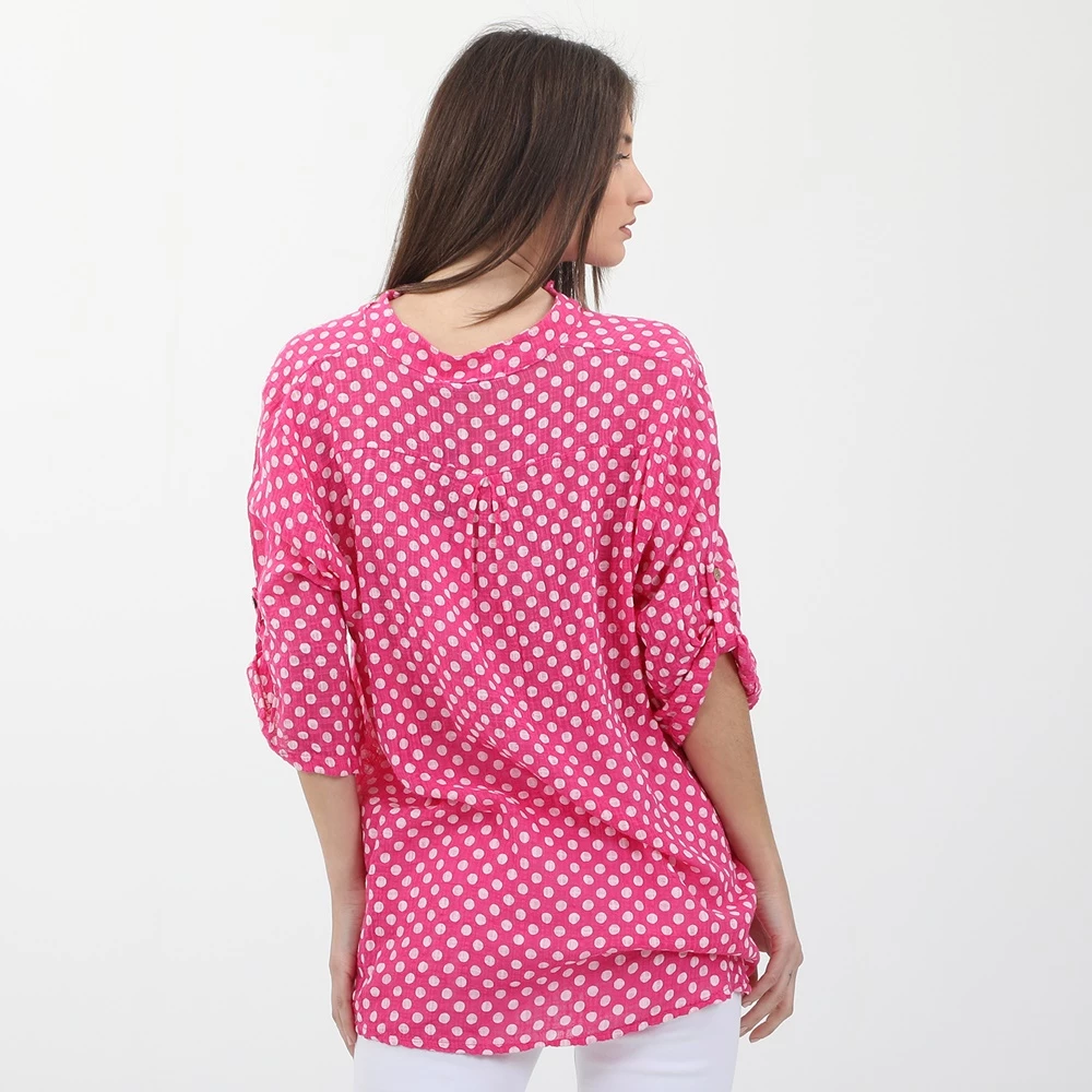 Γυναικεία τουνίκ ATTRATTIVO σε φούξια απόχρωση, με πουά λευκό μοτιβο. Από βαμβακερή σύνθεση, με μακρύτερο μήκος πίσω. Έχει μανίκια 3/4 και mao γιακά, με V λαιμόκοψη και κουμπάκια.