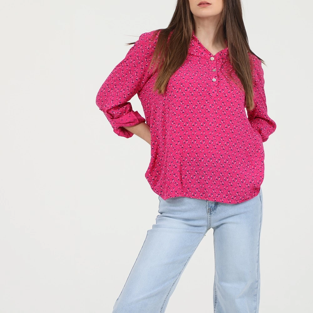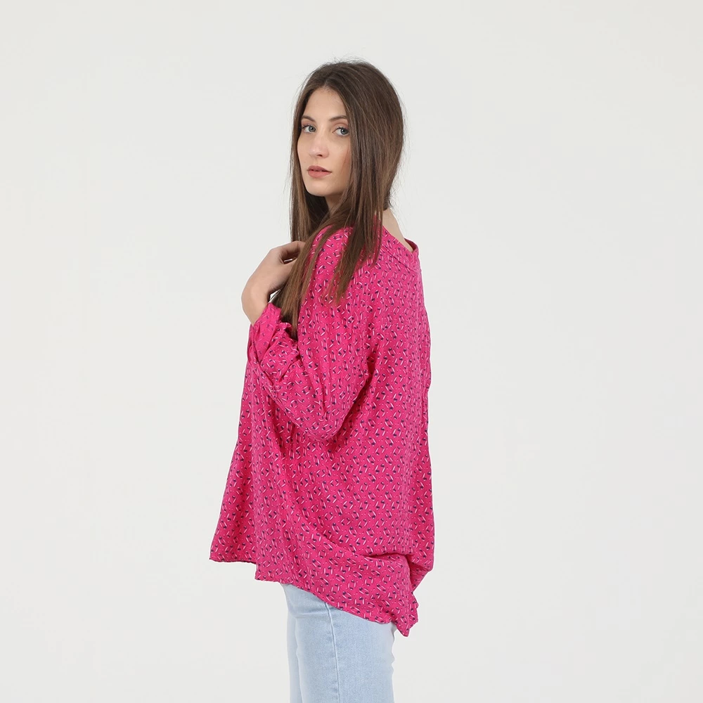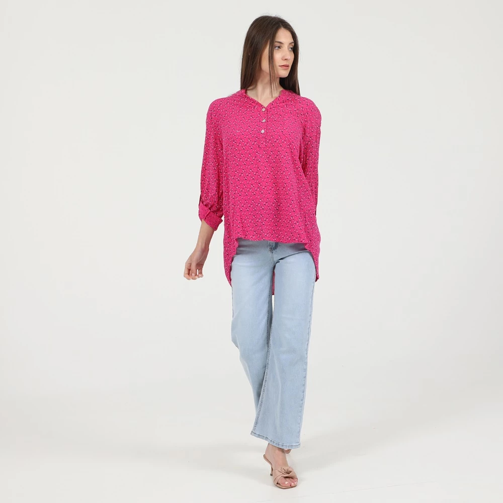 Γυναικεία τουνίκ ATTRATTIVO σε φούξια απόχρωση, με μπλε μοτίβα σε όλη την επιφάνεια. Σε άνετη γραμμή, με μανίκια 7/8 και V λαιμόκοψη με κουμπάκια. Ελαφρώς μακρύτερο μήκος πίσω.