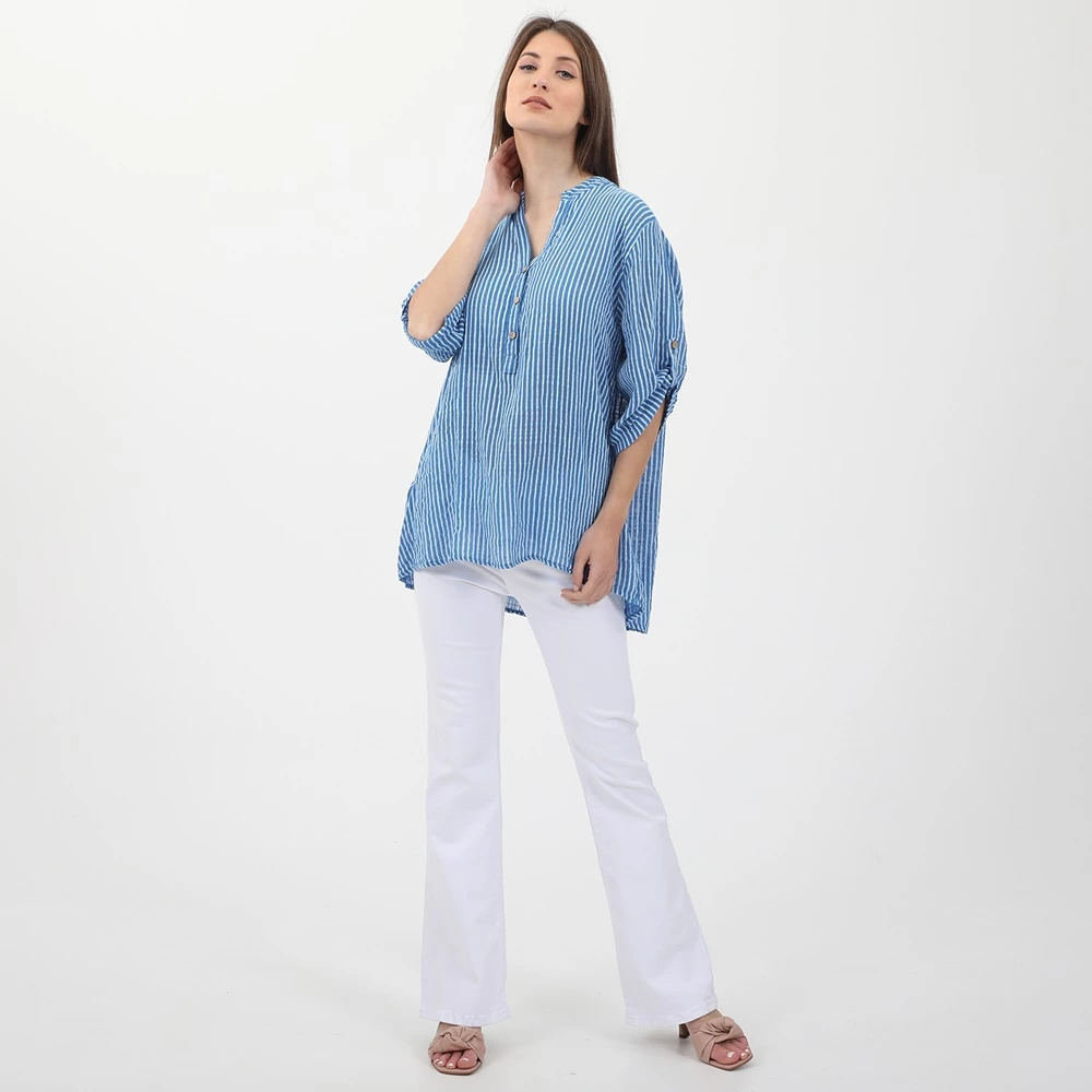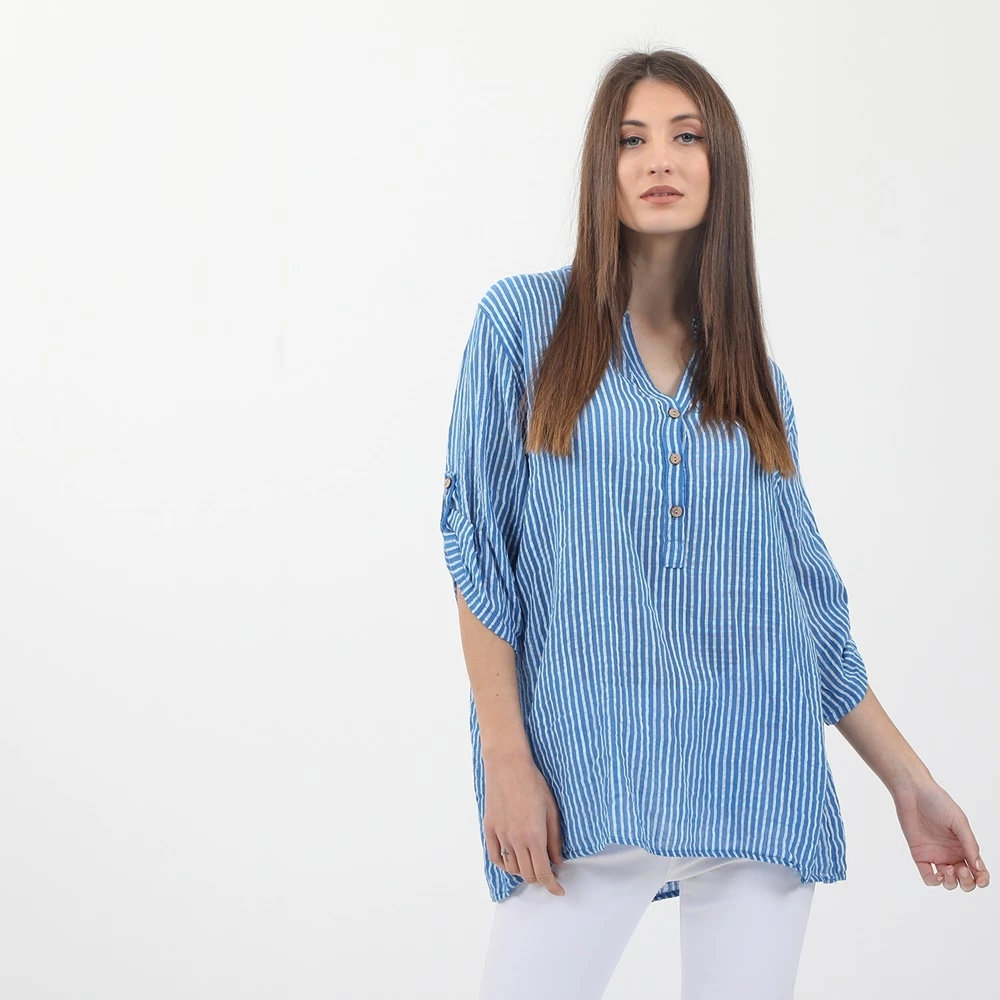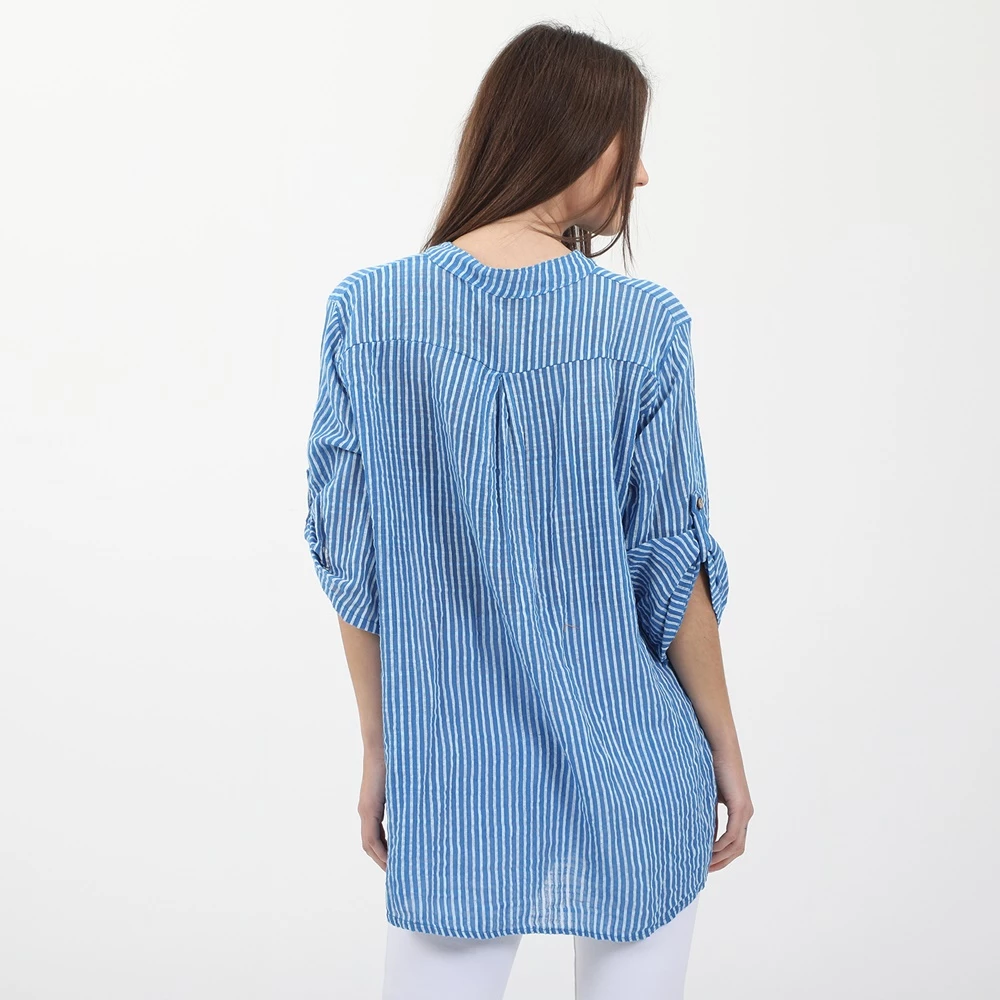 Γυναικεία τουνίκ ATTRATTIVO σε μπλε απόχρωση, με ριγέ λευκό μοτιβο. Από βαμβακερή σύνθεση, με μακρύτερο μήκος πίσω. Έχει μανίκια 3/4 και mao γιακά, με V λαιμόκοψη και κουμπάκια.