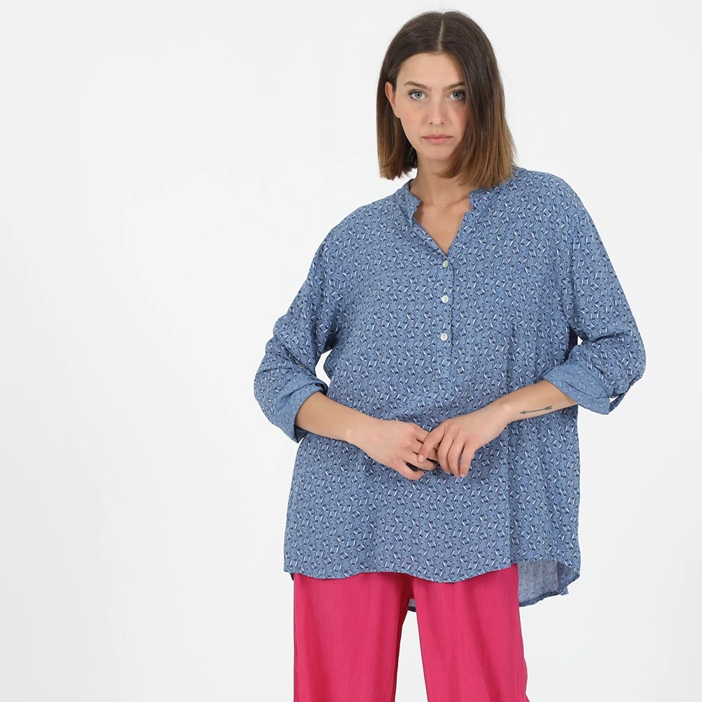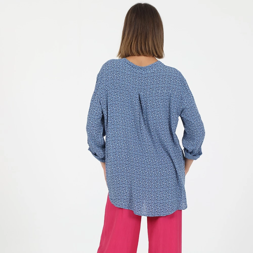 Γυναικεία τουνίκ ATTRATTIVO σε μπλε απόχρωση, με λευκά μοτίβα σε όλη την επιφάνεια. Σε άνετη γραμμή, με μανίκια 7/8 και V λαιμόκοψη με κουμπάκια. Ελαφρώς μακρύτερο μήκος πίσω.