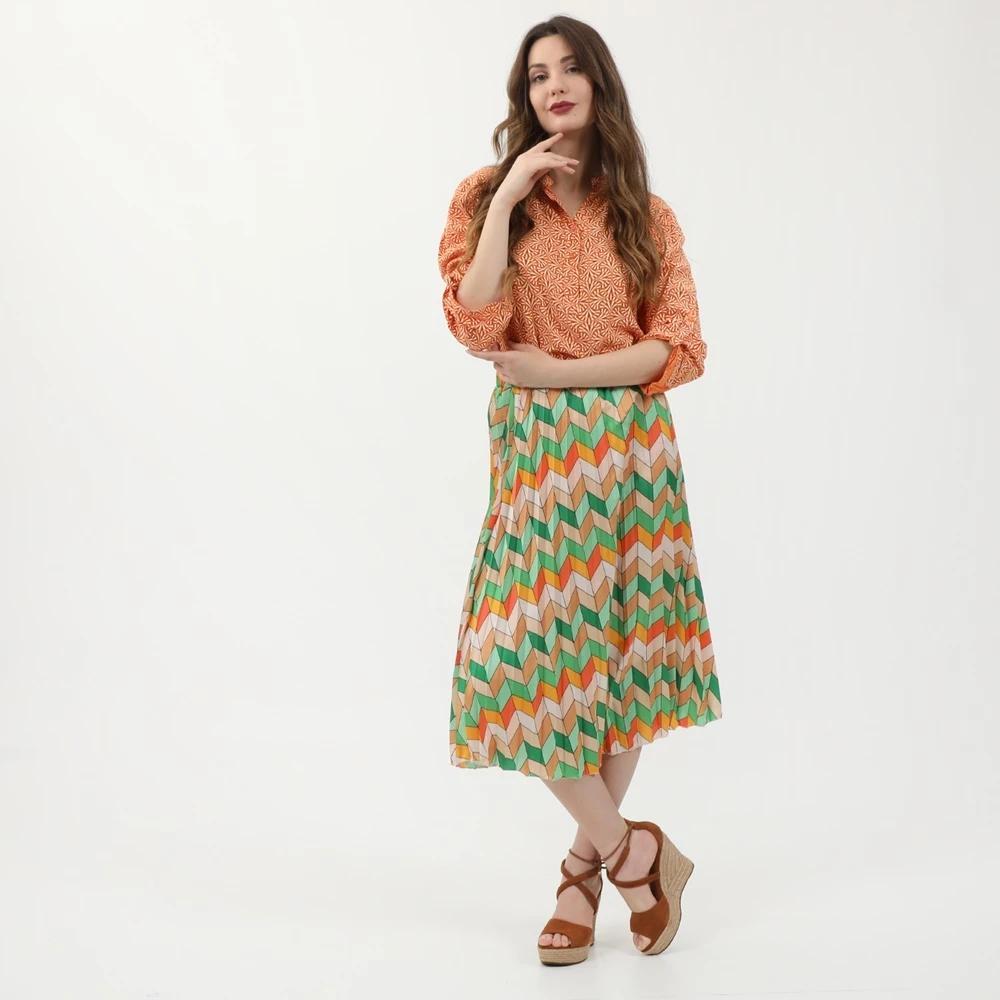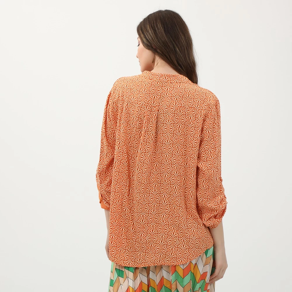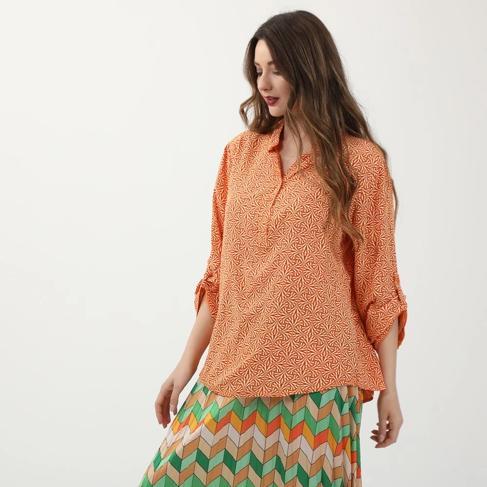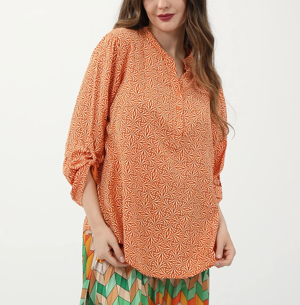 Γυναικεία τουνίκ ATTRATTIVO σε πορτοκαλί απόχρωση, με εμπριμέ μοτίβο. Από βαμβακερή σύνθεση, με μακριά μανίκια και mao γιακά με κουμπάκια στην λαιμόκοψη.