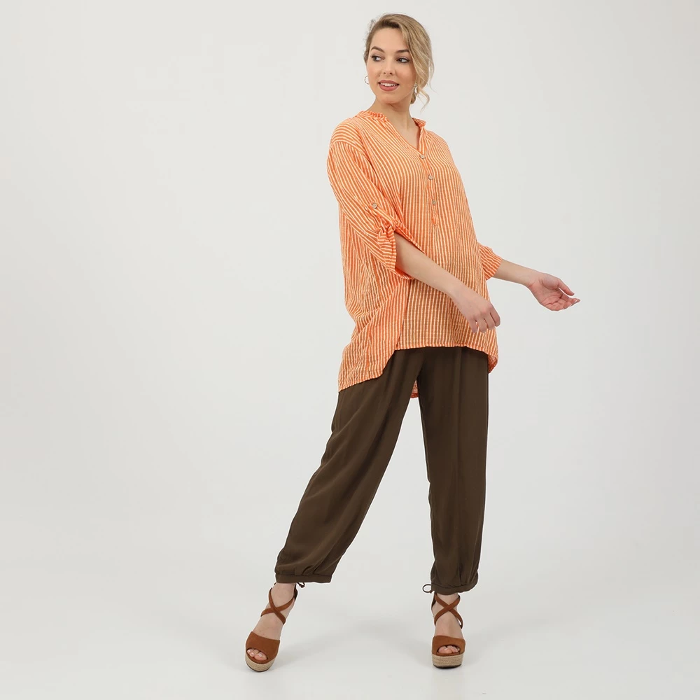 Γυναικεία τουνίκ ATTRATTIVO σε πορτοκαλί απόχρωση, με ριγέ λευκό μοτιβο. Από βαμβακερή σύνθεση, με μακρύτερο μήκος πίσω. Έχει μανίκια 3/4 και mao γιακά, με V λαιμόκοψη και κουμπάκια.
