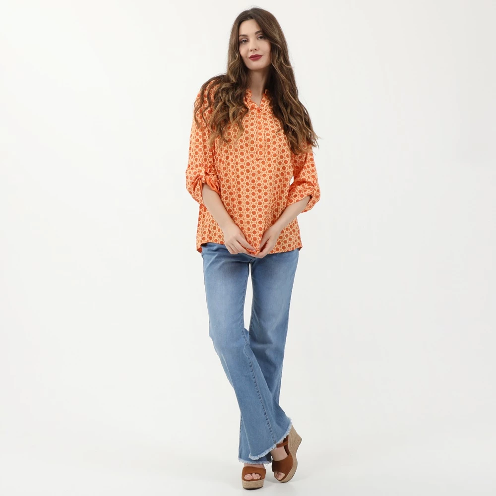 Γυναικεία τουνίκ ATTRATTIVO σε πορτοκαλί απόχρωση, με εμπριμέ μοτίβο. Από βαμβακερή σύνθεση, με μακριά μανίκια και mao γιακά με κουμπάκια στην λαιμόκοψη.