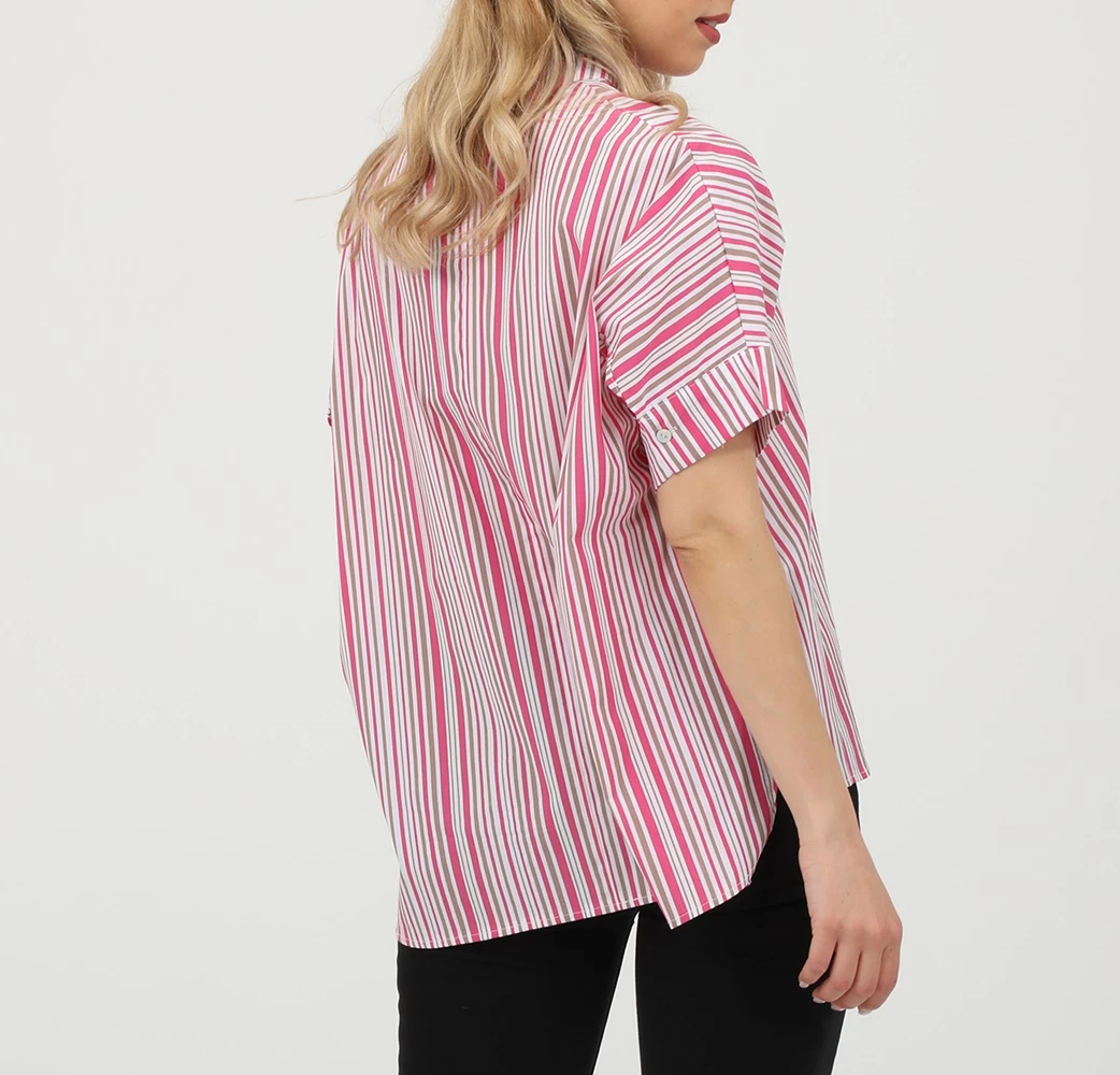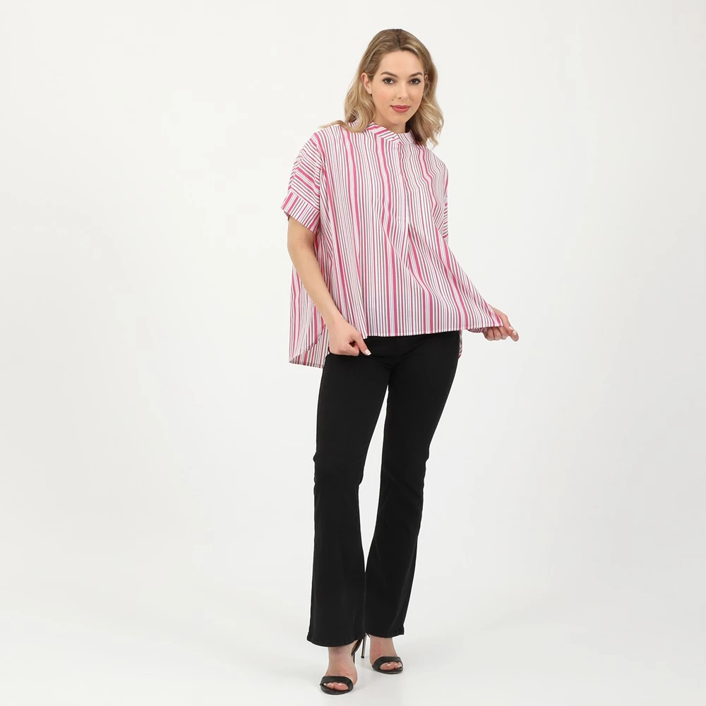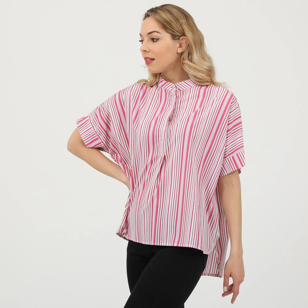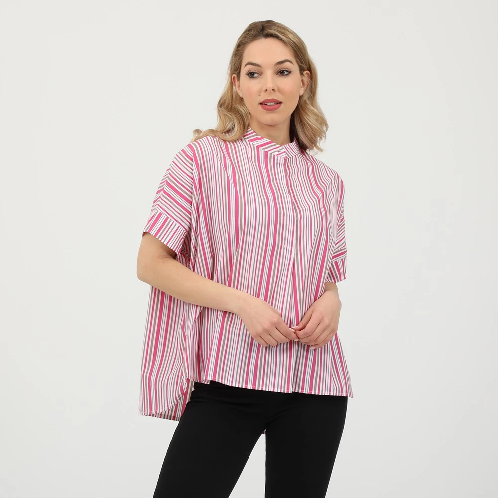 Γυναικεία τουνίκ ATTRATTIVO σε ροζ απόχρωση, με ριγέ λευκό μοτιβο. Σε άνετη γραμμή, με μακρύτερο μήκος πίσω. Έχει κοντά μανίκια και mao γιακά. Κλείνει με κουμπάκια.