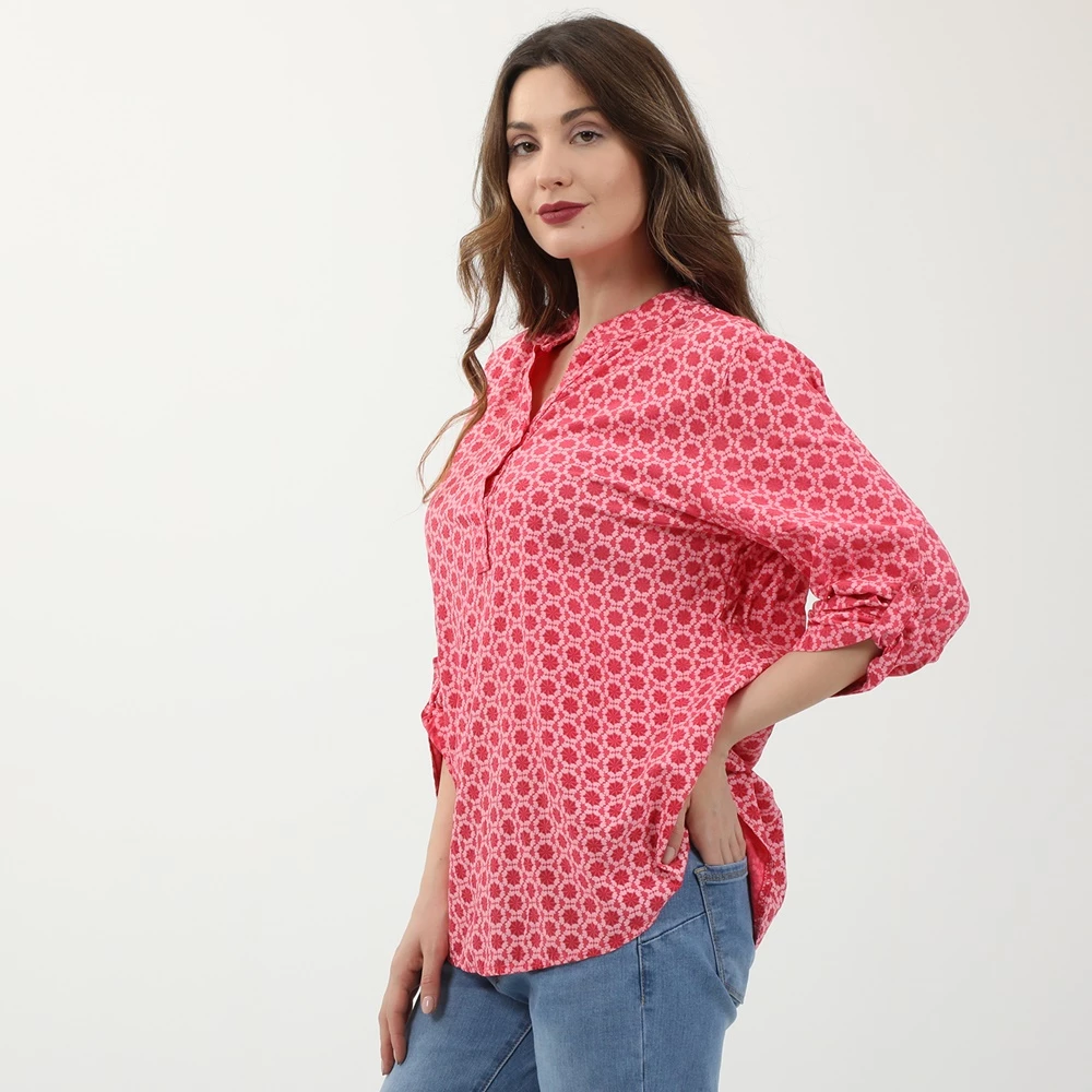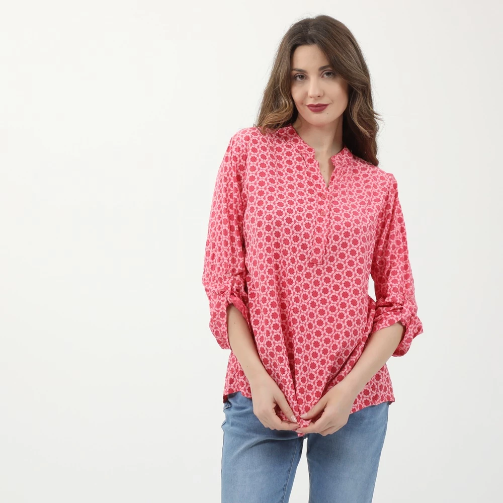 Γυναικεία τουνίκ ATTRATTIVO σε ροζ απόχρωση, με εμπριμέ μοτίβο. Από βαμβακερή σύνθεση, με μακριά μανίκια και mao γιακά με κουμπάκια στην λαιμόκοψη.