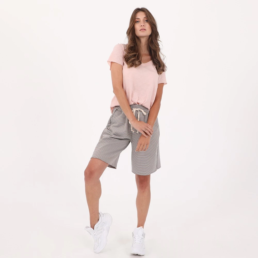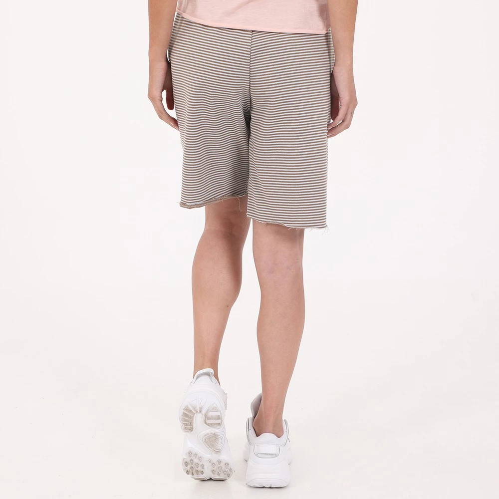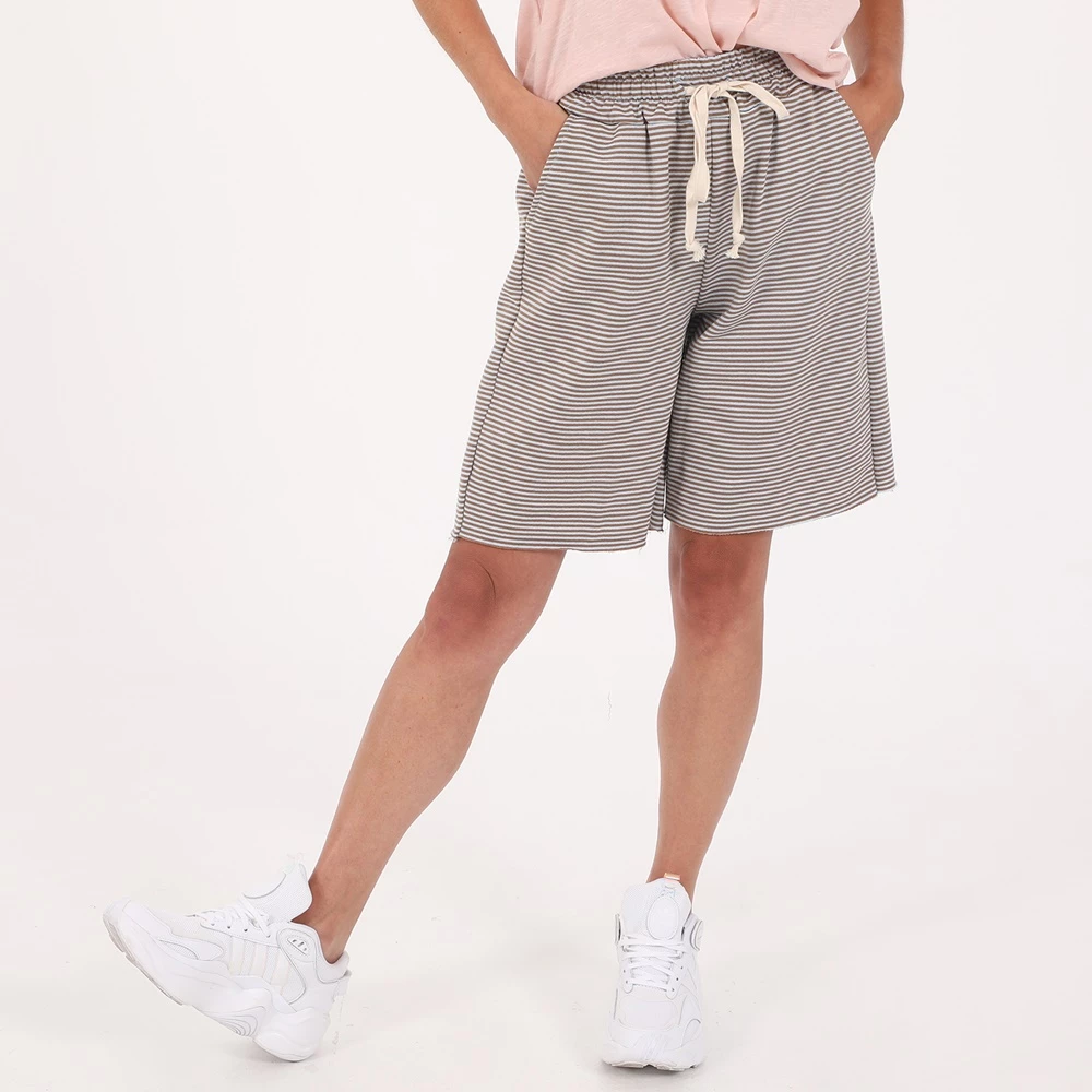 Γυναικεία βερμούδα ATTRATTIVO με ριγέ καφέ μοτίβο. Διαθέτει λάστιχο με κορδόνι στη μέση και δύο τσέπες στα πλάγια.