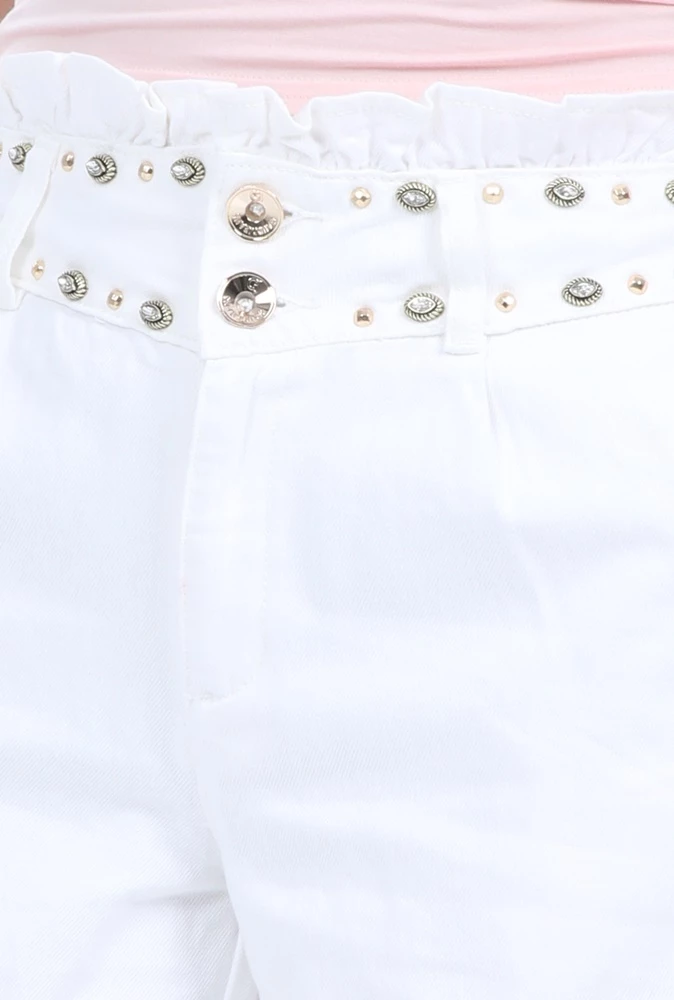 Γυναικεία βερμούδα GAUDI σε λευκό χρώμα, με εντυπωσιακές κεντημένες πέτρες στο επάνω μέρος. Είναι ψηλόμεση, από βαμβακερή σύνθεση. Διαθέτει δύο τσέπες στα πλάγια και δύο τσέπες πίσω. Κλείνει με κουμπί και φερμουάρ μπροστά.