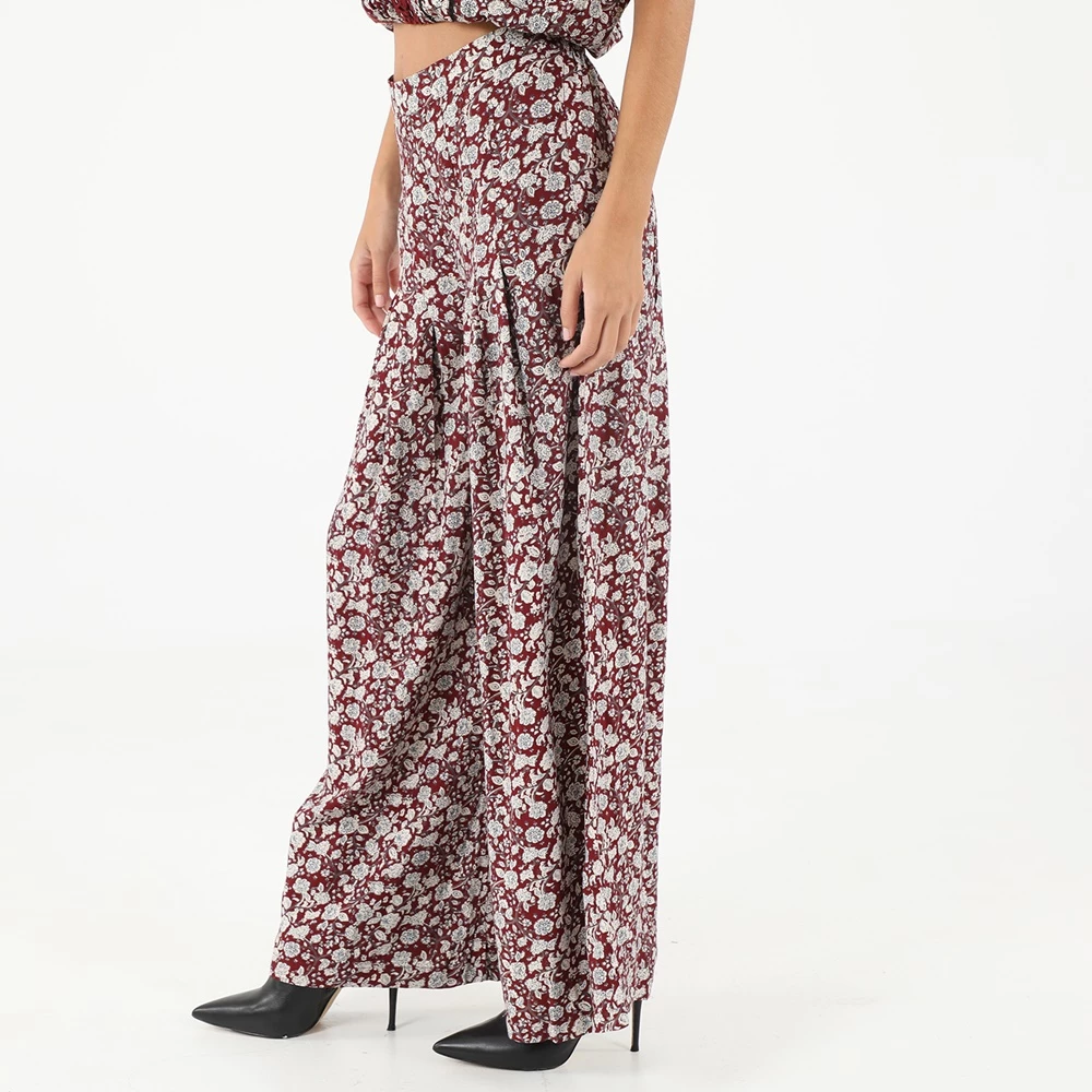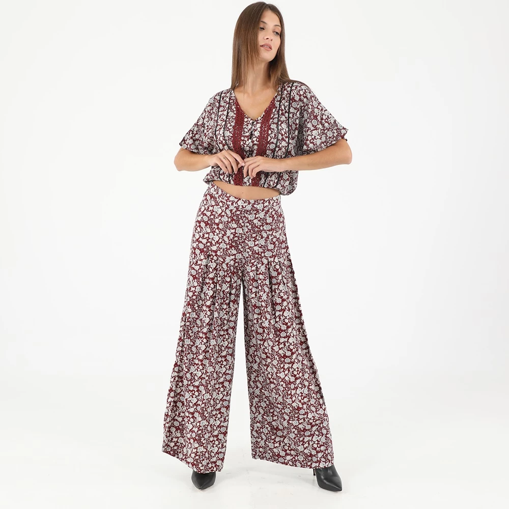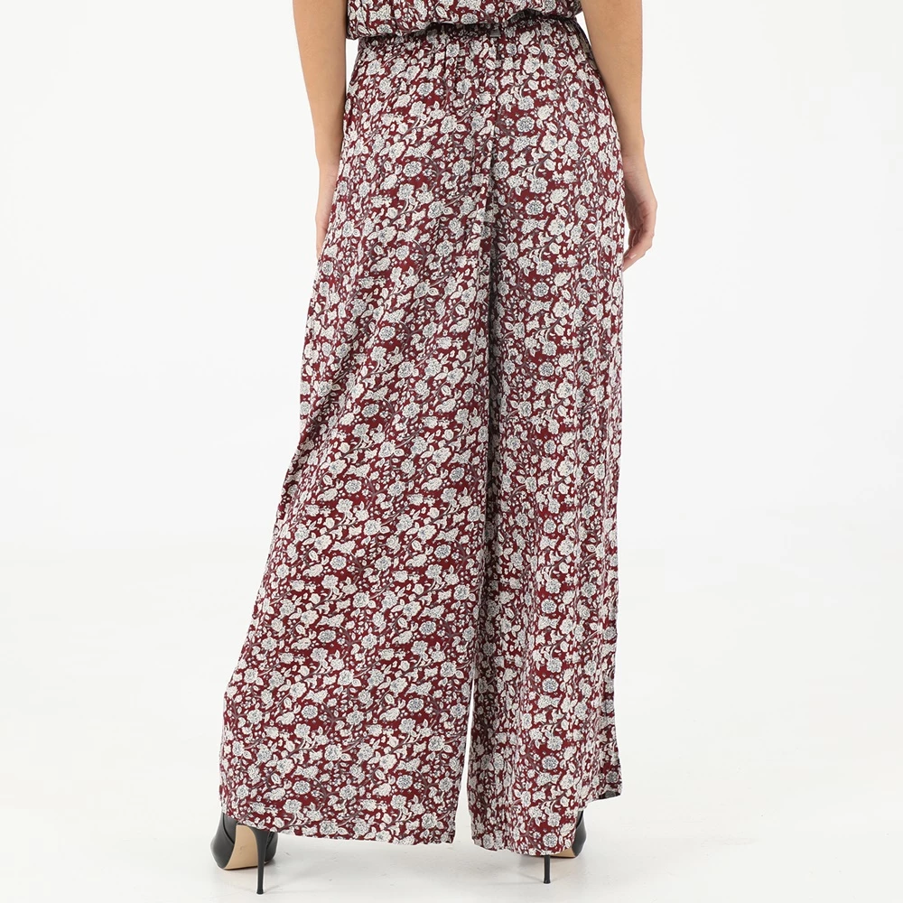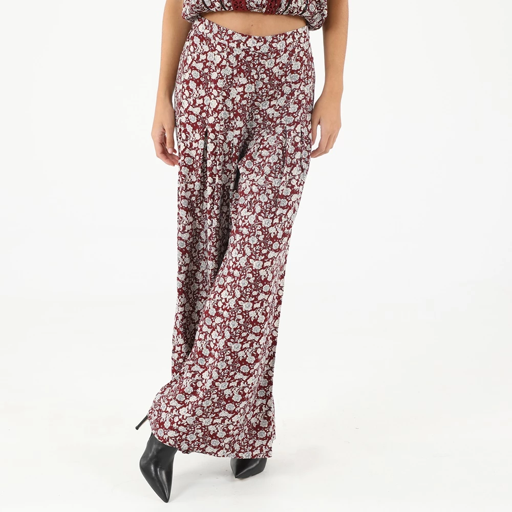 Γυναικεία wide leg παντελόνα ATTRATTIVO σε μπορντό απόχρωση, με εκρού floral μοτίβο. Είναι ψηλόμεση, σε φαρδιά γραμμή.