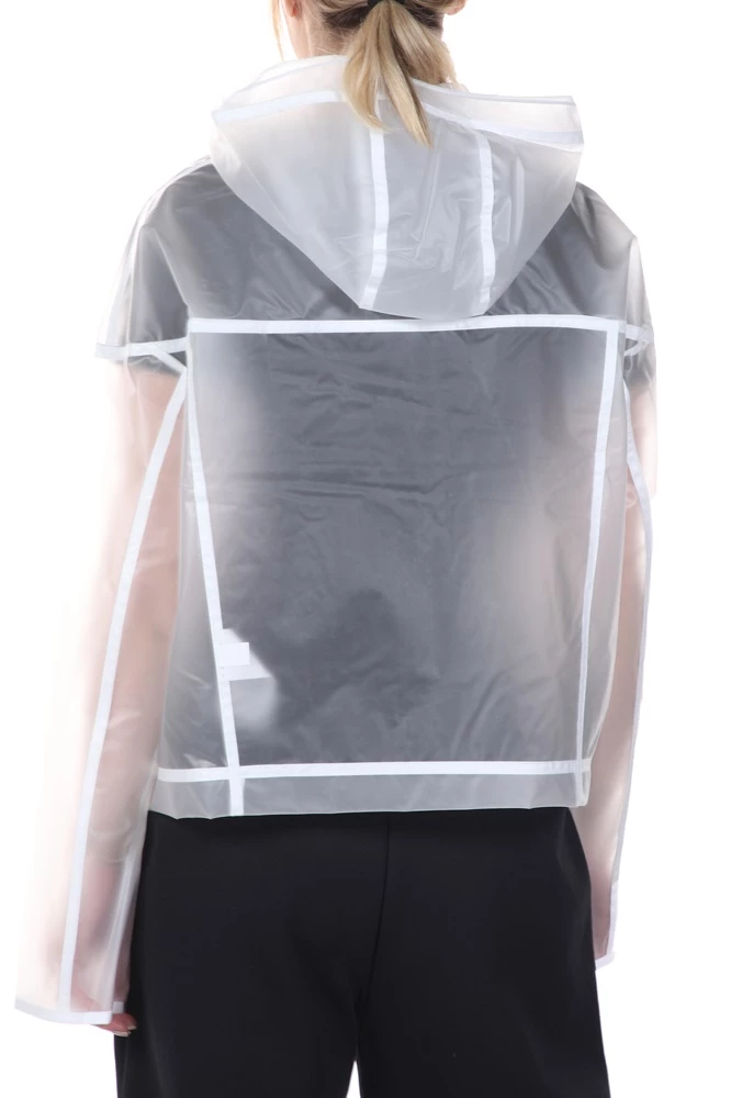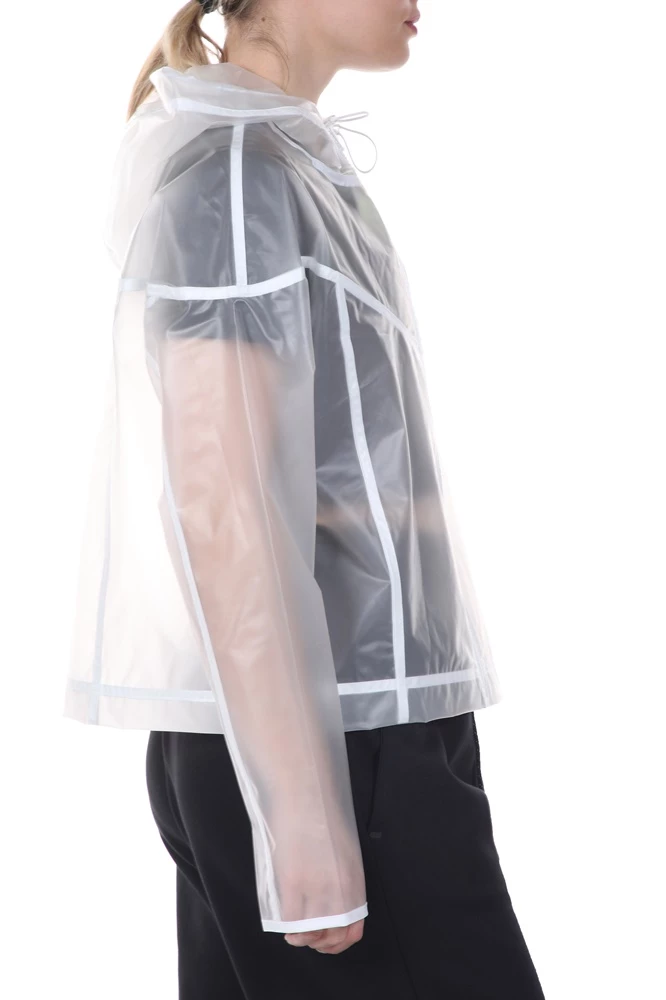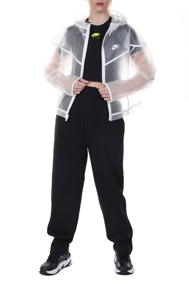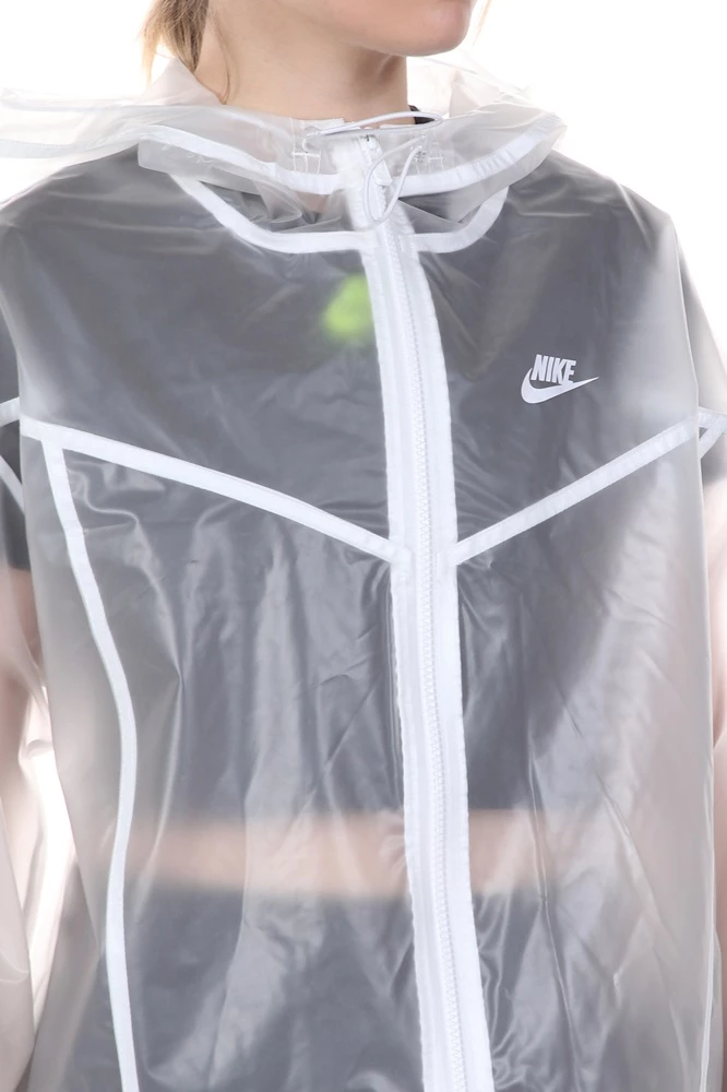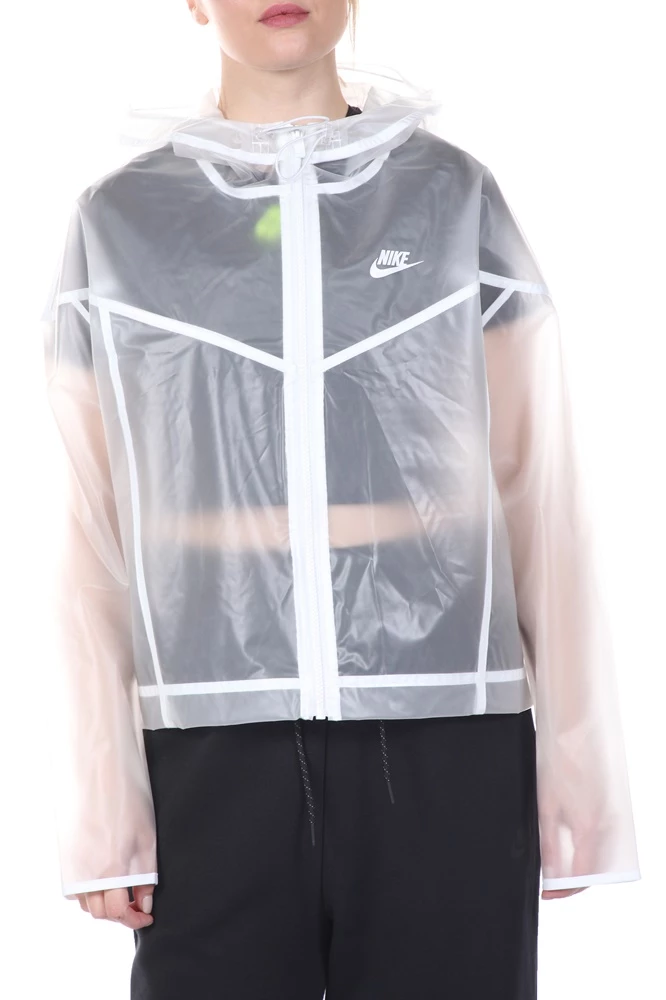 Γυναικείο αδιάβροχο jacket NIKE σε λευκό χρώμα. Από ημιδιάφανο ύφασμα, σε ίσια γραμμή. Έχει μακριά μανίκια, όρθια λαιμόκοψη και κουκούλα με ρυθμιζόμενο κορδόνι.