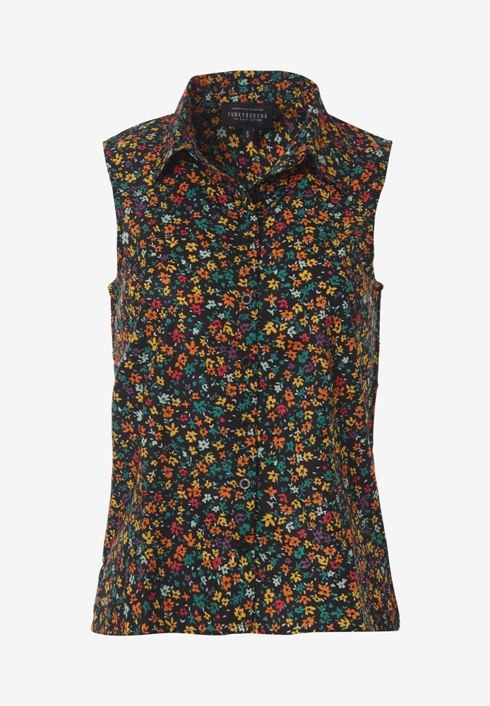 Γυναικείο αμάνικο πουκάμισο FUNKY BUDDHA με Floral τύπωμα. Σε ίσια γραμμή με κλασικό γιακά. Κλείνει με κουμπιά μπροστά.