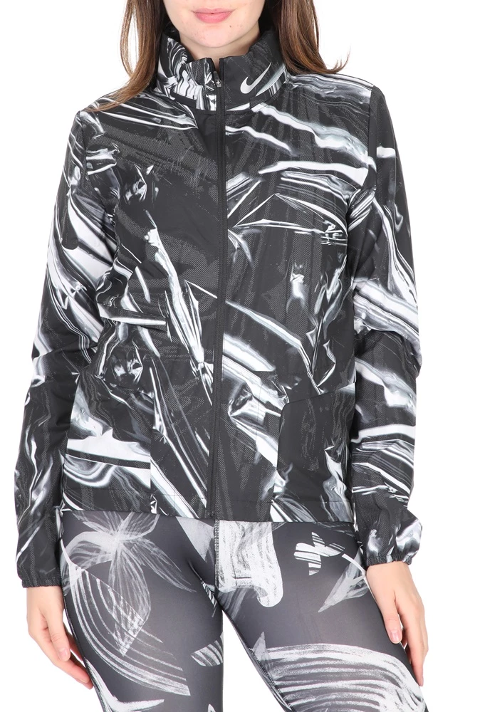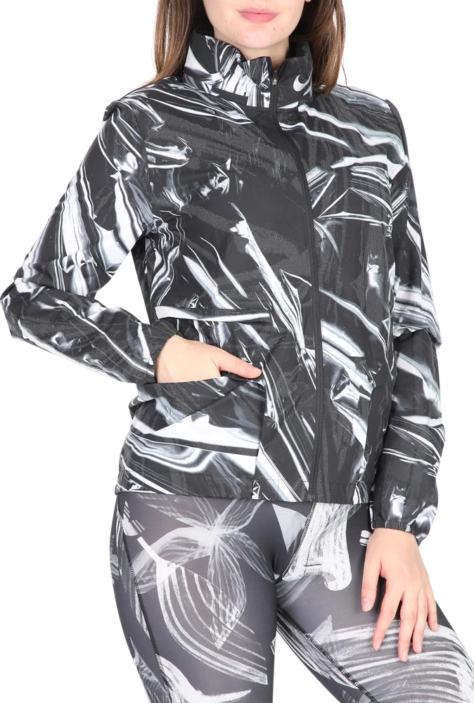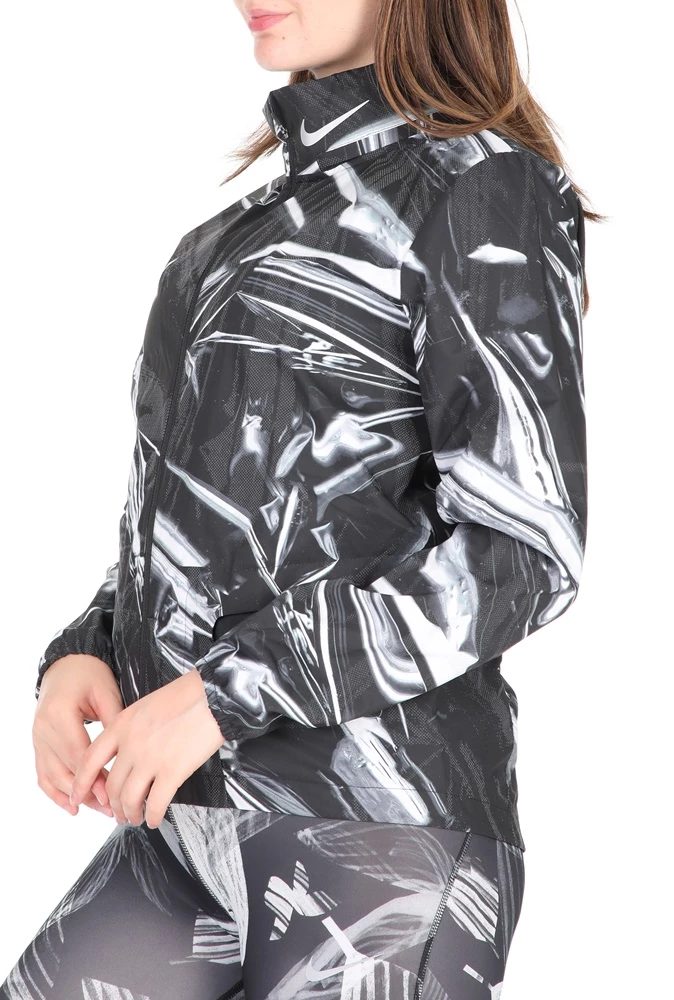 Γυναικείο αντιανεμικό τζάκετ NIKE SHLD JKT HD FL PR ασπρόμαυρο. Σε ίσια γραμμή, από ανάλαφρο ύφασμα. Μακριά μανίκια με λάστιχο στις μανσέτες και όρθιος γιακάς. Διαθέτει κρυφή κουκούλα στο γιακά και δύο τσέπες με φερμουάρ στα πλάγια. Κλείνει με φερμουάρ μπροστά.