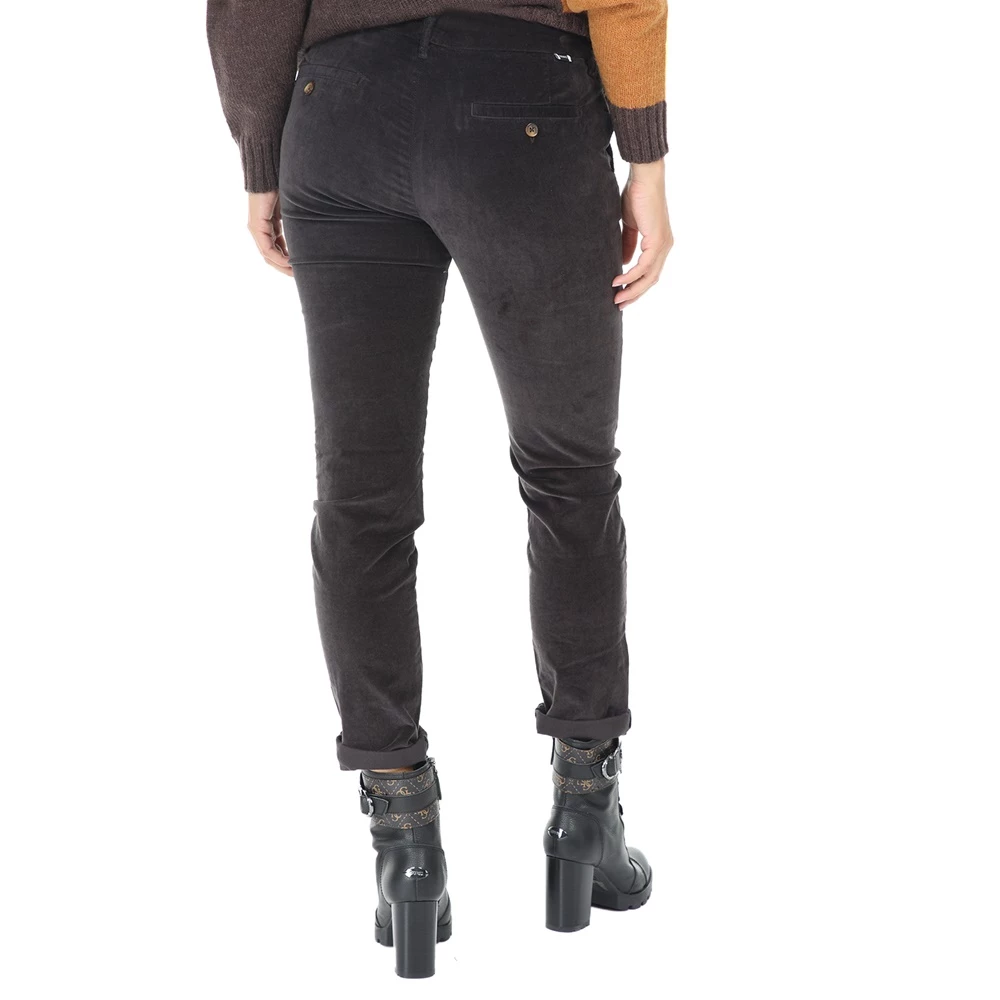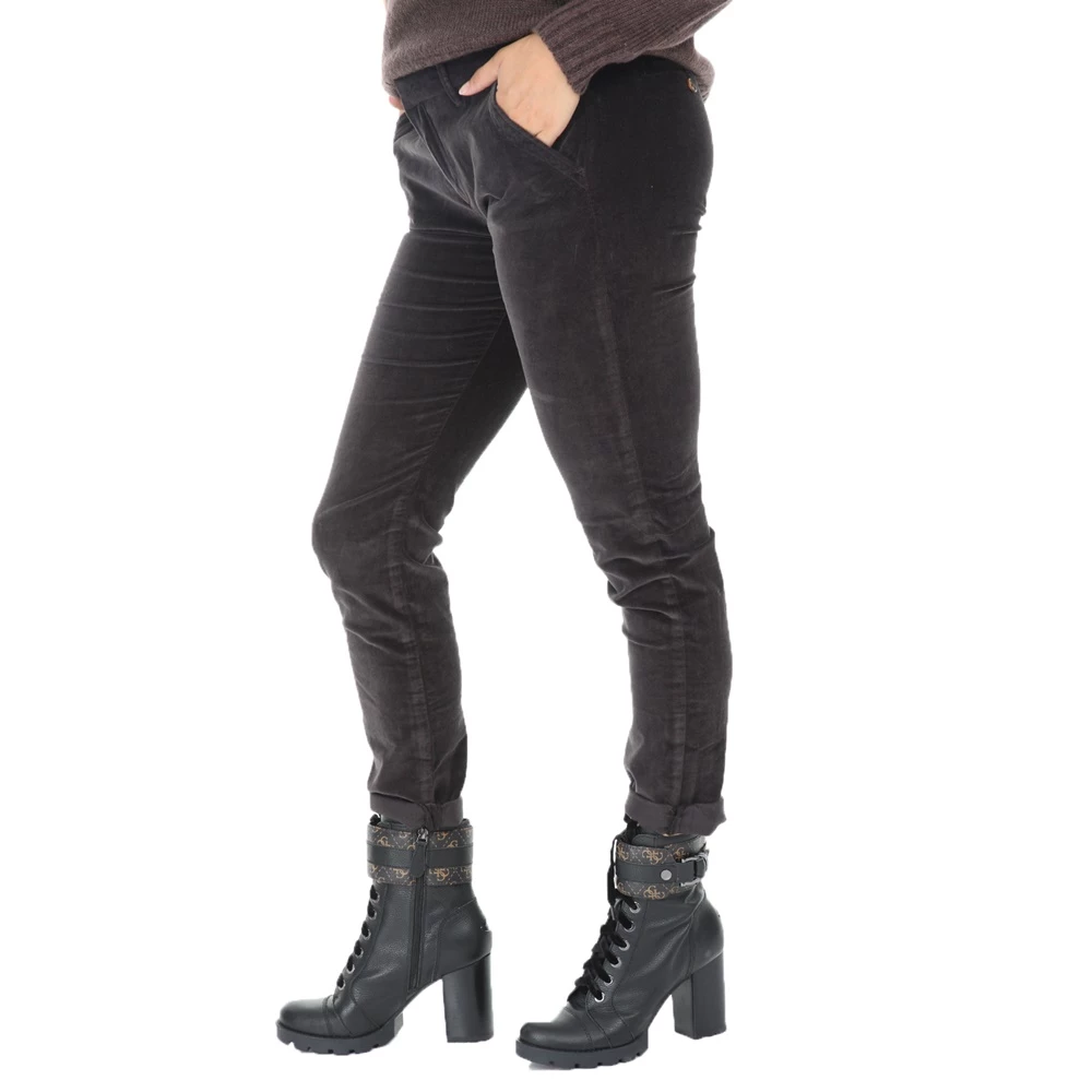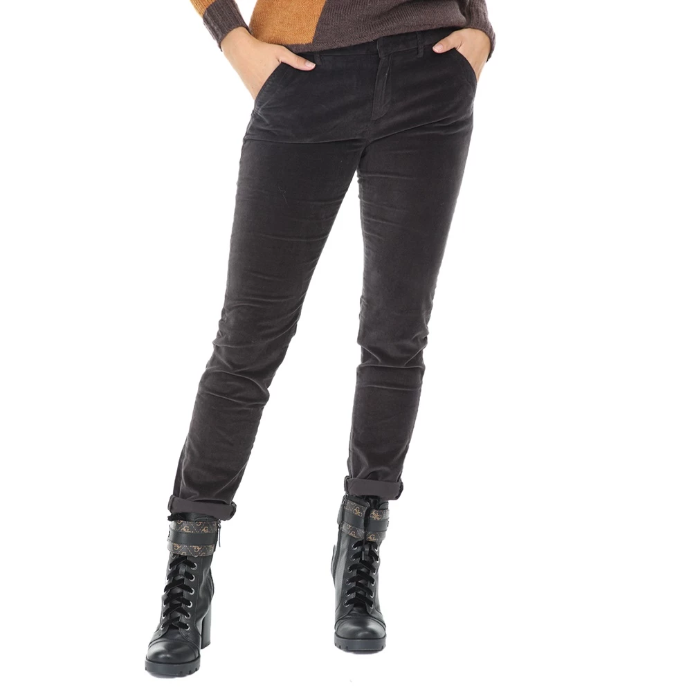 Γυναικείο κοτλέ chino παντελόνi REIKO σε σκούρο γκρι χρώμα. Σε ίσια γραμμή, με slim εφαρμογή. Διαθέτει δύο τσέπες στα πλάγια και δύο τσέπες πίσω. Θηλάκια για ζώνη στην μέση. Κλείνει με κουμπί και φερμουάρ μπροστά. Συνδυάστε το με ψηλοτάκουνα ή sneakers για άνετο στιλ.