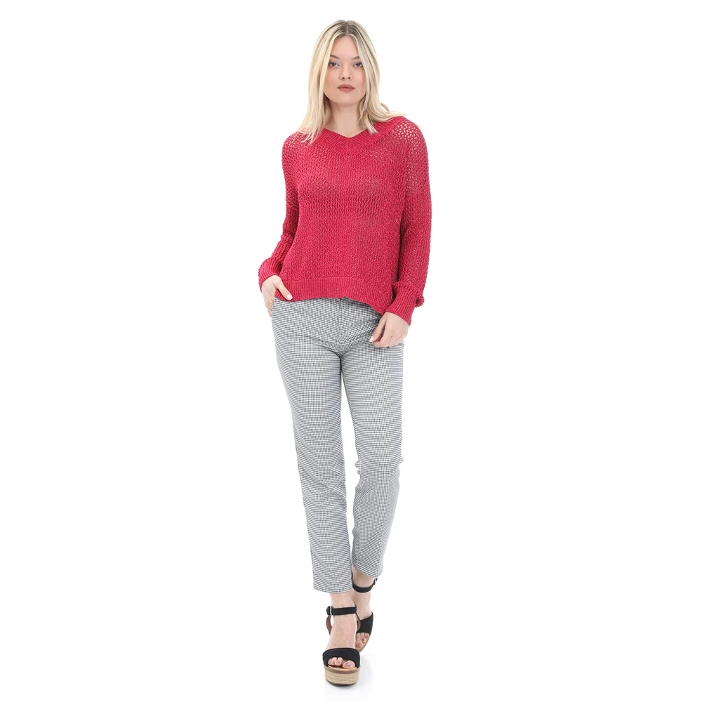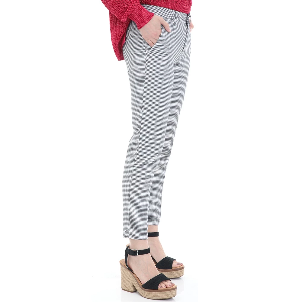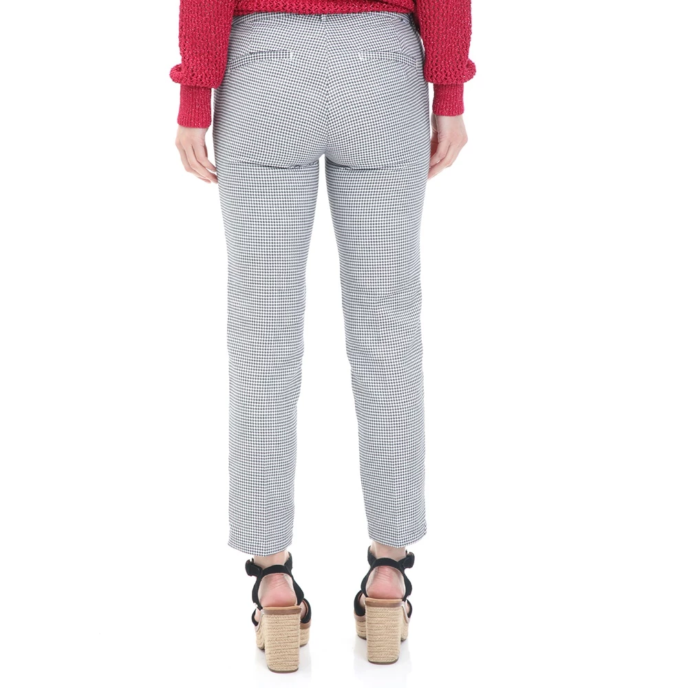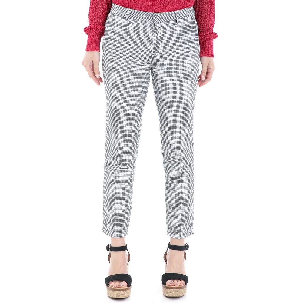 Γυναικείο cigarette παντελόνι REIKO με μπλε και λευκό μοτίβο pied de poule. Σε ίσια γραμμή, με μήκος μέχρι τον αστράγαλο. Διαθέτει δύο τσέπες στα πλάγια και δύο τσέπες πίσω. Κλείνει με κουμπί και φερμουάρ μπροστά.