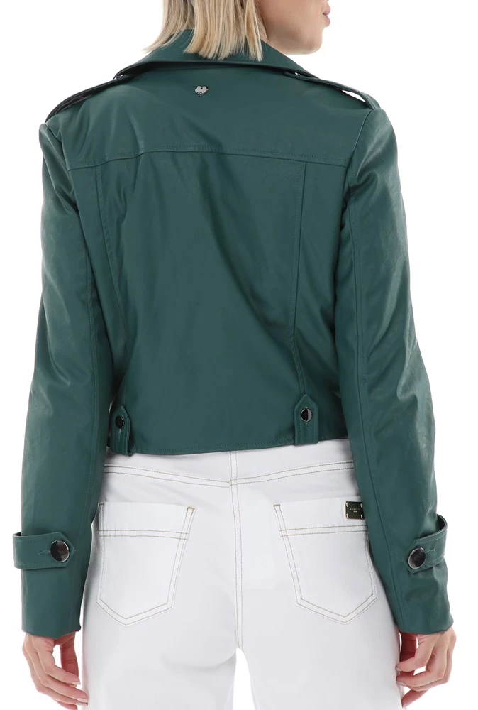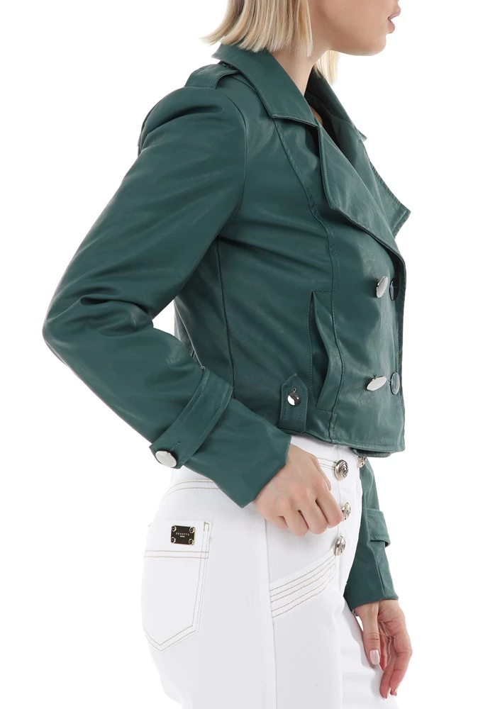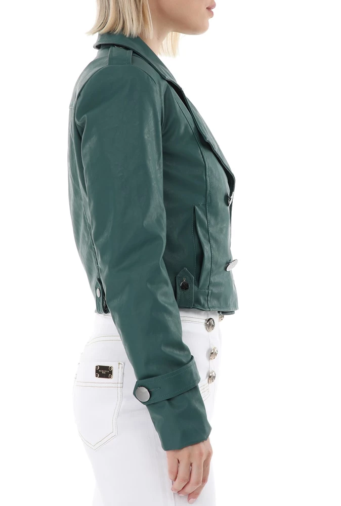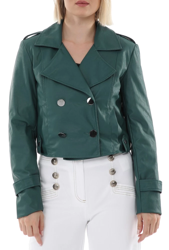 Γυναικείο cropped jacket MY TWINS σε γκριζοπράσινη απόχρωση. Με όψη δέρματος, σε ίσια γραμμή. Έχει μακριά μανίκια και μυτερό γιακά με πέτο. Διαθέτει δύο τσέπες στα πλάγια και κλείνει με μεγάλα μεταλλικά κουμπιά.
