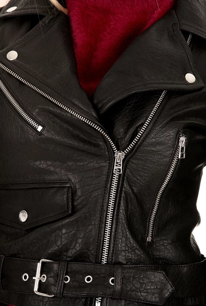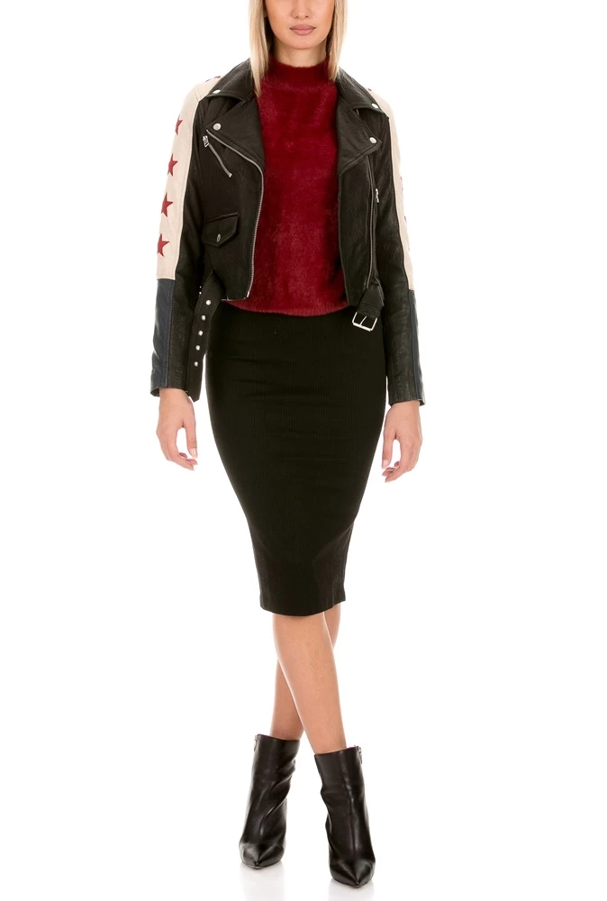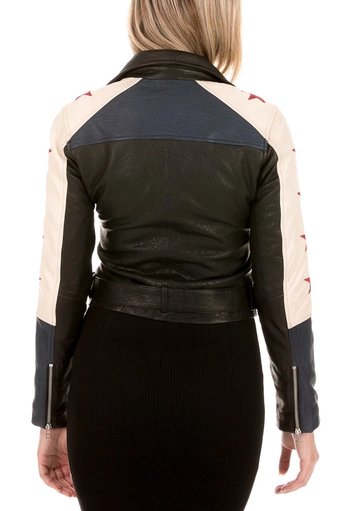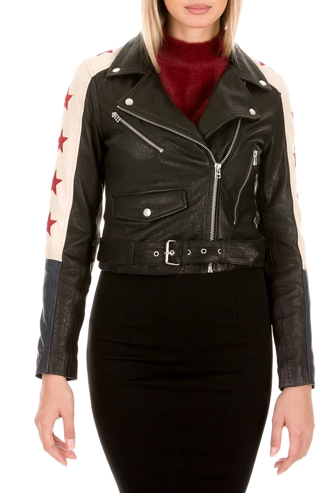Γυναικείο cropped δερμάτινο jacket GOOSECRAFT PEARL μαύρο, με λευκές φάσες στα μανίκια και μοτίβο από κόκκινα αστέρια. Μπλε δερμάτινες φάσες στην πλάτη και τις μανσέτες. Σε στιλ biker με σφιχτή εφαρμογή, από δέρμα υψηλής ποιότητας με κερωμένη επεξεργασία για φυσικά λαμπερή όψη. Έχει μακριά μανίκια με φερμουάρ στις μανσέτες και μυτερό γιακά με μεγάλο πέτο. Διαθέτει μία τσέπη με φερμουάρ στο στήθος και δύο τσέπες στα πλαϊνά. Ζώνη με μεταλλική αγκράφα στην βάση. Κλείνει με ασύμμετρο φερμουάρ μπροστά.