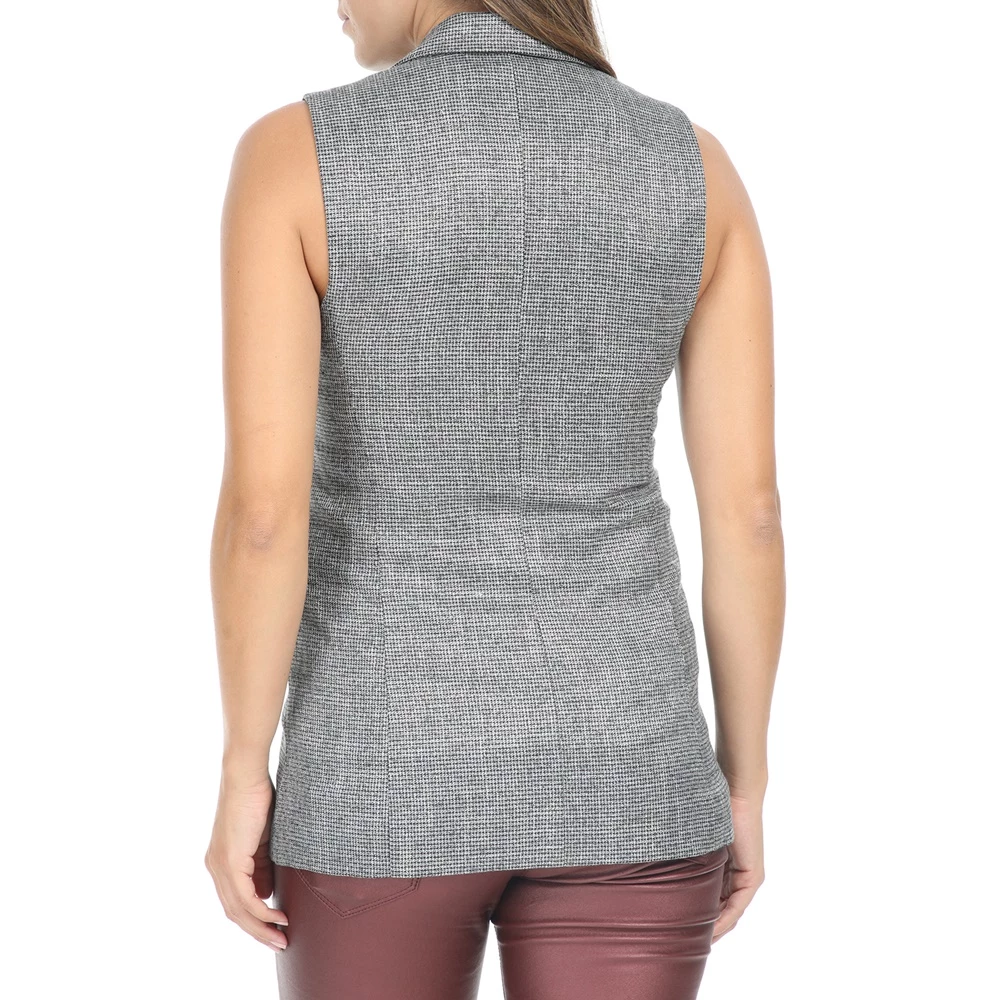Γυναικείο γιλέκο IMPERIAL σε γκρι απόχρωση με μοτίβο pied de pulle. Είναι αμάνικο, σε εφαρμοστή γραμμή, με κλασικό γιακά ταγιέρ και V λαιμόκοψη. Διαθέτει δύο τσέπες με καπάκι στα πλαϊνά και κλείνει με δύο μεγάλα κουμπιά μπροστά.