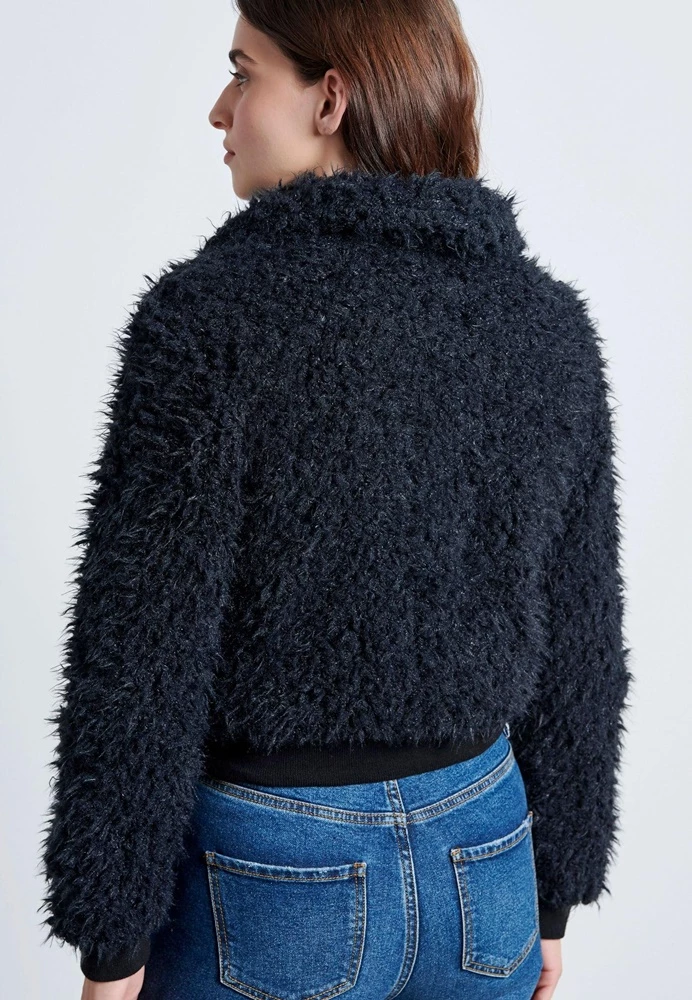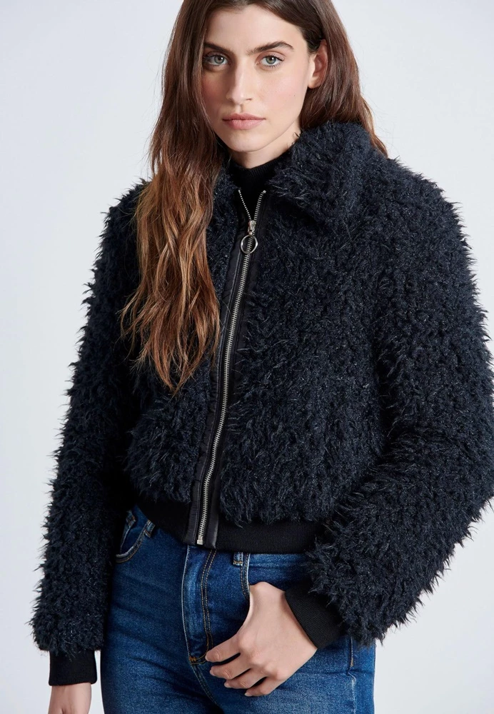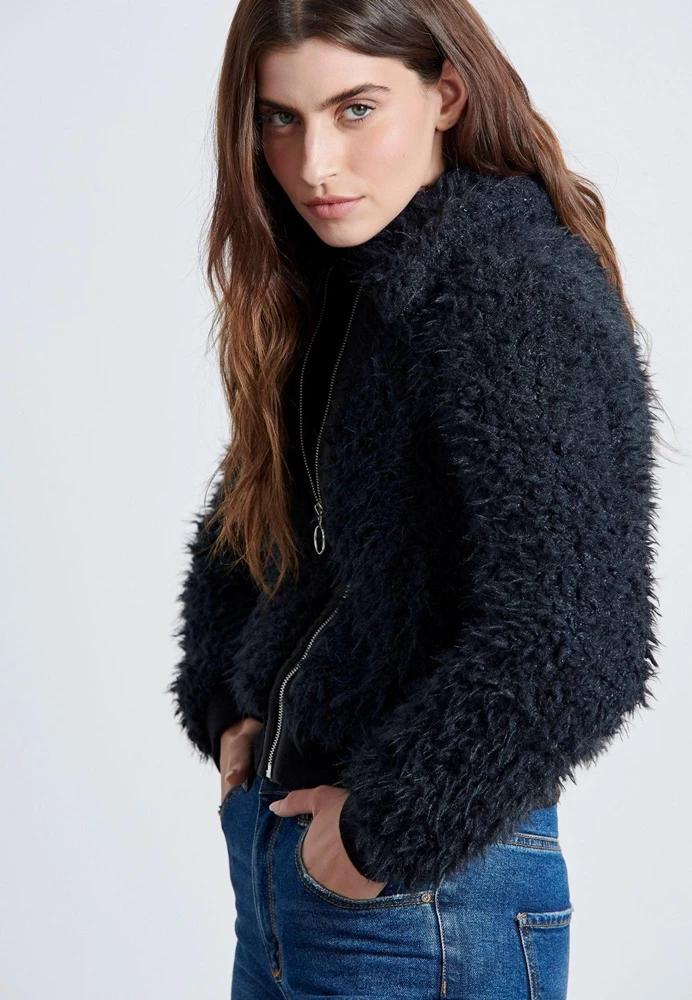 Γυναικείο γούνινο κοντό jacket bomber FUNKY BUDDHA σε μαύρο χρώμα.Είναι κατασκευασμένο απο οικολογική γούνα. Κλείνει με φερμουάρ. Διαθέτει εξωτερικές πλαϊνες τσέπες και έχει μανσέτες με πλέξη Rib.