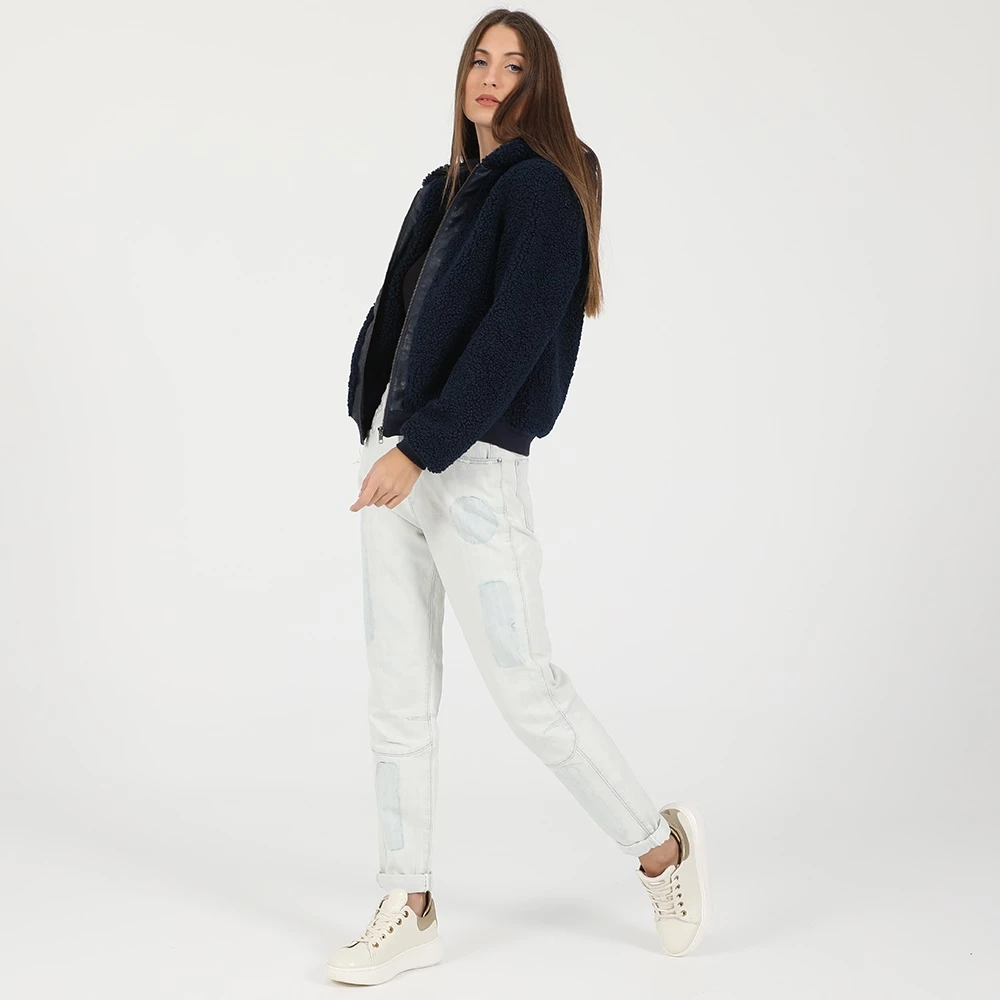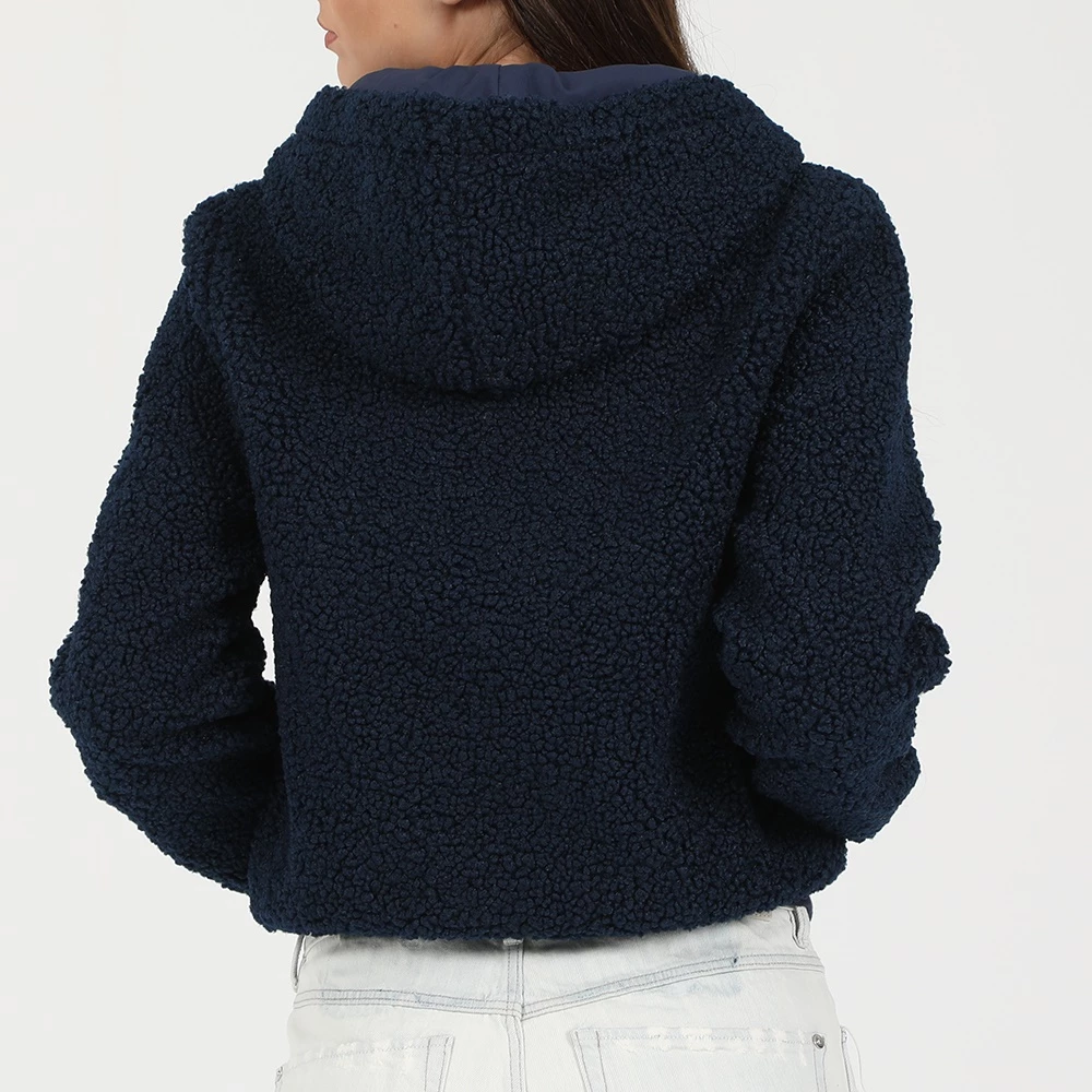 Γυναικείο jacket NU σε μπλε απόχρωση. Με κοντό μήκος από ζεστό και μαλακό sheepskin. Έχει μακριά μανίκια ακι στρογγυλή λαιμόκοψη. Διαθέτει κουκούλα και δύο τσέπες στα πλάγια. Κλείνει με κουμπιά μπροστά.