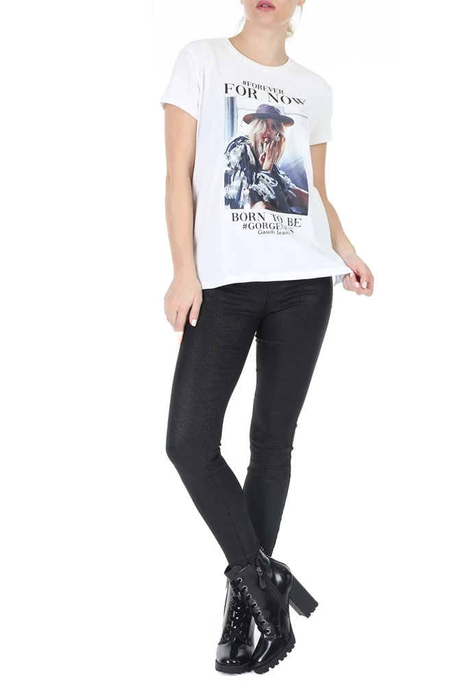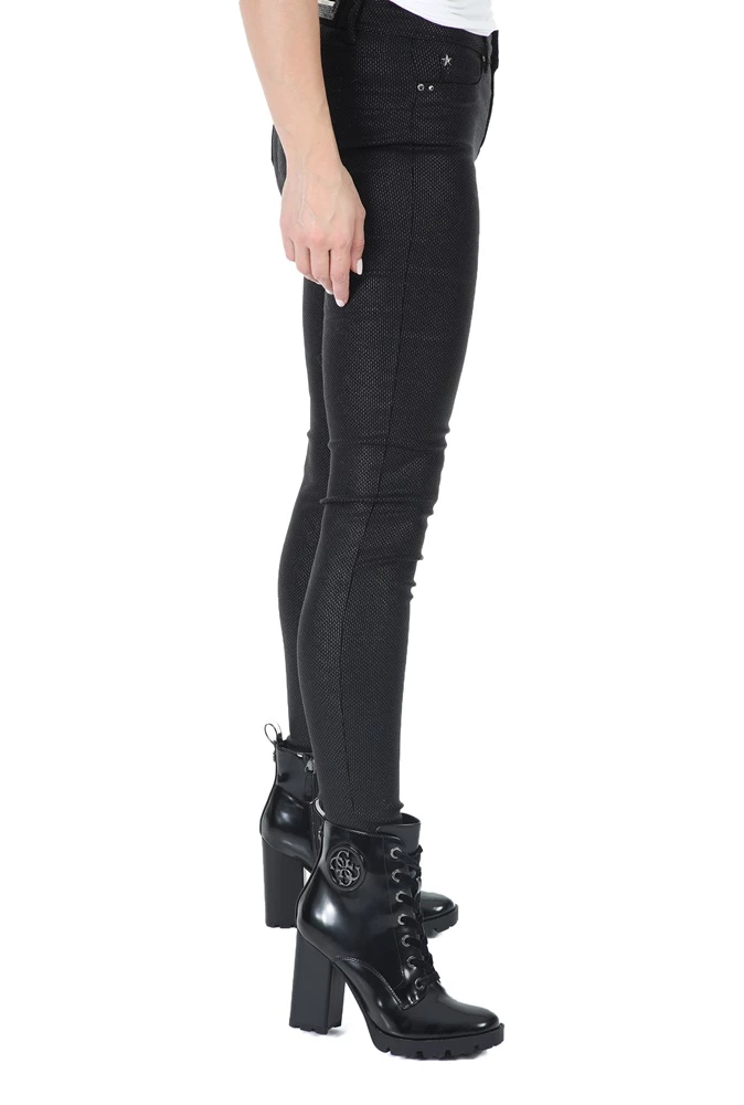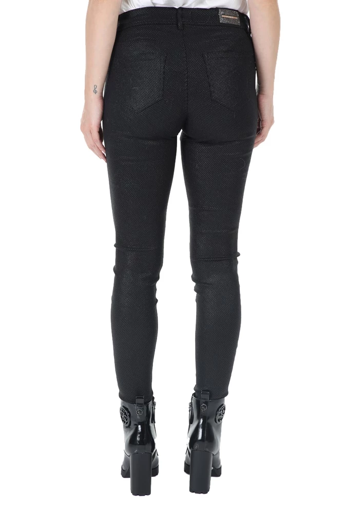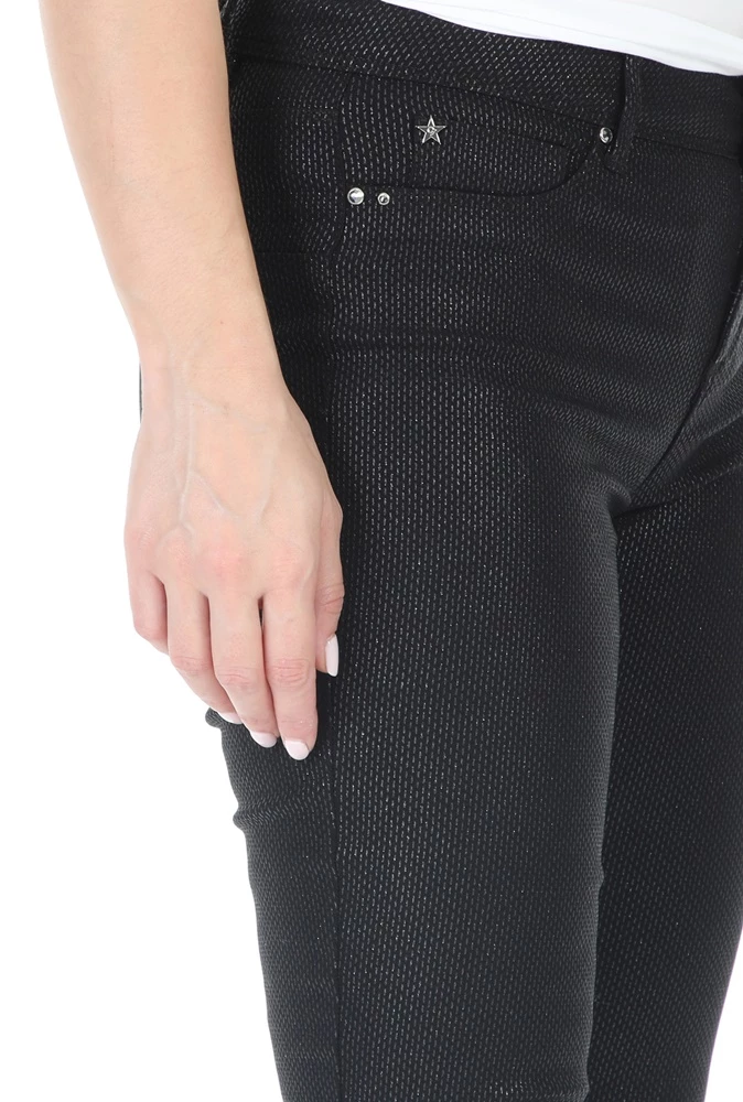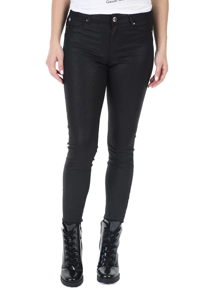 Γυναικείο jean παντελόνι GAUDI σε μαύρο χρώμα, με μοτίβα από ασημί μεταλλικό νήμα σε όλη την επιφάνεια. Σε skinny γραμμή, με μήκος 7/8. Διαθέτει δύο τσέπες μπροστά και δύο τσέπες πίσω. Κλείνει με μεταλλικό κουμπί και φερμουάρ.
