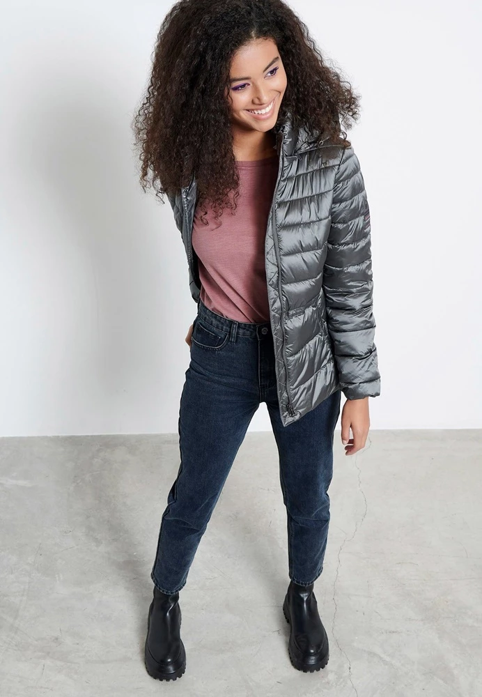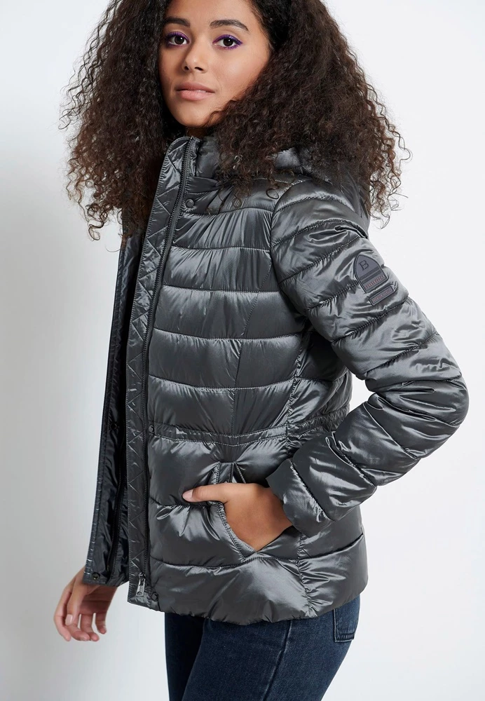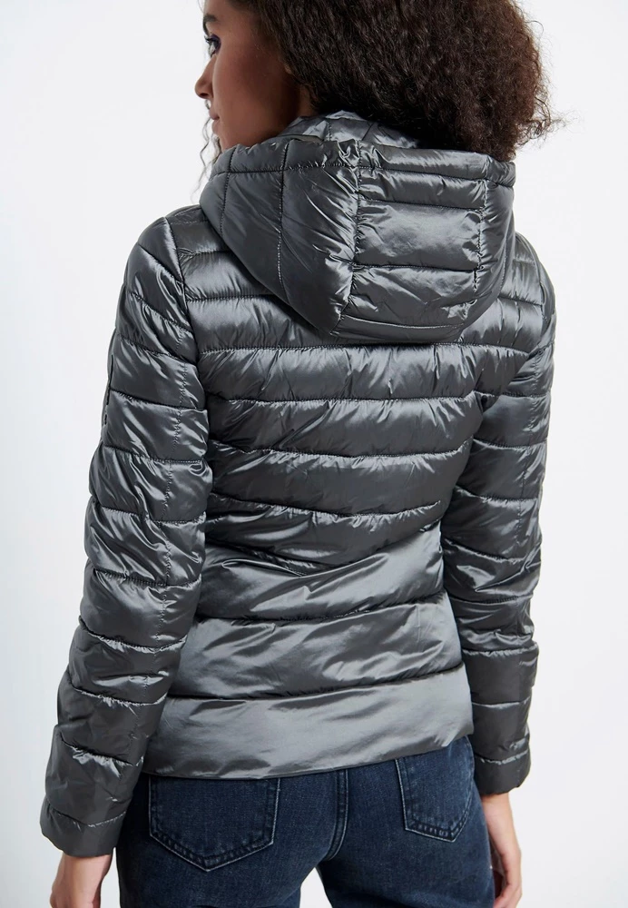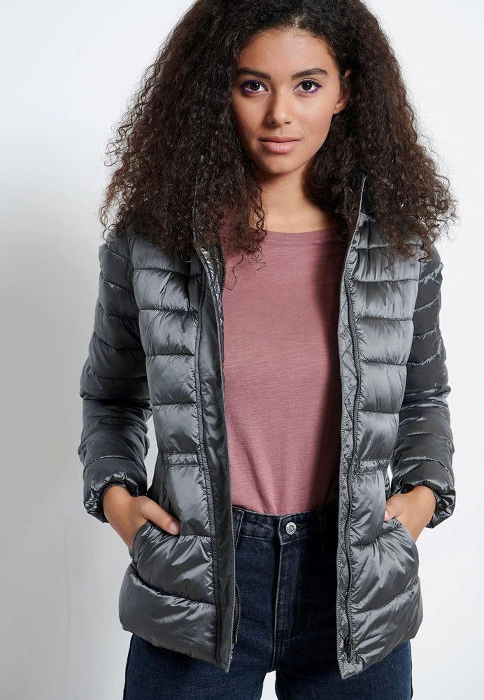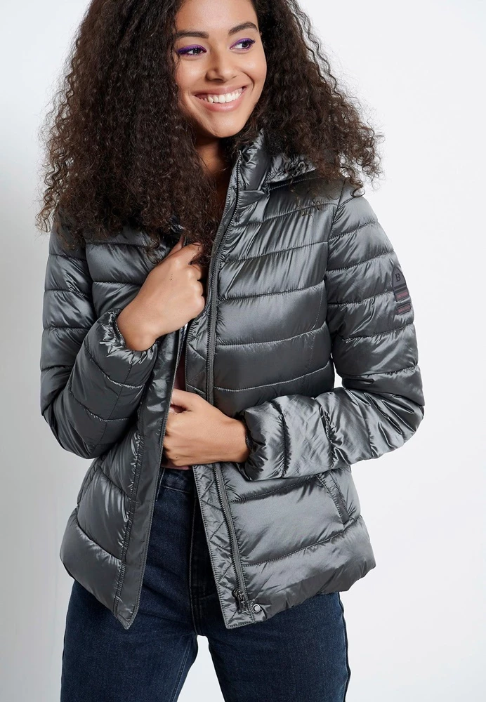 Γυναικείο μπουφάν FUNKY BUDDHA σε ασημί απόχρωση, με καπιτονέ όψη. Είναι σε ίσια γραμμή, με μακριά μανίκια και όρθια λαιμόκοψη. Διαθέτει κουκούλα, δύο τσέπες στα πλάγια και κλείνει με φερμουάρ μπροστά και κουμπί snap στην βάση.