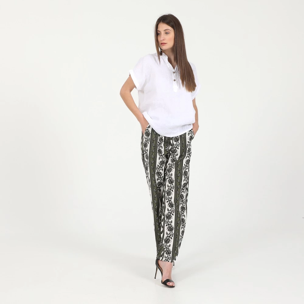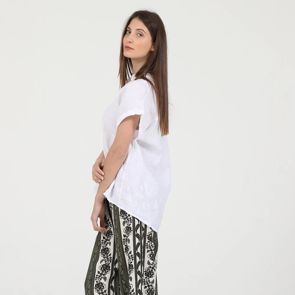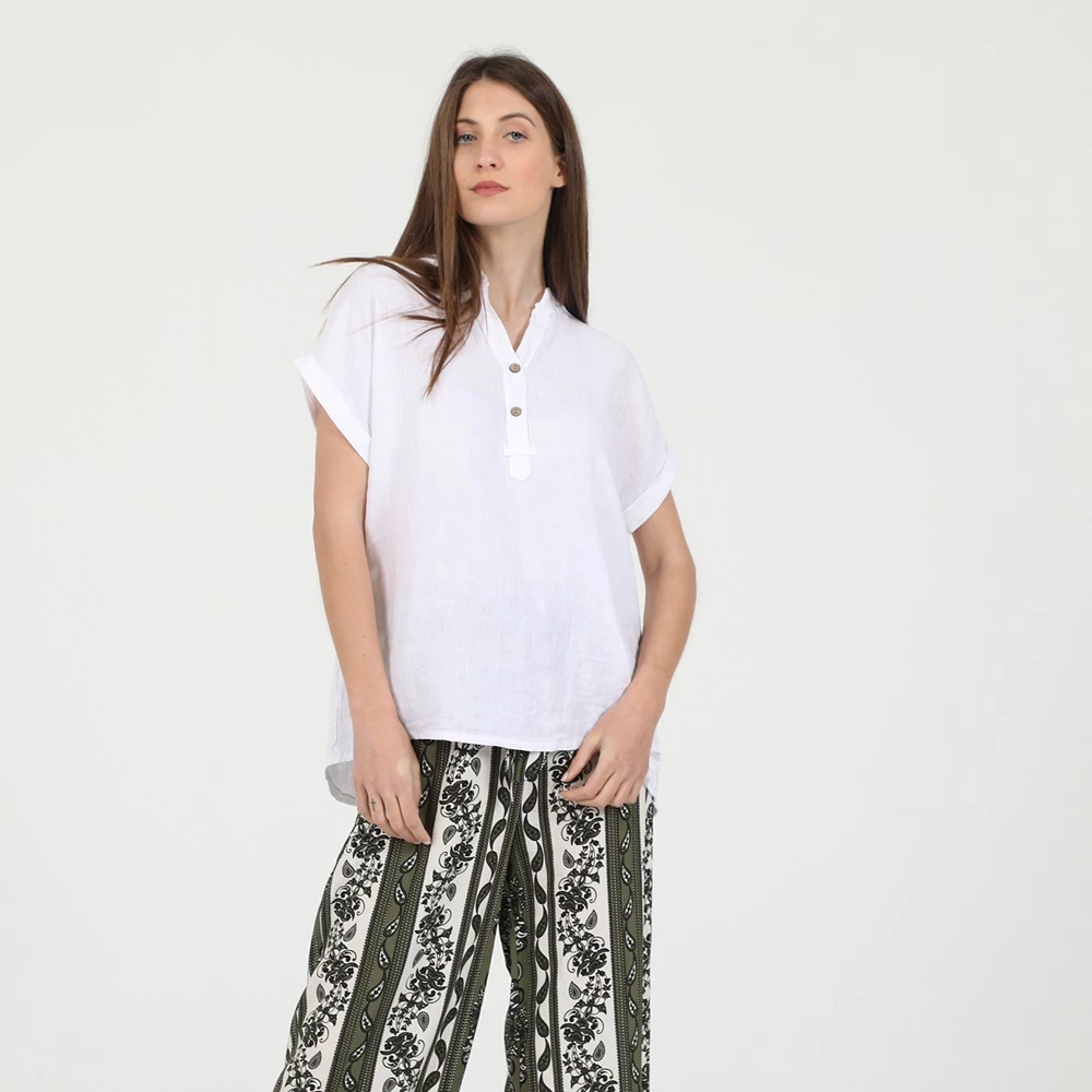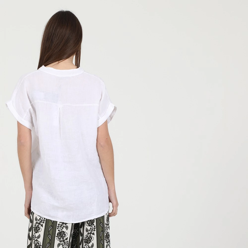 Γυναικείο λινό πουκάμισο ATTRATTIVO σε λευκό χρώμα. Έχει κοντά μανίκια με ρεβέρ και mao γιακά, με V λαιμοκοψη και κουμπάκια.