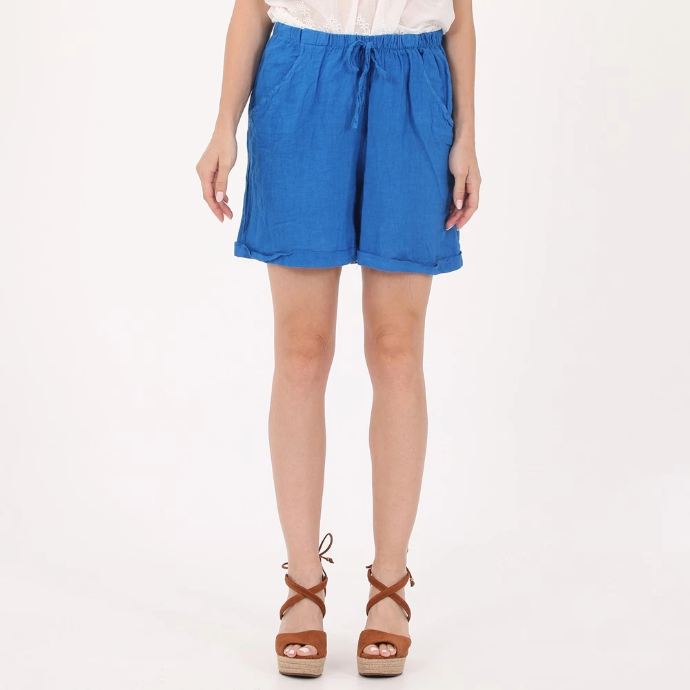 Γυναικείο σορτς ATTRATTIVO σε μπλε χρώμα. Από λινό ύφασμα, με αέρινη γραμμή, τσέπες στο πλάι και λάστιχο στη μέση για άνετη εφαρμογή.