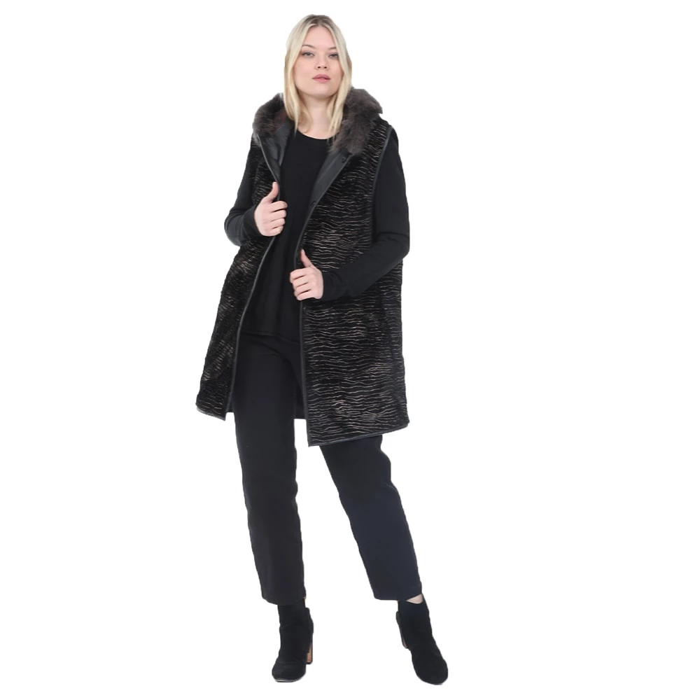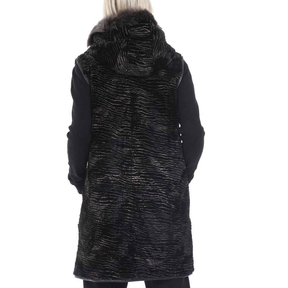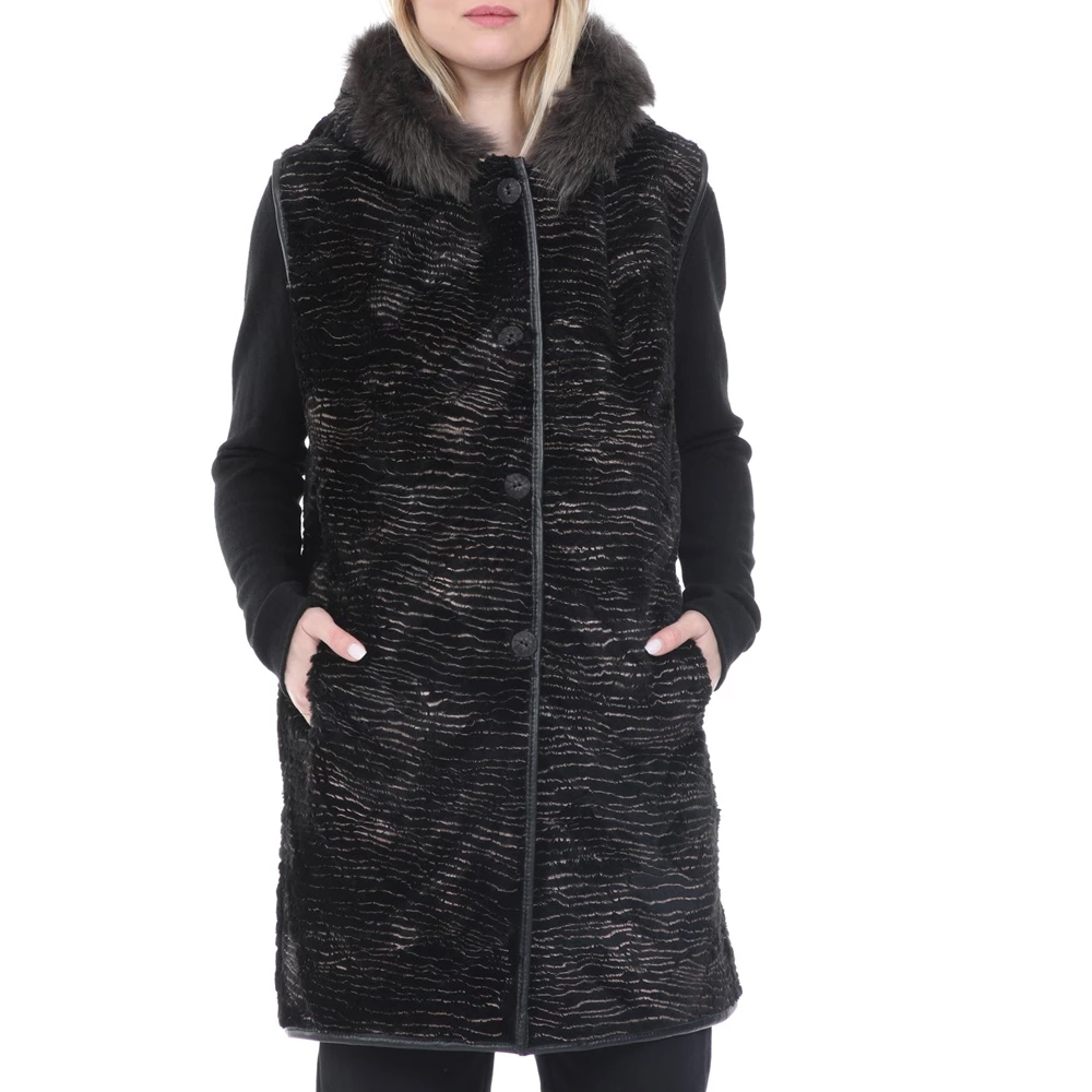 Γυναικείο μακρύ γιλέκο RITSELFURS σε μαύρο χρώμα, με κεντημένα μοτίβα σε όλη την επιφάνεια. Σε ίσια γραμμή, από δέρμα και γούνα. Διαθέτει κουκούλα και δύο τσέπες στα πλάγια. Κλείνει με κουμπιά μπροστά.