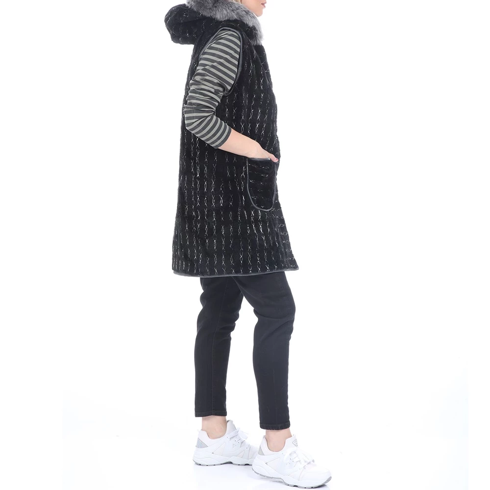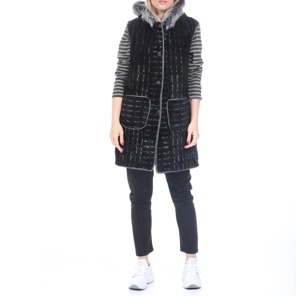 Γυναικείο μακρύ γιλέκο RITSELFURS σε πράσινη απόχρωση. Σε ίσια γραμμή, από δέρμα και γούνα. Διαθέτει κουκούλα και δύο τσέπες μπροστά. Κλείνει με κουμπιά μπροστά.
