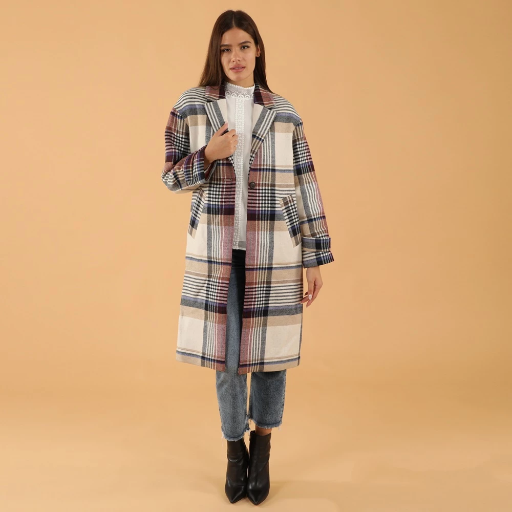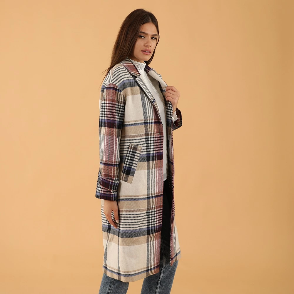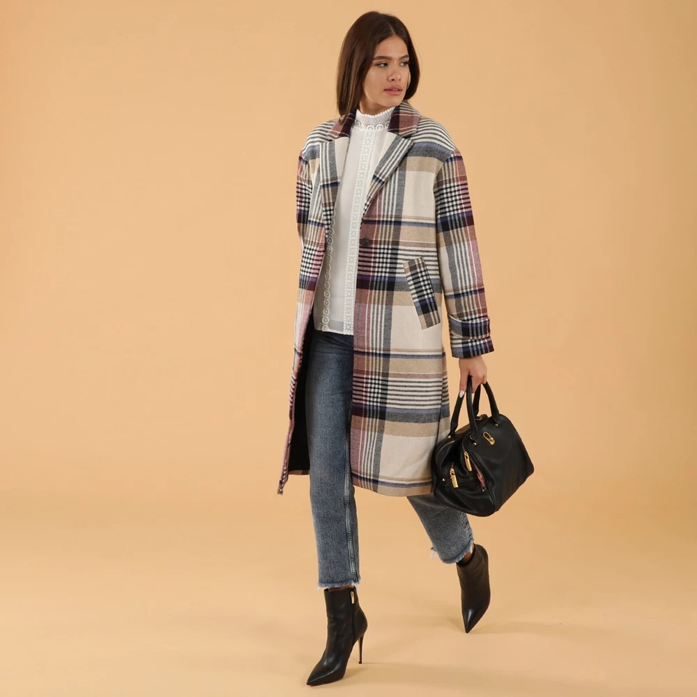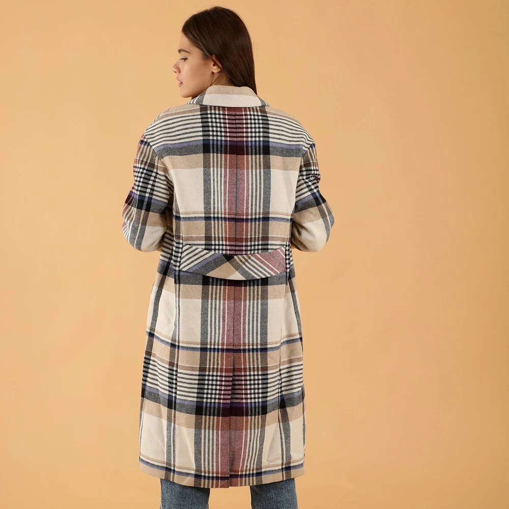 Γυναικείο μακρύ παλτό GANT σε μπεζ απόχρωση, με πολύχρωμο καρό μοτίβο. Σε μεσάτη γραμμή, από ζεστή μάλλινη σύνθεση. Διαθέτει δύο τσέπες στα πλάγια, κλασικό γιακά με πέτο και κλείνει με ένα κουμπί μπροστά.