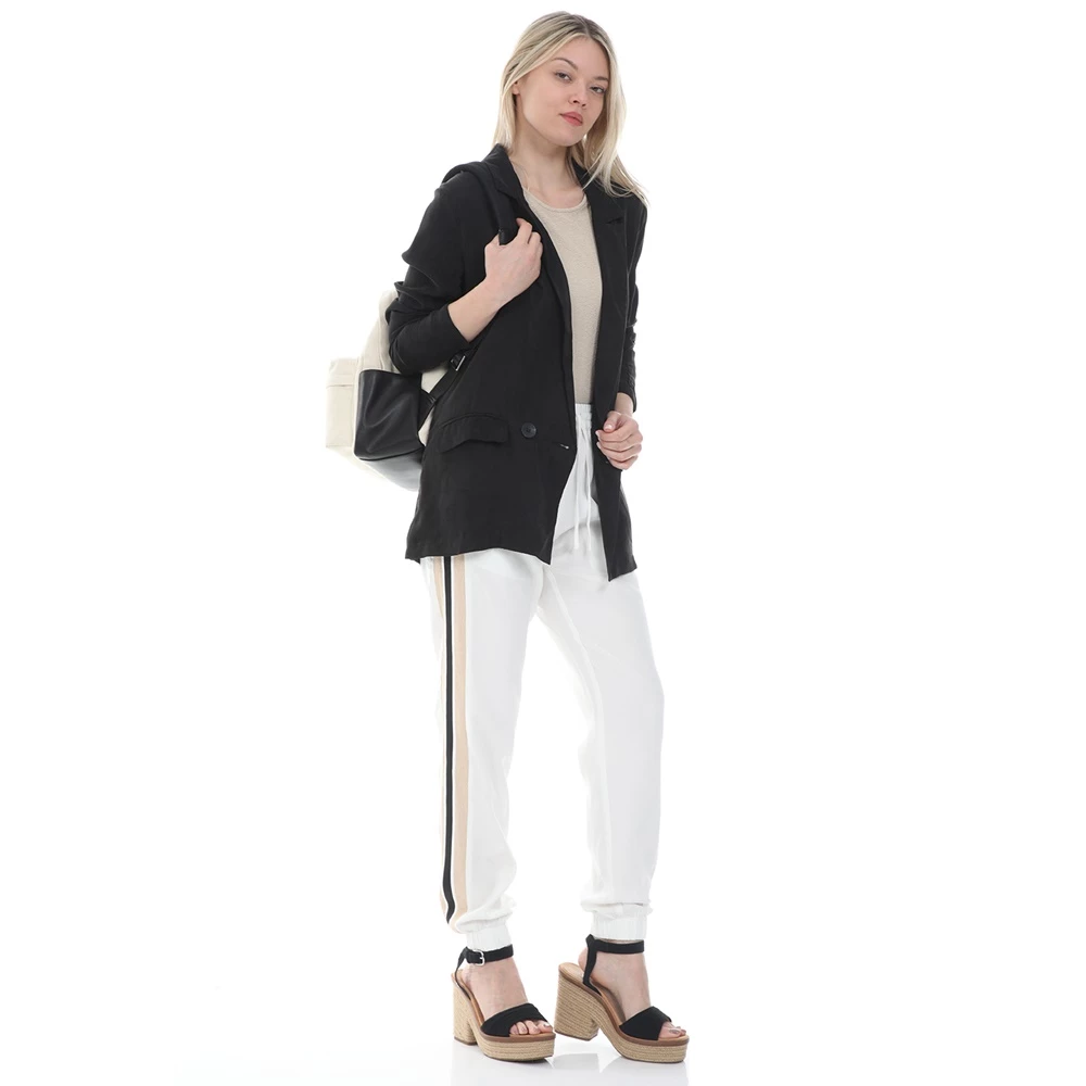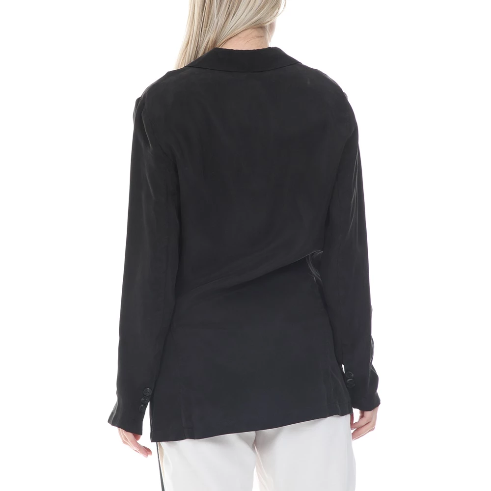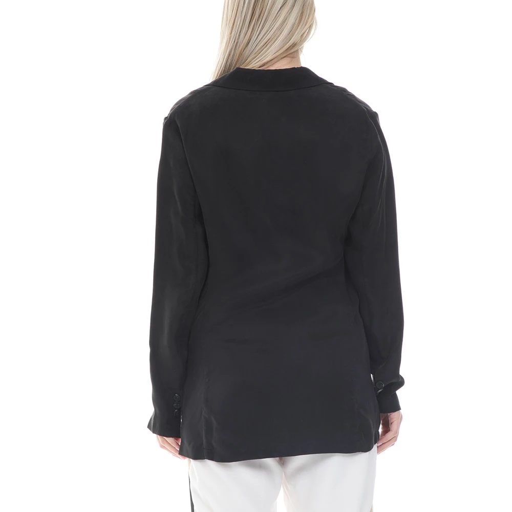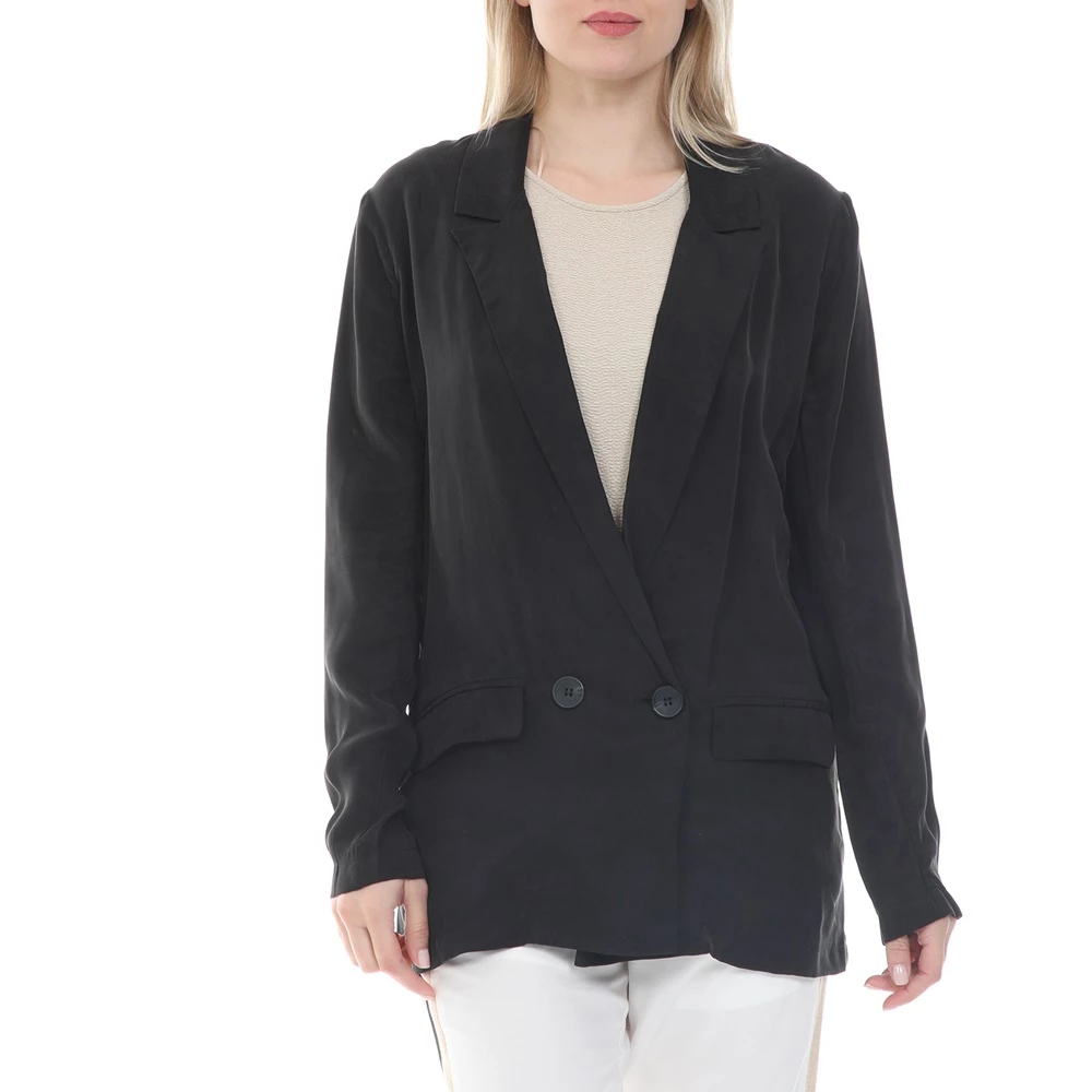 Γυναικείο μακρύ σακάκι NU σε μαύρο χρώμα. Σε ίσια γραμμή, με κλασικό γιακά και μακριά μανίκια. Διαθέτει δύο τσέπες με καπάκι στα πλάγια και κλείνει σταυρωτά με κουμπί μπροστά.