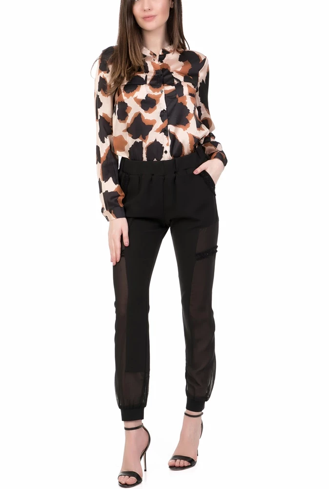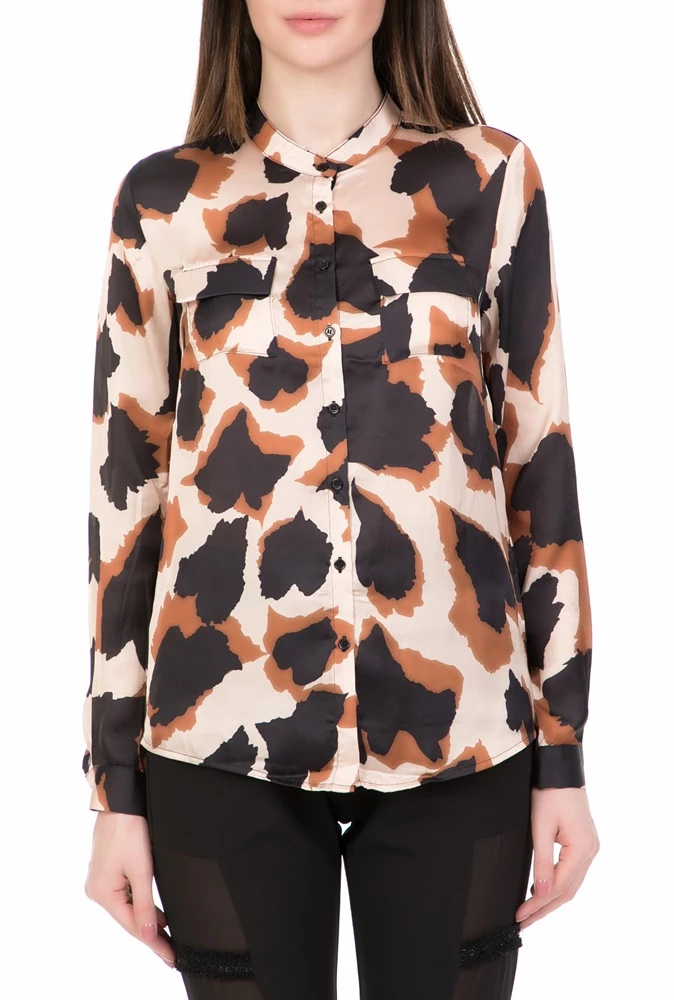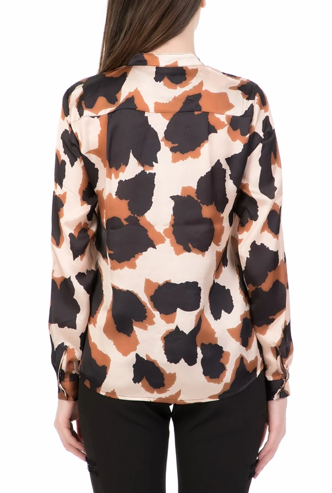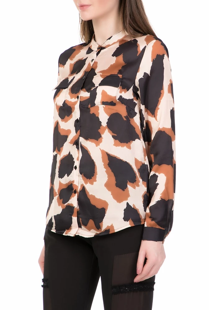 Γυναικείο μακρυμάνικο σε μπεζ καφέ απόχρωση πουκάμισο με εμπριμέ σχέδιο και άνετη γραμμή. Συνδυάστε το με παντελόνι για κομψές εμφανίσεις.