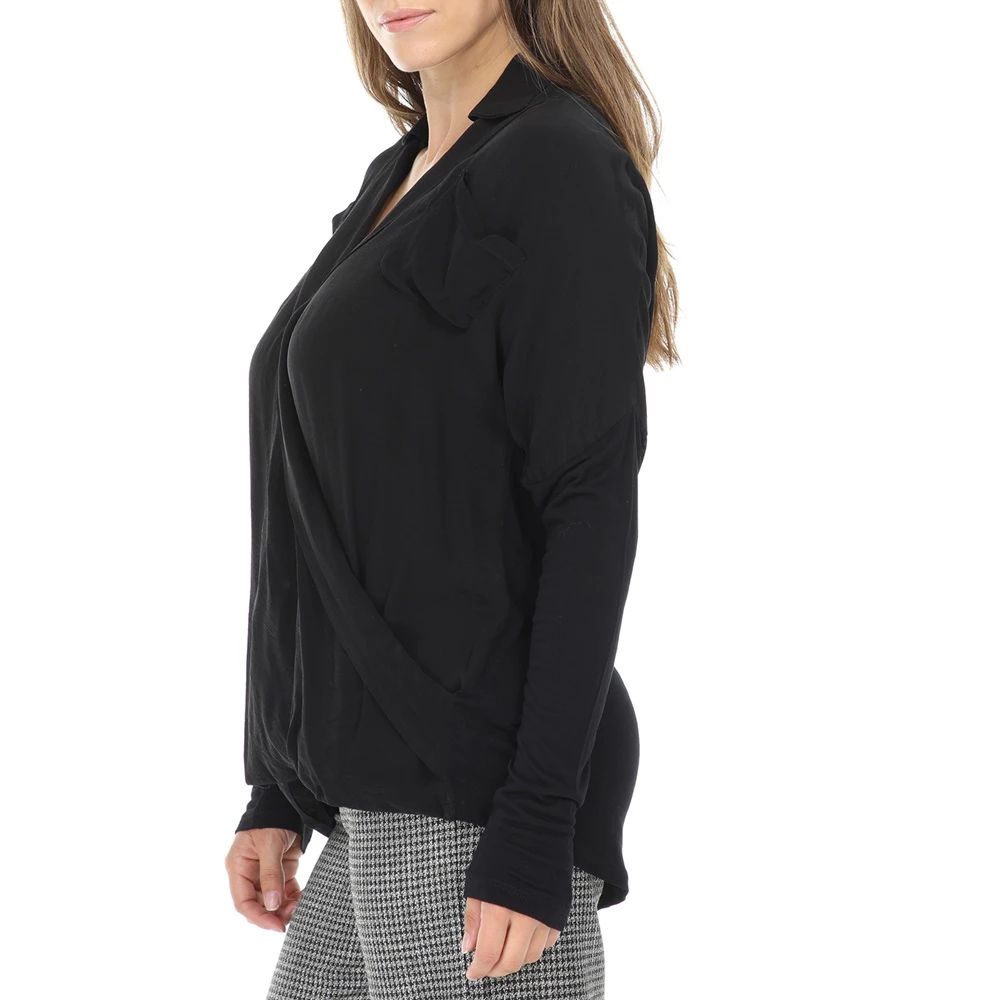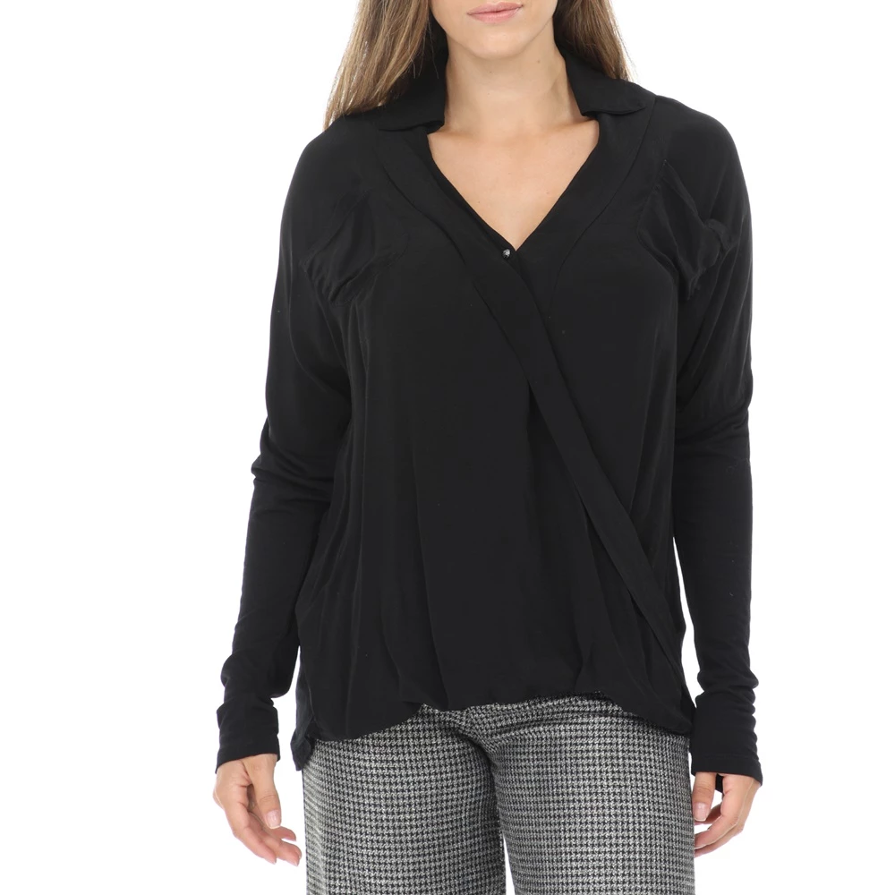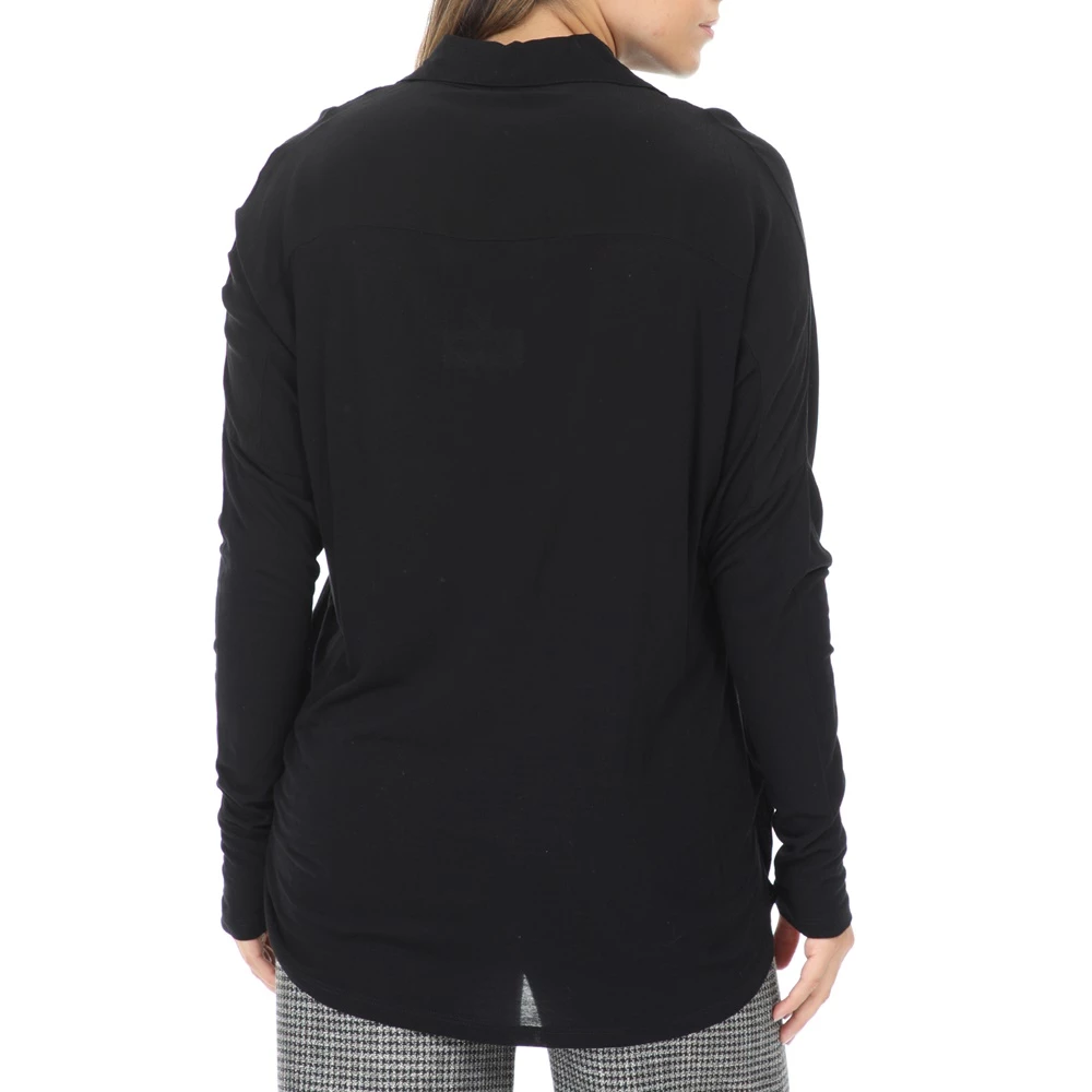 Γυναικείο μακρυμάνικο πουκάμισο-τοπ NU σε μαύρο χρώμα. Κρουαζέ σχέδιο με ένα κουμπί, τσέπες στο στήθος, γιακάς και μακρύ μήκος.