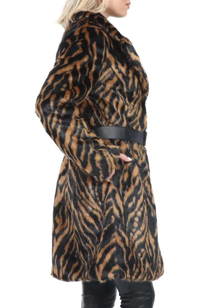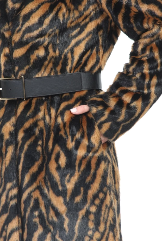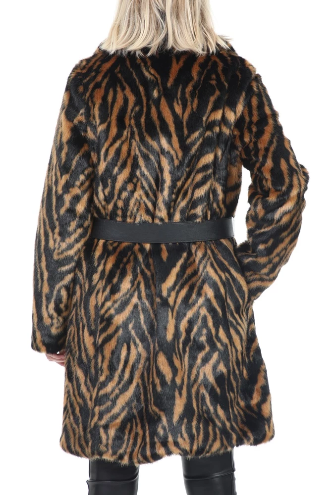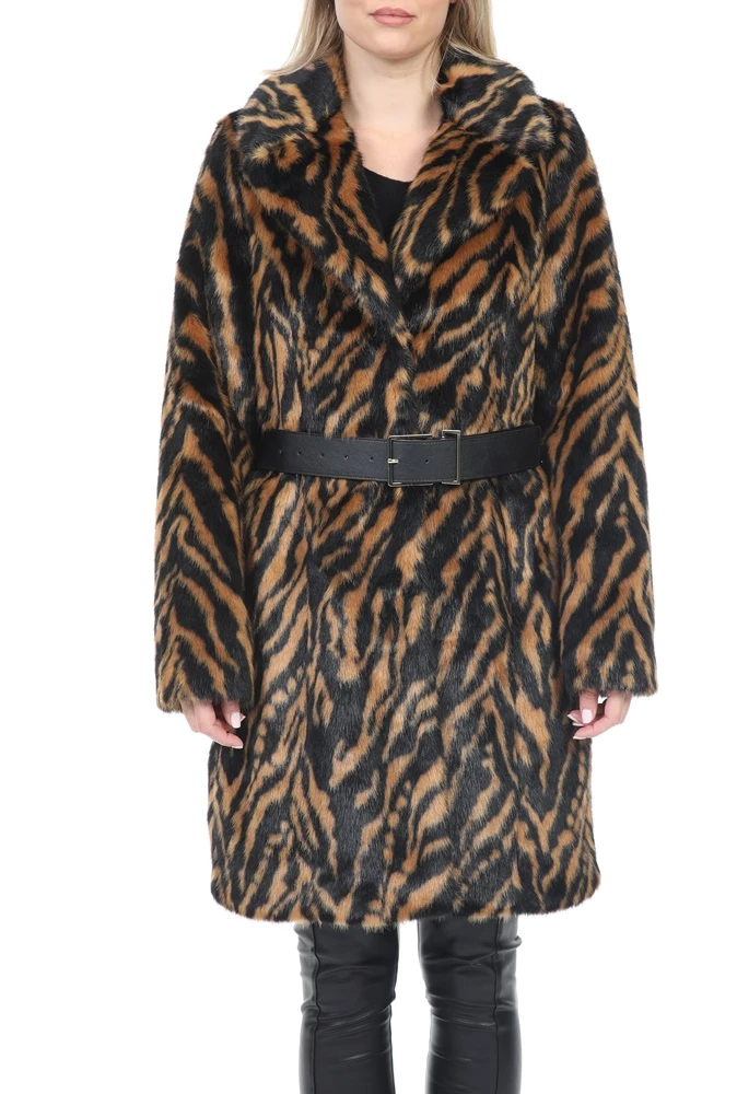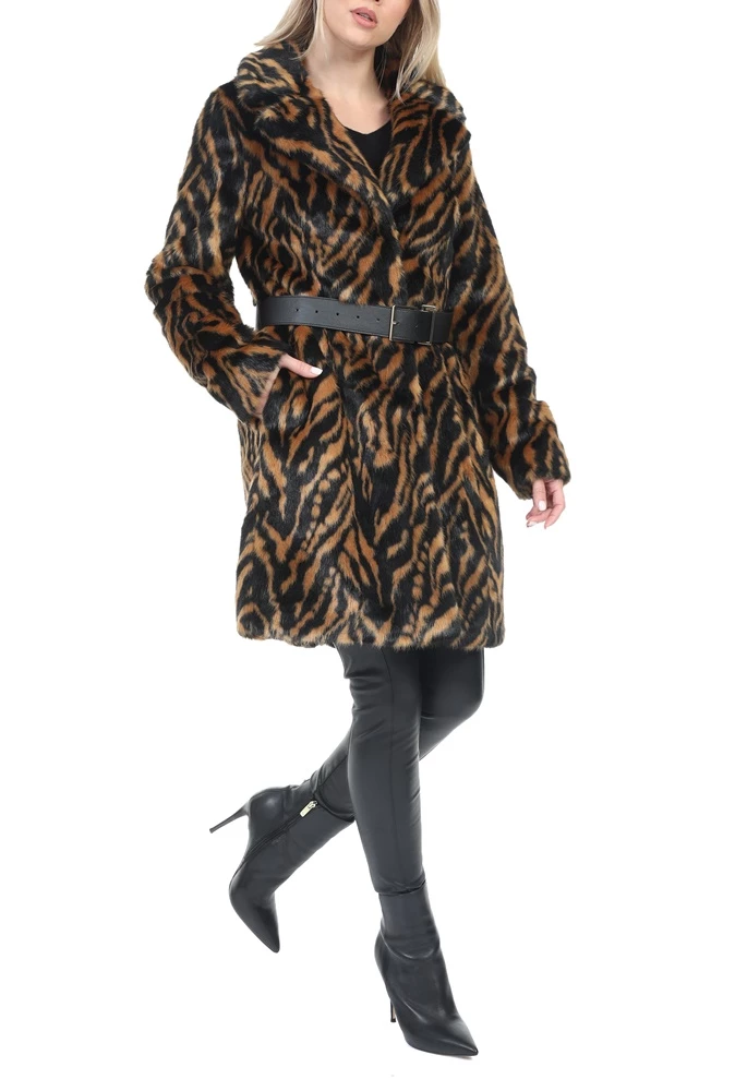 Γυναικείο παλτό KOCCA με καφέ και μαύρο animal print μοτίβο. Από συνθετική γούνα, σε ίσια γραμμή. Διαθέτει αφαιρούμενη δερμάτινη ζώνη με αγκράφα στη μέση και δύο τσέπες στα πλάγια. Κλείνει με κουμπιά μπροστά.